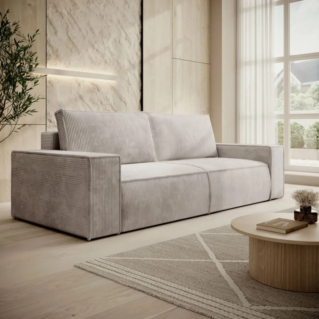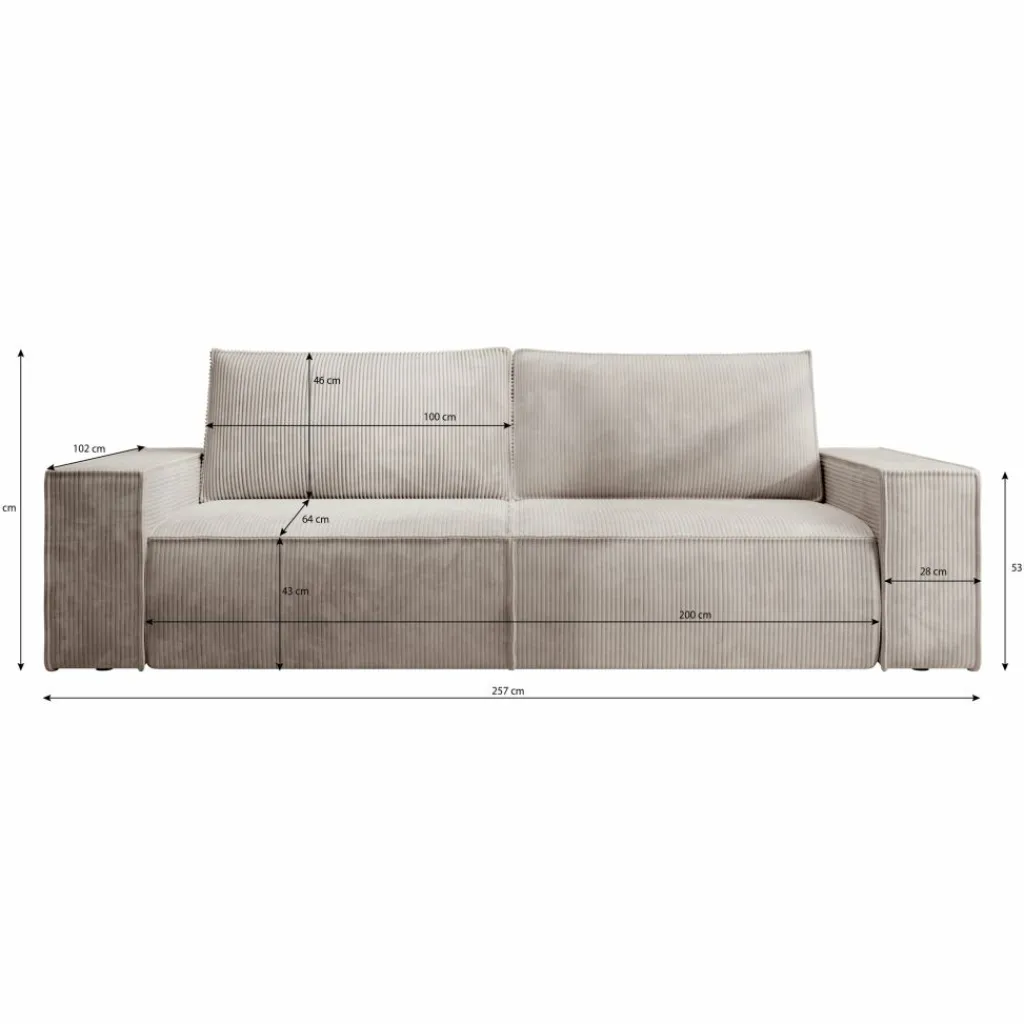 De zitting is stevig maar comfortabel, en wordt geleverd met twee grote rugkussens van dezelfde ribstof. Deze losse kussens bieden extra steun en flexibiliteit: je plaatst ze waar je ze nodig hebt of zet ze apart bij het slapen. De zithoogte van 43 cm en diepe zit van 64 cm zorgen voor een ontspannen zithouding.