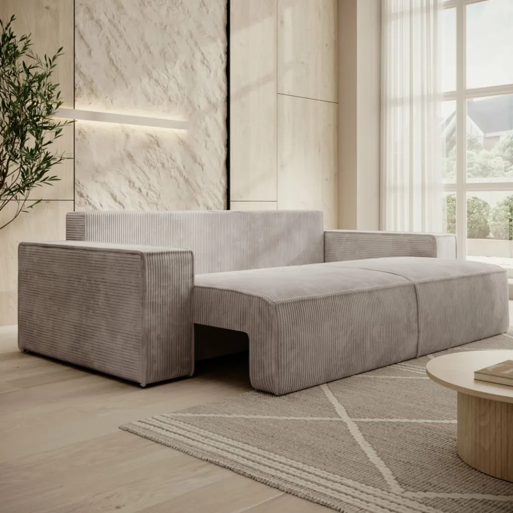 Dankzij de handige uitschuiffunctie is deze bank in een handomdraai te transformeren tot een comfortabele slaapbank. Uitgeklapt heeft het slaapgedeelte een afmeting van 200×136 cm – ruim genoeg voor twee personen. Ideaal als logeerbed of om zelf even languit te relaxen. Het liggedeelte sluit naadloos aan op het zitvlak, waardoor een vlak en stabiel oppervlak ontstaat.