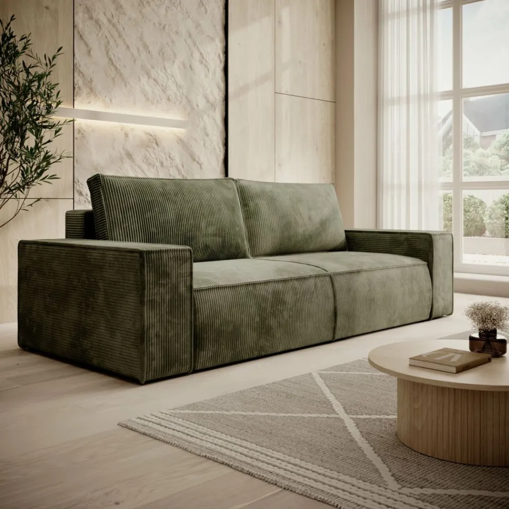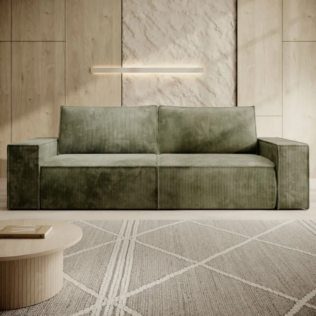 De Foster 3-zitsbank is een ruime bank met een duidelijke vormgeving en een stevige uitstraling. Met een breedte van 257 cm biedt dit model voldoende zitruimte voor meerdere personen en is hij geschikt voor grotere woonkamers. De groene ribstof geeft de bank een herkenbare structuur en een frisse, eigentijdse uitstraling die goed aansluit bij interieurs waarin textuur en kleur een rol spelen.