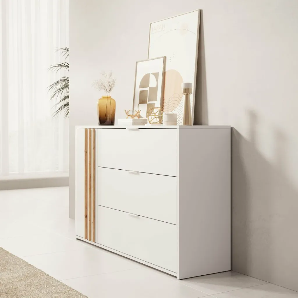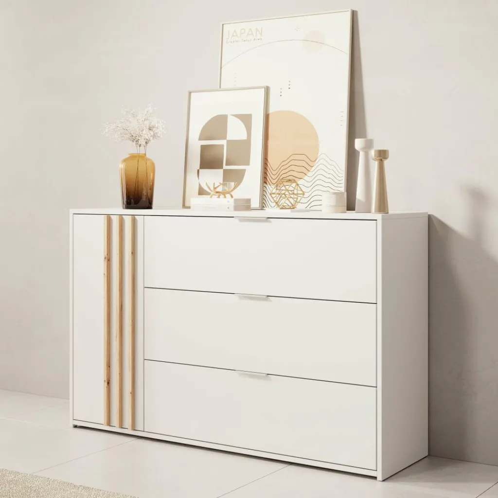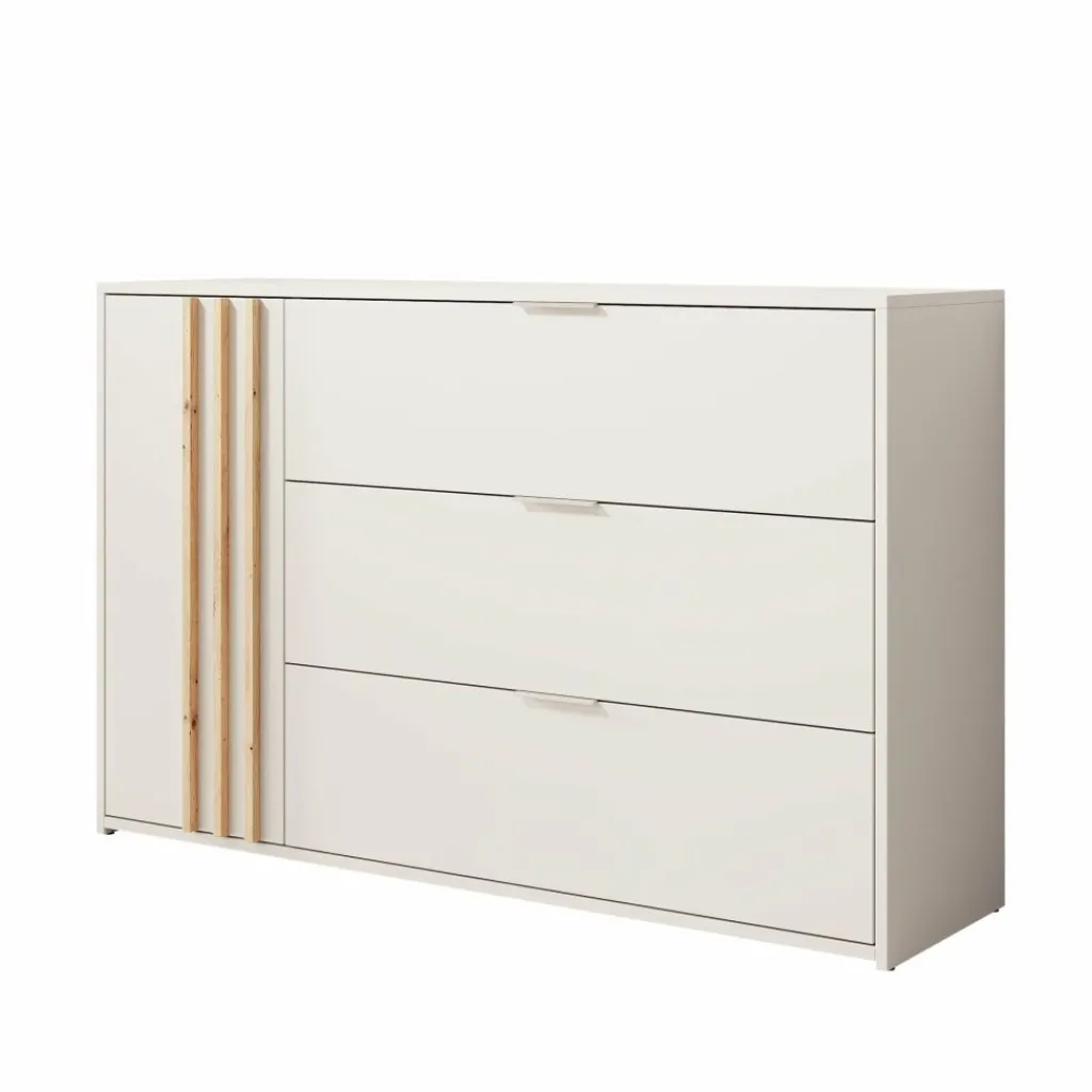 Dressoir Franklin is een opbergkast in een moderne stijl. De kast beschikt over 1 greeploze deur waarachter 2 opbergvakken zitten. Deze deur heeft op de voorkant 3 latjes. Hiernaast zitten 3 lades die openen met zilverkleurige handgrepen. Het meubel is uitgevoerd in de kleur wit.