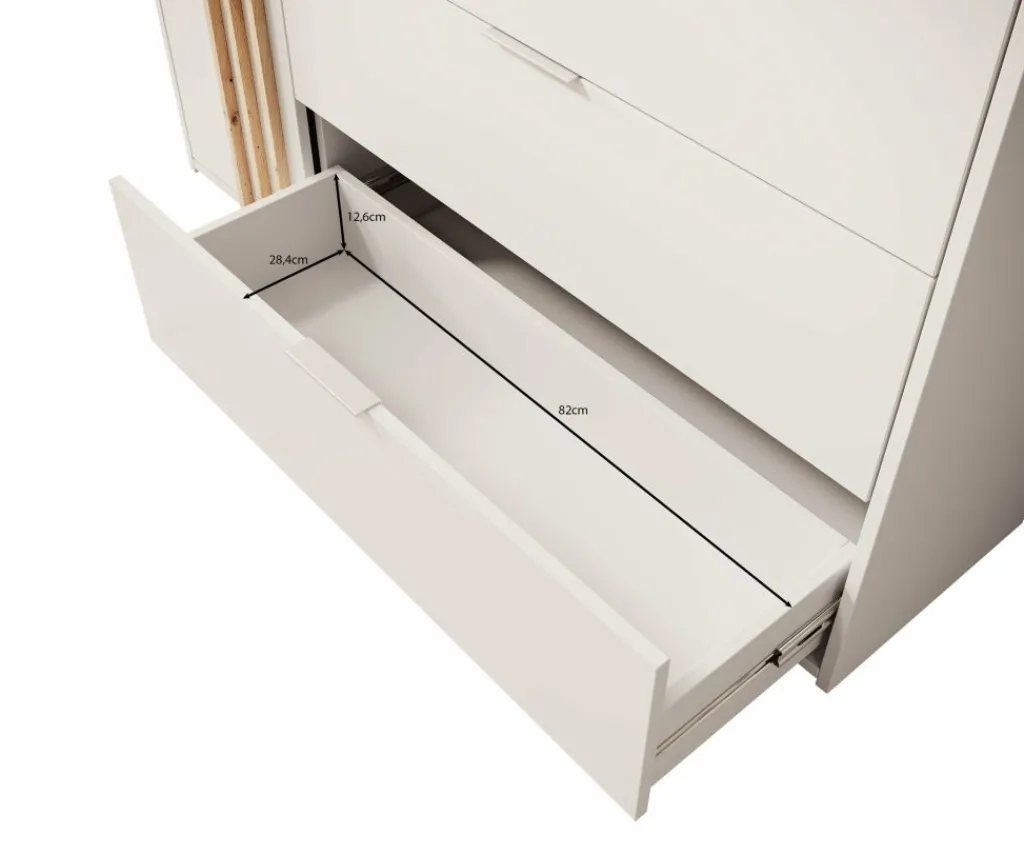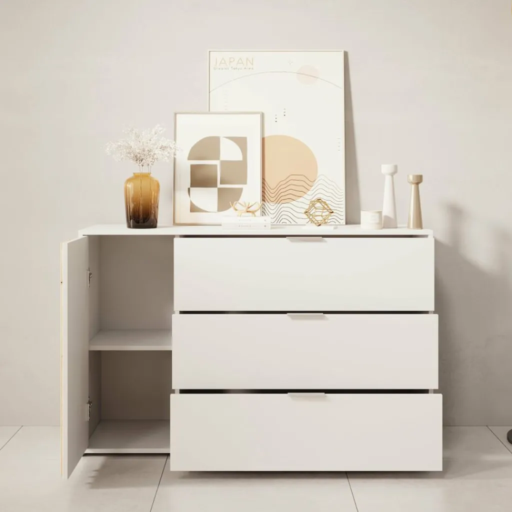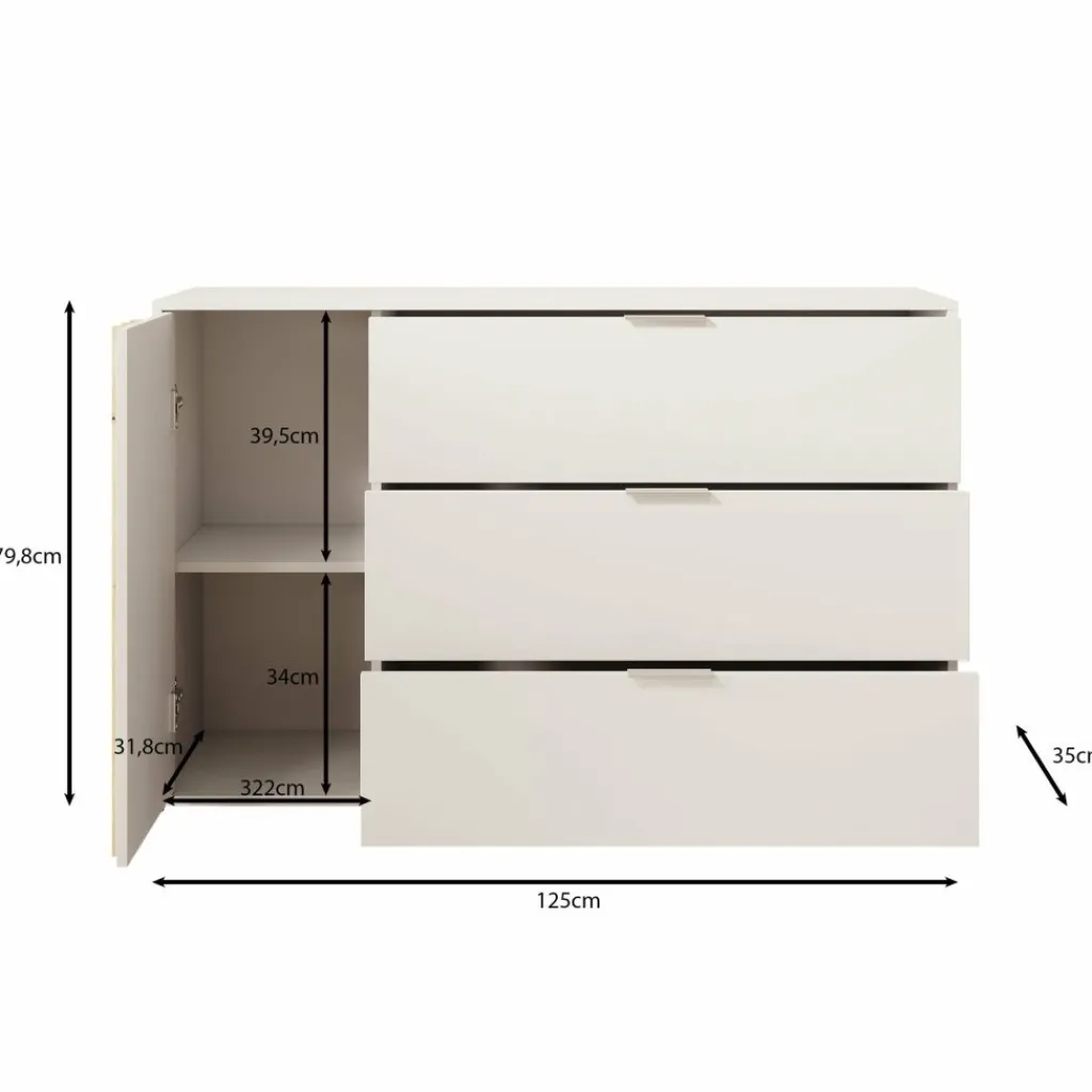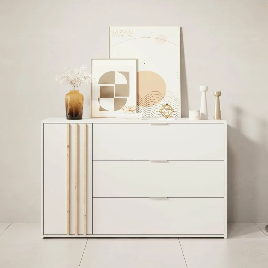 Dressoir Franklin is een opbergkast in een moderne stijl. De kast beschikt over 1 greeploze deur waarachter 2 opbergvakken zitten. Deze deur heeft op de voorkant 3 latjes. Hiernaast zitten 3 lades die openen met zilverkleurige handgrepen. Het meubel is uitgevoerd in de kleur wit.