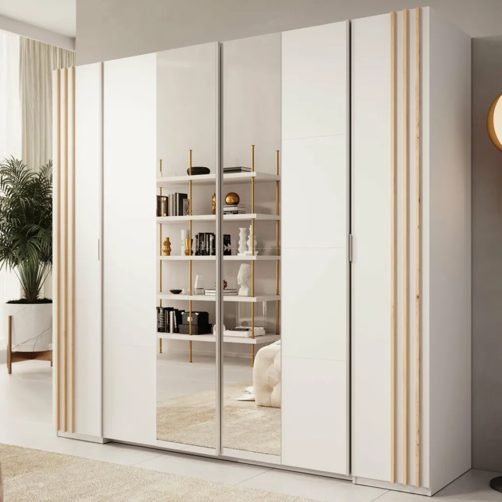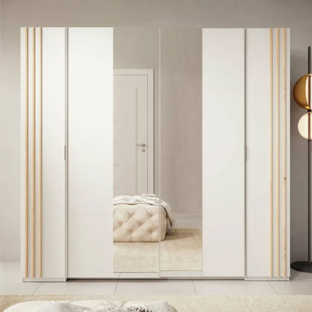 Kledingkast Franklin is een royale garderobekast. De kast is uitgevoerd in een frisse, witte kleur en afgewerkt met stijlvolle verticale houtaccenten aan de zijkanten. De combinatie van schuifdeuren en scharnierdeuren geeft dit model een moderne en luxe uitstraling. De twee middelste deuren zijn voorzien van spiegels, wat zorgt voor een ruimtelijk effect én extra gemak bij het aankleden.