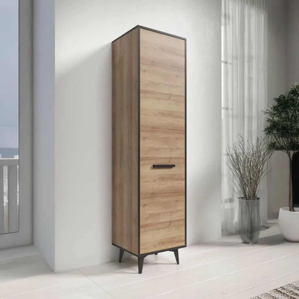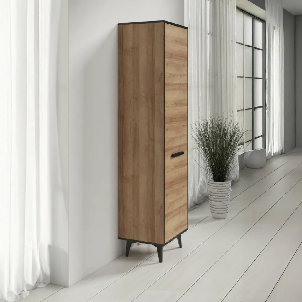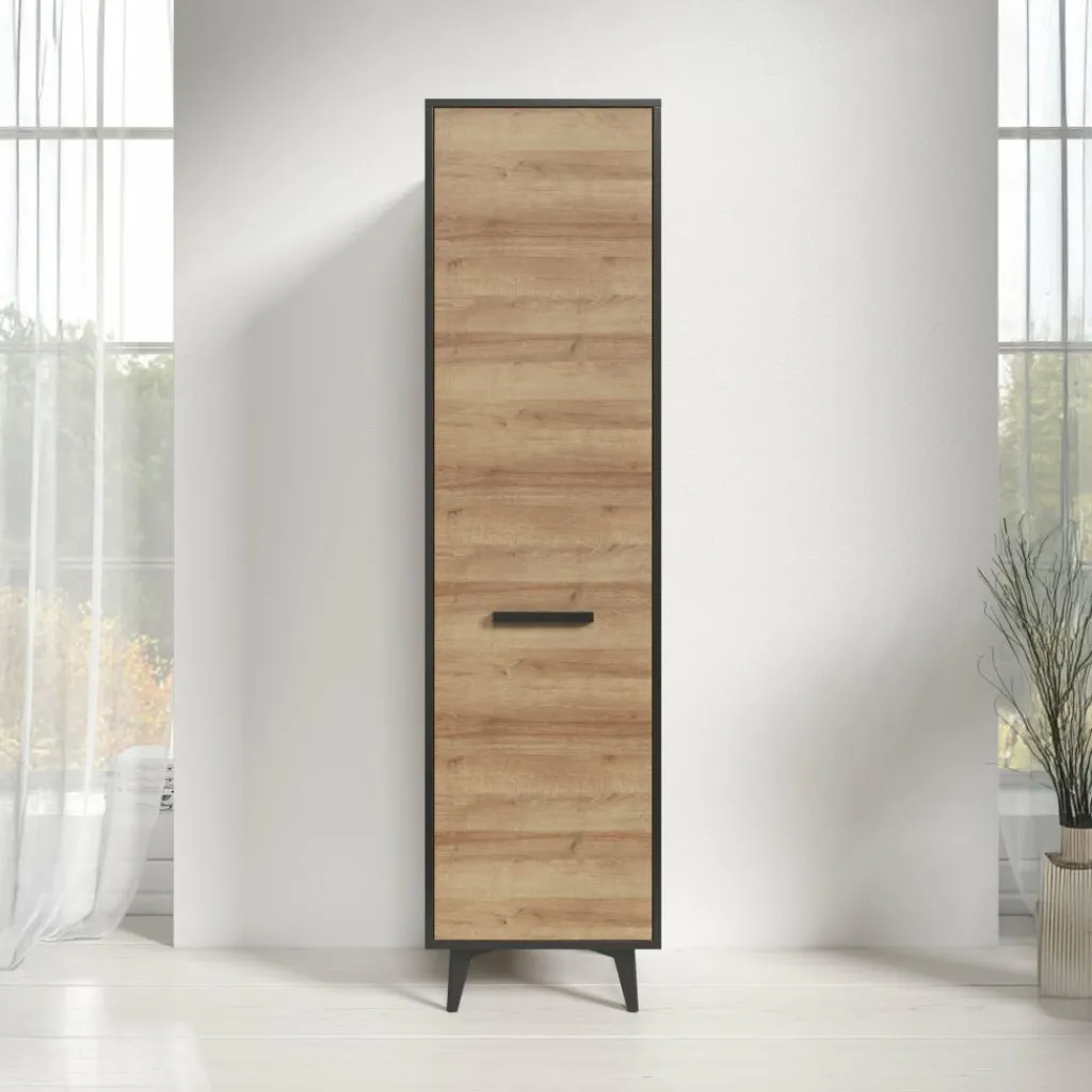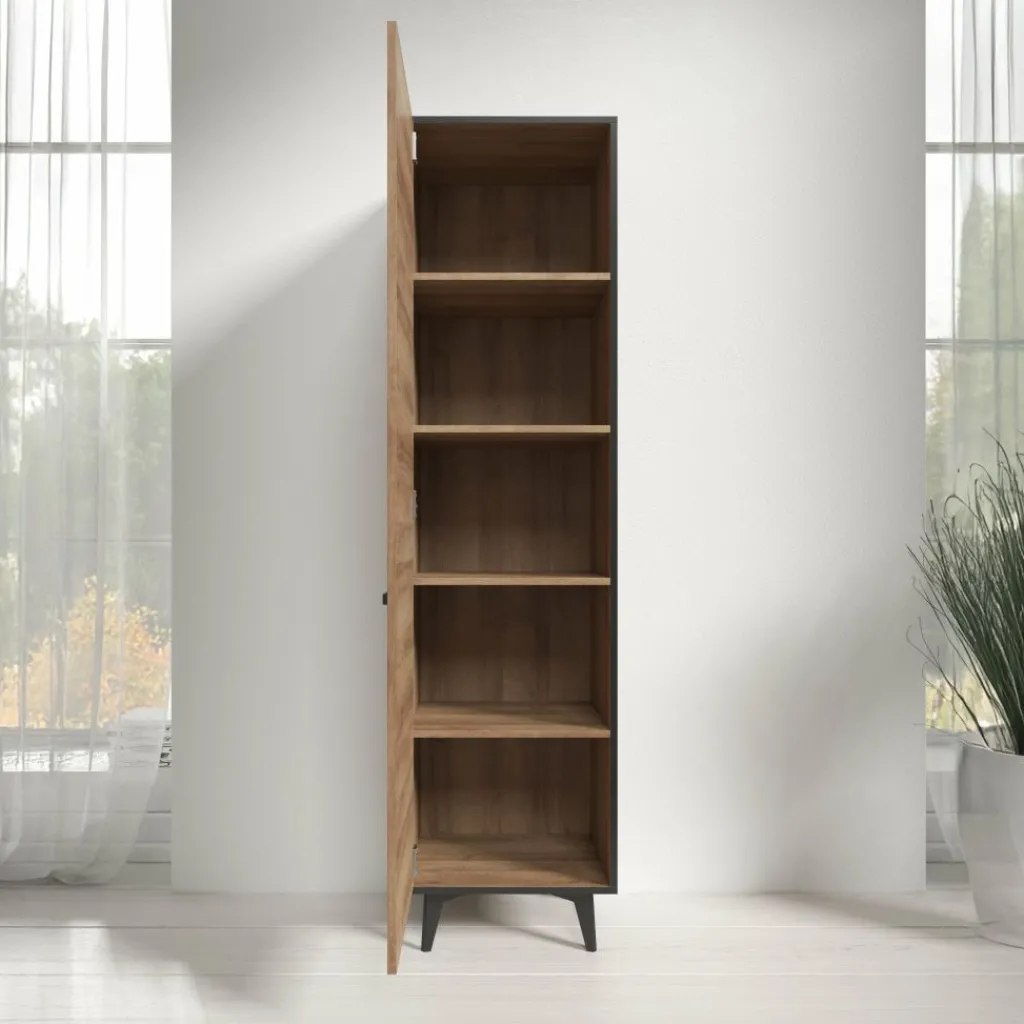De Frey vitrinekast combineert een strak design met praktische opbergruimte. Dankzij de warme licht eiken afwerking en het stoere zwarte metalen frame past deze kast perfect in een modern of industrieel interieur. De hoge, smalle vorm maakt hem ideaal voor kleinere ruimtes of als stijlvolle aanvulling op een grotere kastopstelling.