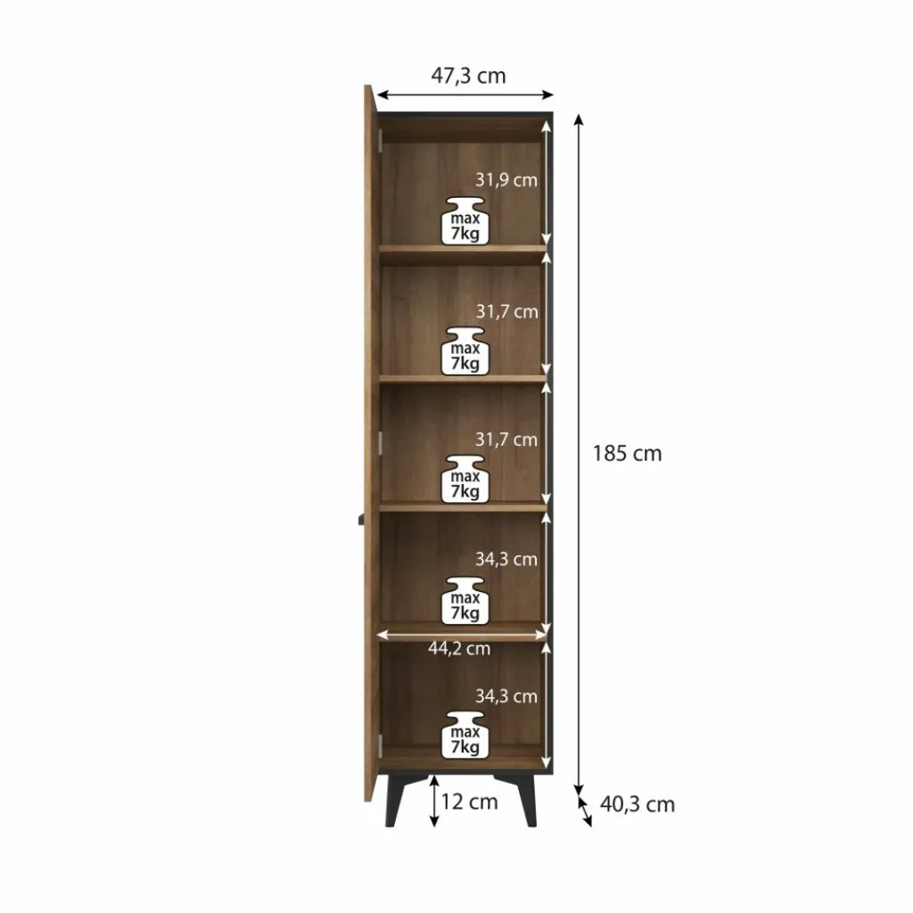 Achter de deur vind je meerdere legplanken waarop je servies, boeken of decoratie netjes kunt opbergen. De zwarte accenten en slanke poten geven de vitrinekast een luchtige uitstraling, terwijl de stevige constructie zorgt voor stabiliteit en duurzaamheid.