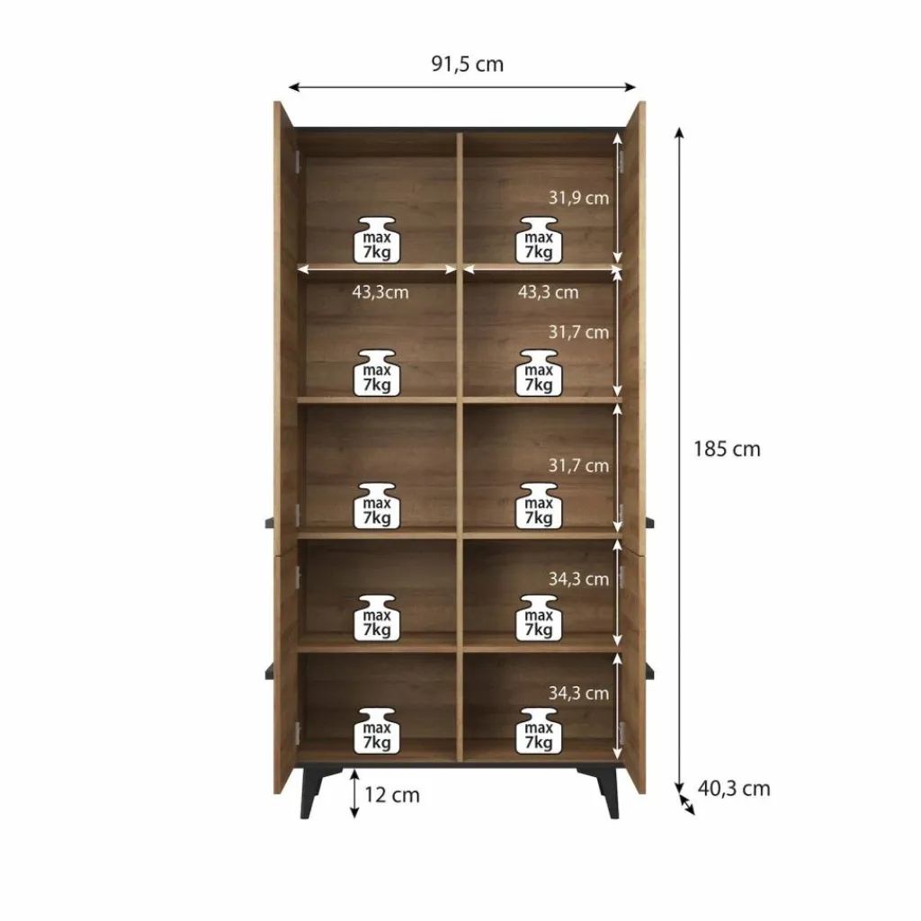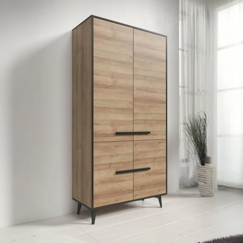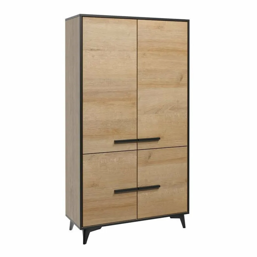 Kast Frey is een staande kast met ruime opbergmogelijkheden. De Frey is uitgevoerd in een licht eiken kleur met zwarte details. De kast beschikt over 4 grote deuren met daarachter maar liefst 10 open schappen.