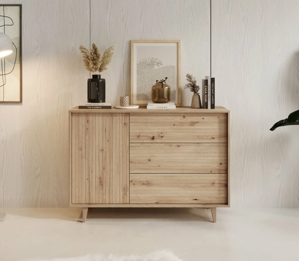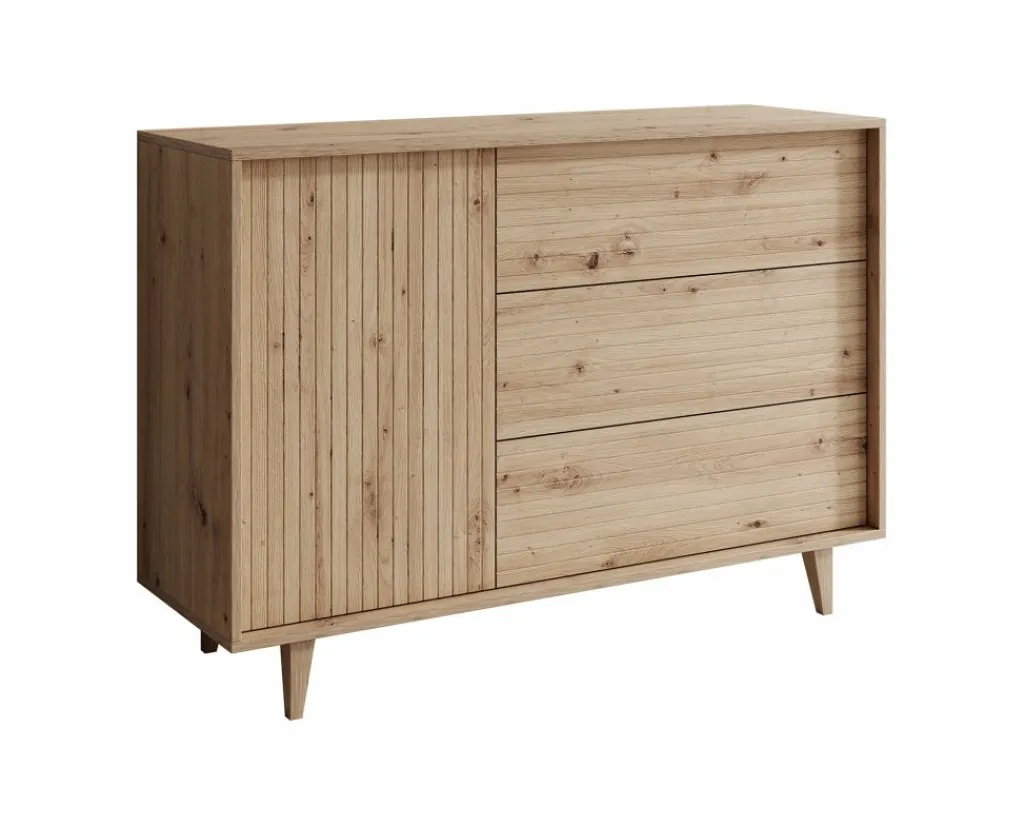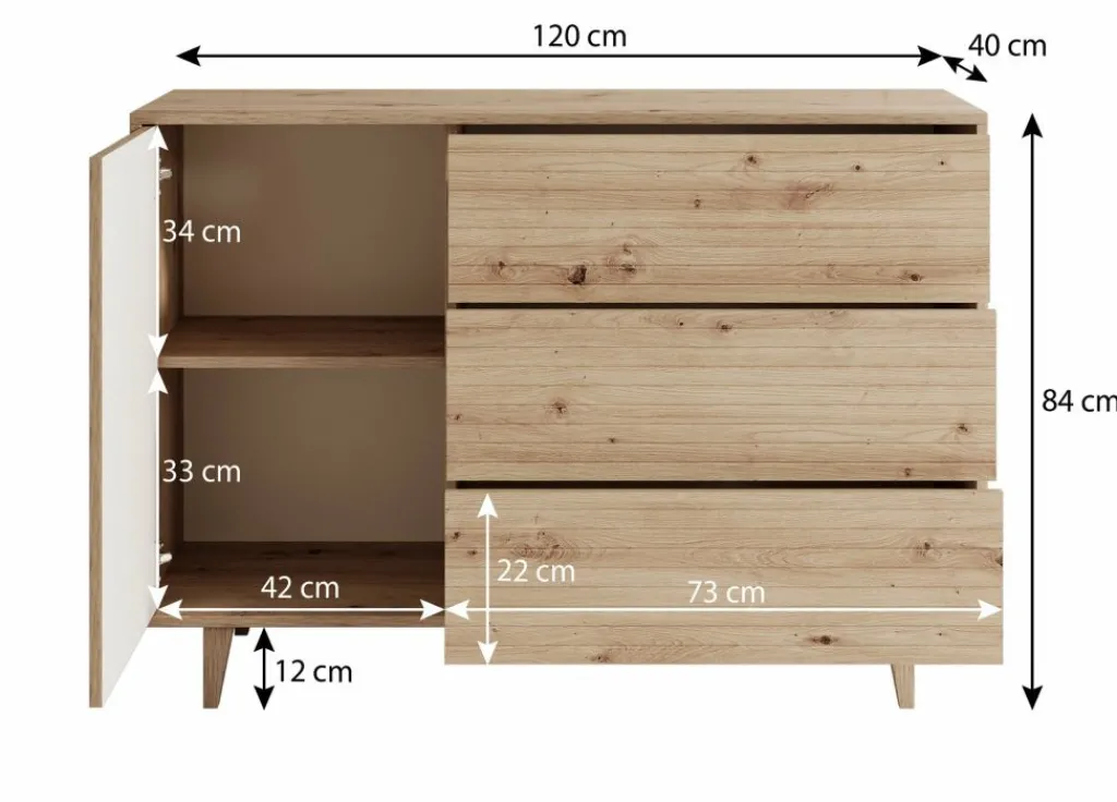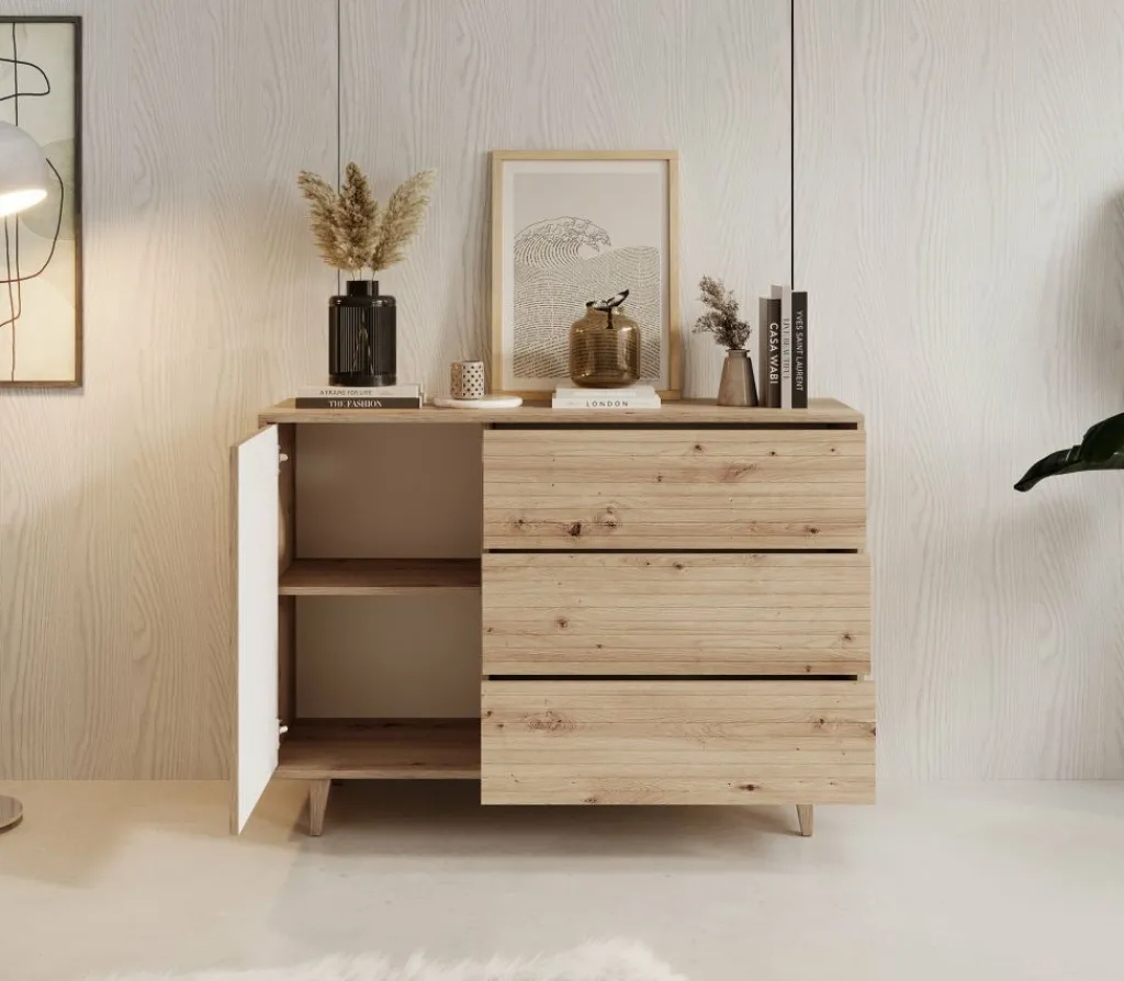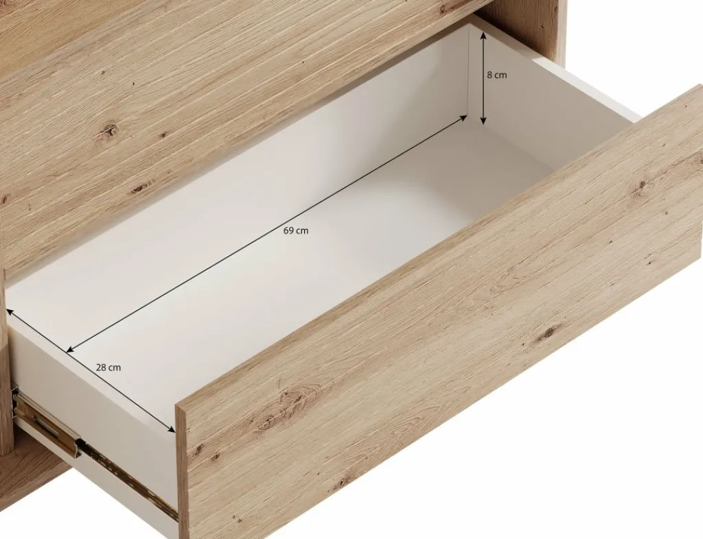 De kast heeft 3 lades en 1 deur. Deze zijn greeploos en beschikken over het push to open systeem. Achter de deur bevinden zich 2 opbergvakken.
