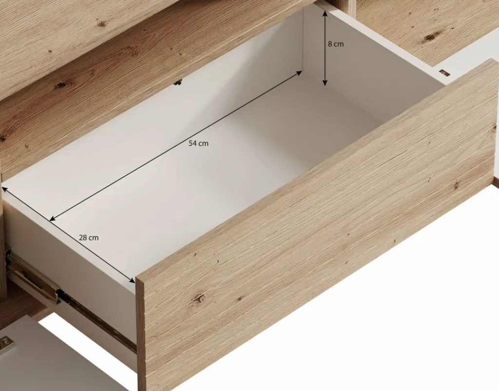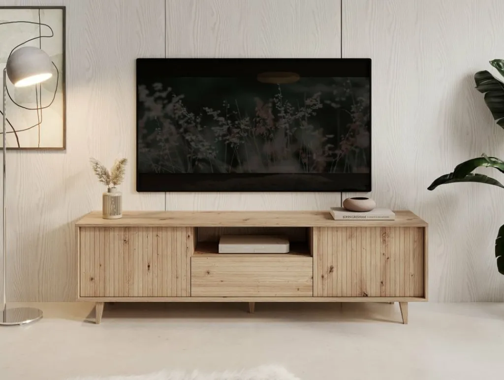 TV-Meubel Fuzeta is een modern tv-meubel in moderne, landelijke stijl. Het meubel is gemaakt van een stevige spaanplaat constructie in eiken kleur.