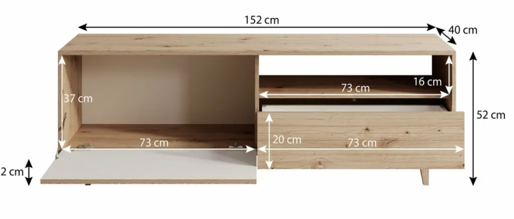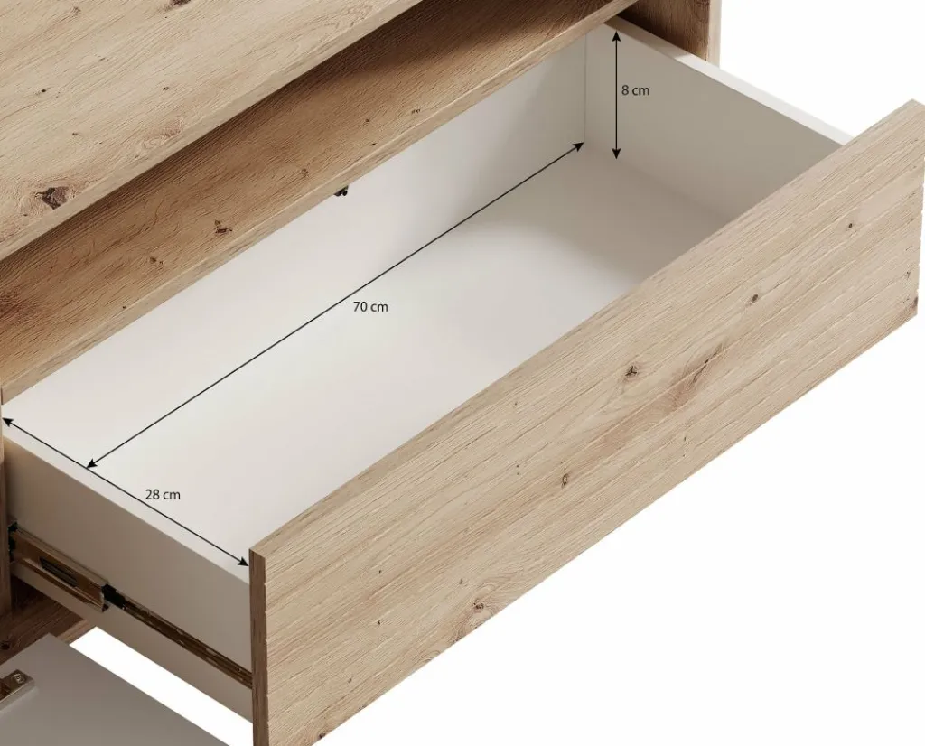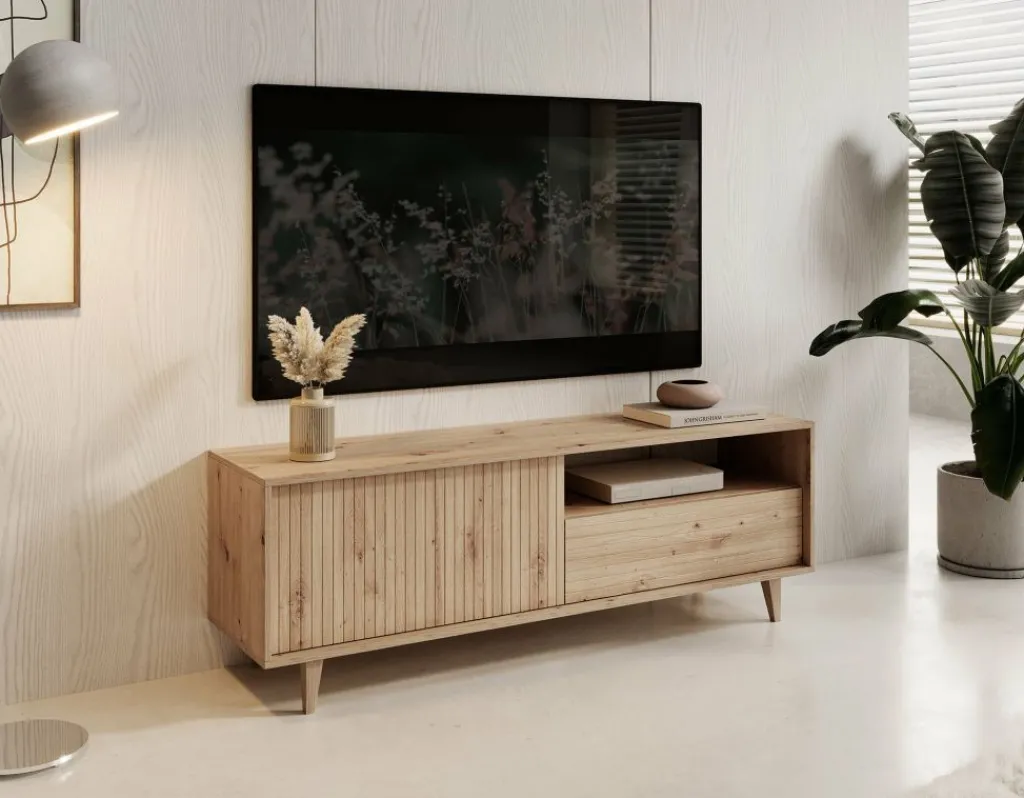 TV-Meubel Fuzeta is een modern tv-meubel in moderne, landelijke stijl. Het meubel is gemaakt van een stevige spaanplaat constructie in eiken kleur.