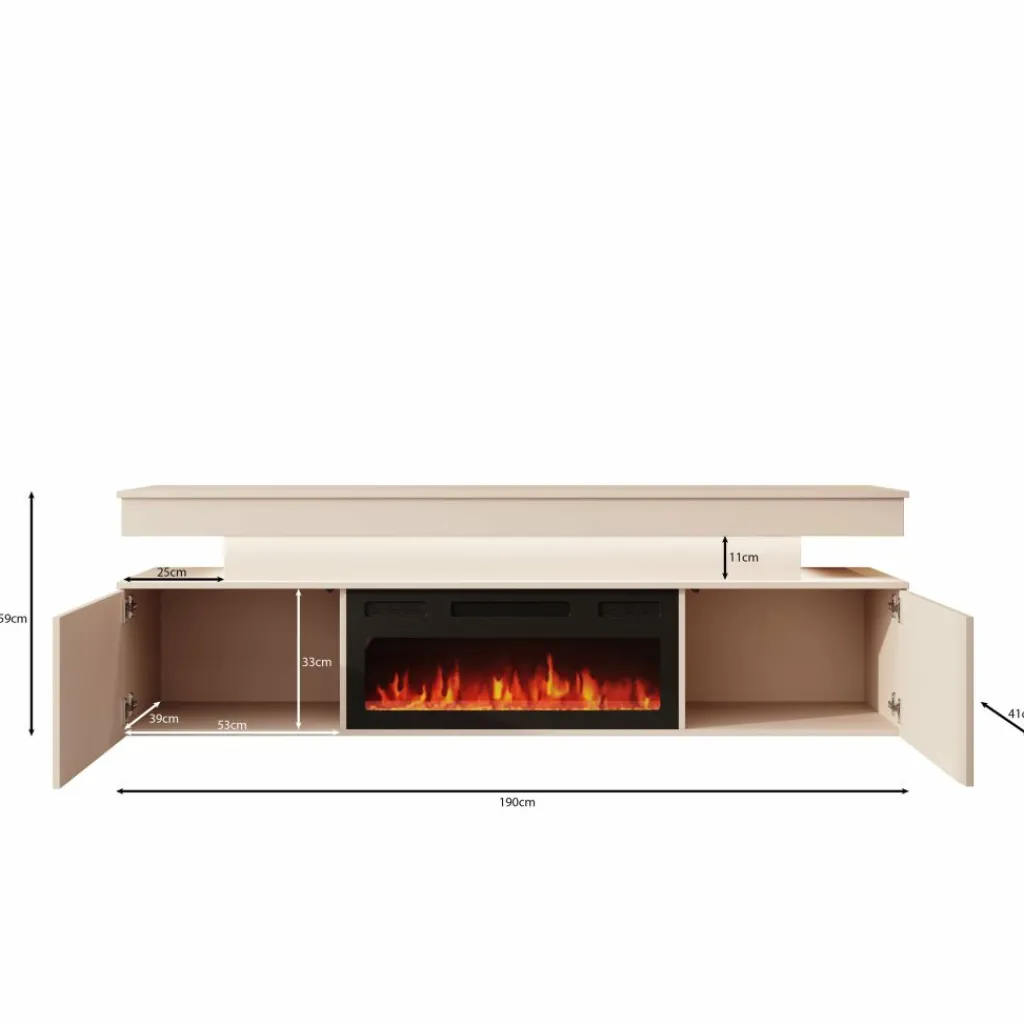 Het Galan TV-meubel met sfeerhaard is een breed tv-meubel in beige uitvoering met een afmeting van 190x39x54 cm. Het meubel is uitgevoerd als functioneel opbergmeubel met een geïntegreerde elektrische haard en is geschikt voor gebruik in de woonkamer.