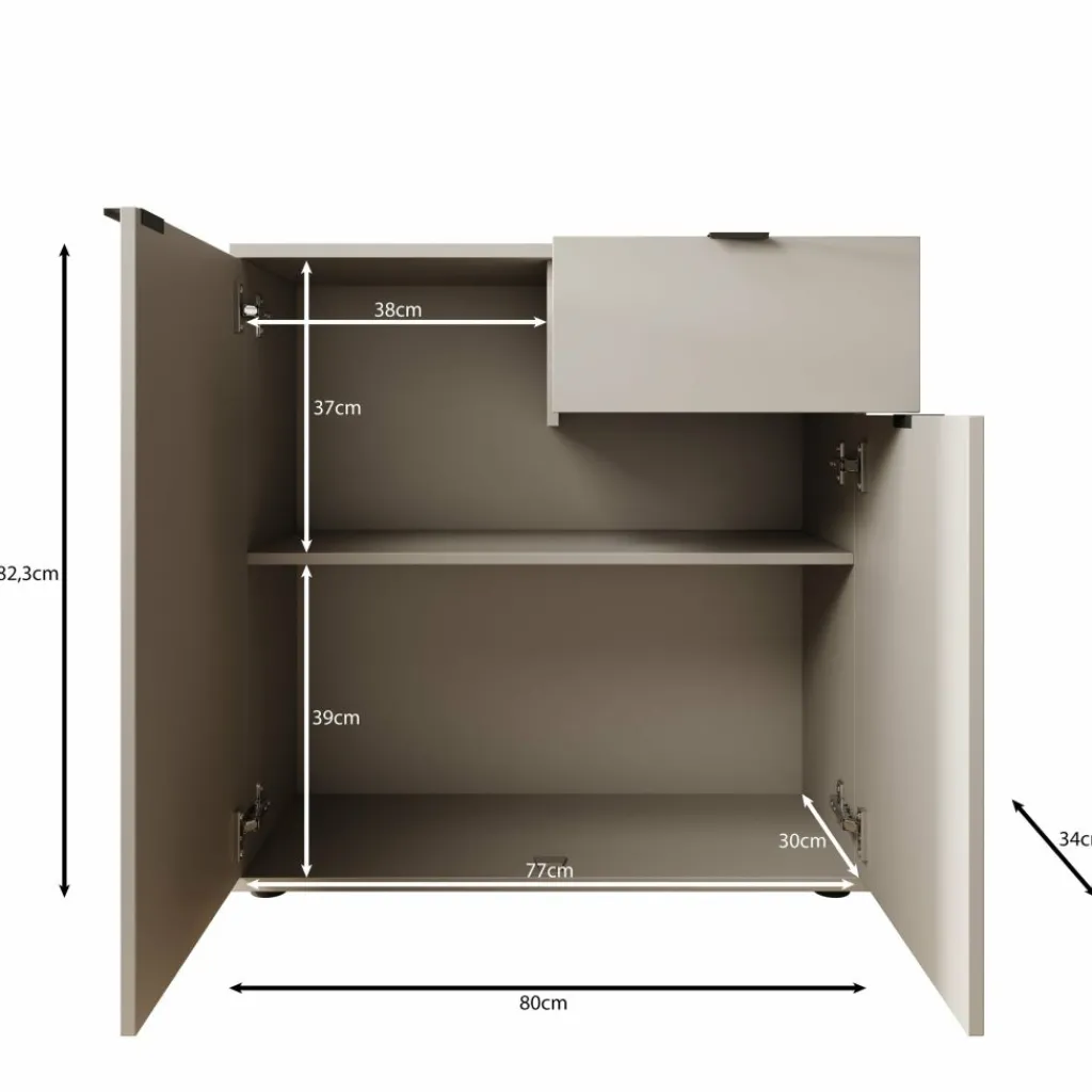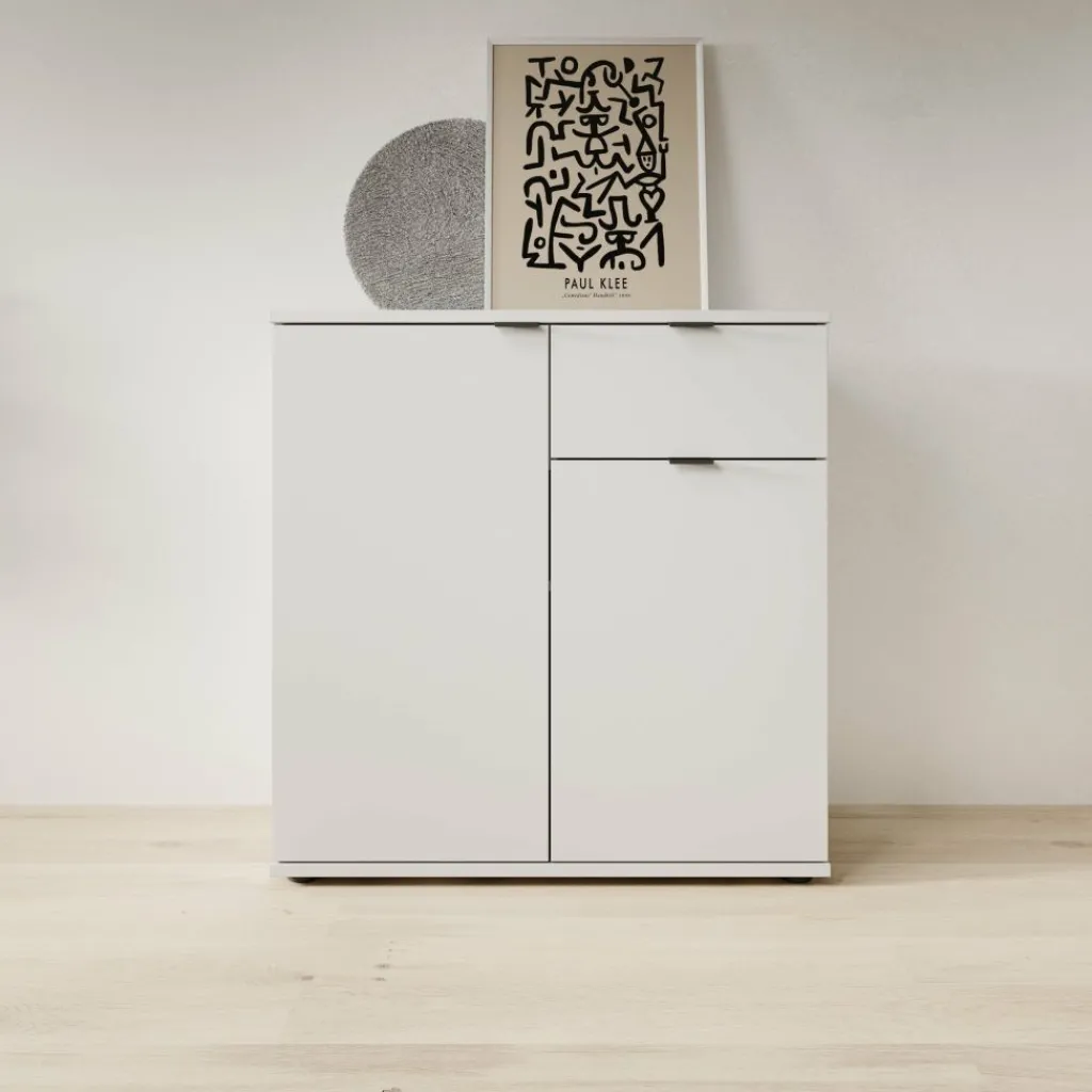 Het Galeno 2 dressoir in wit is een compact en functioneel meubel dat geschikt is voor verschillende ruimtes in huis, zoals de woonkamer, hal of eetkamer. Met een breedte van 80 cm, een diepte van 34 cm en een hoogte van 82 cm neemt het dressoir weinig ruimte in en biedt het tegelijk praktische opbergruimte.