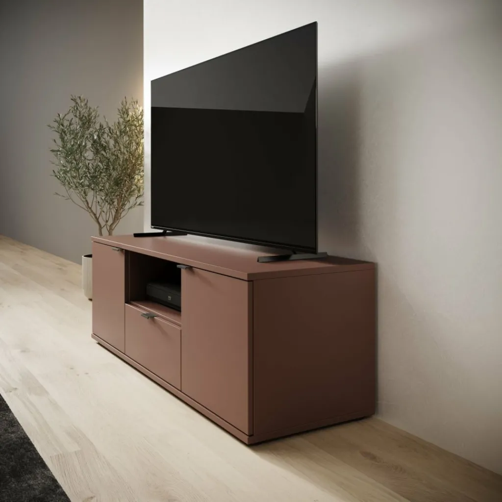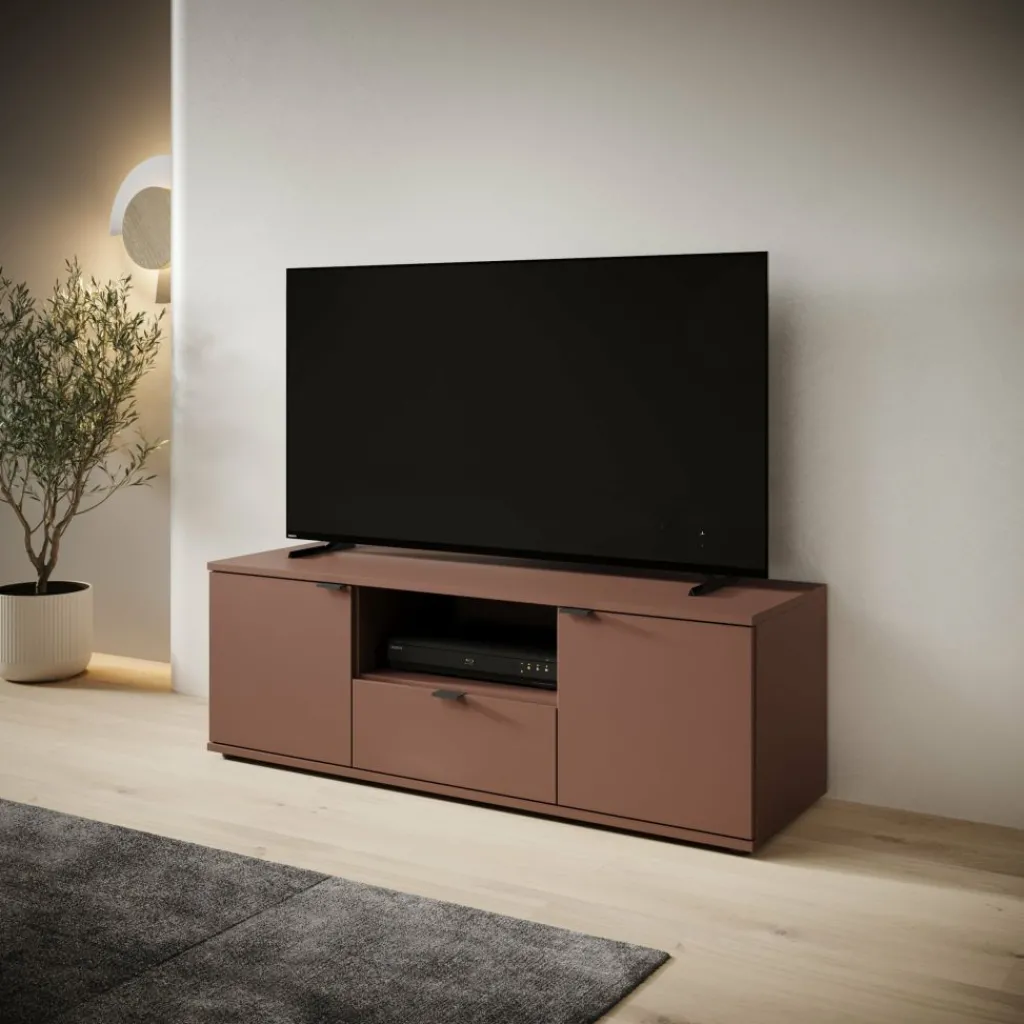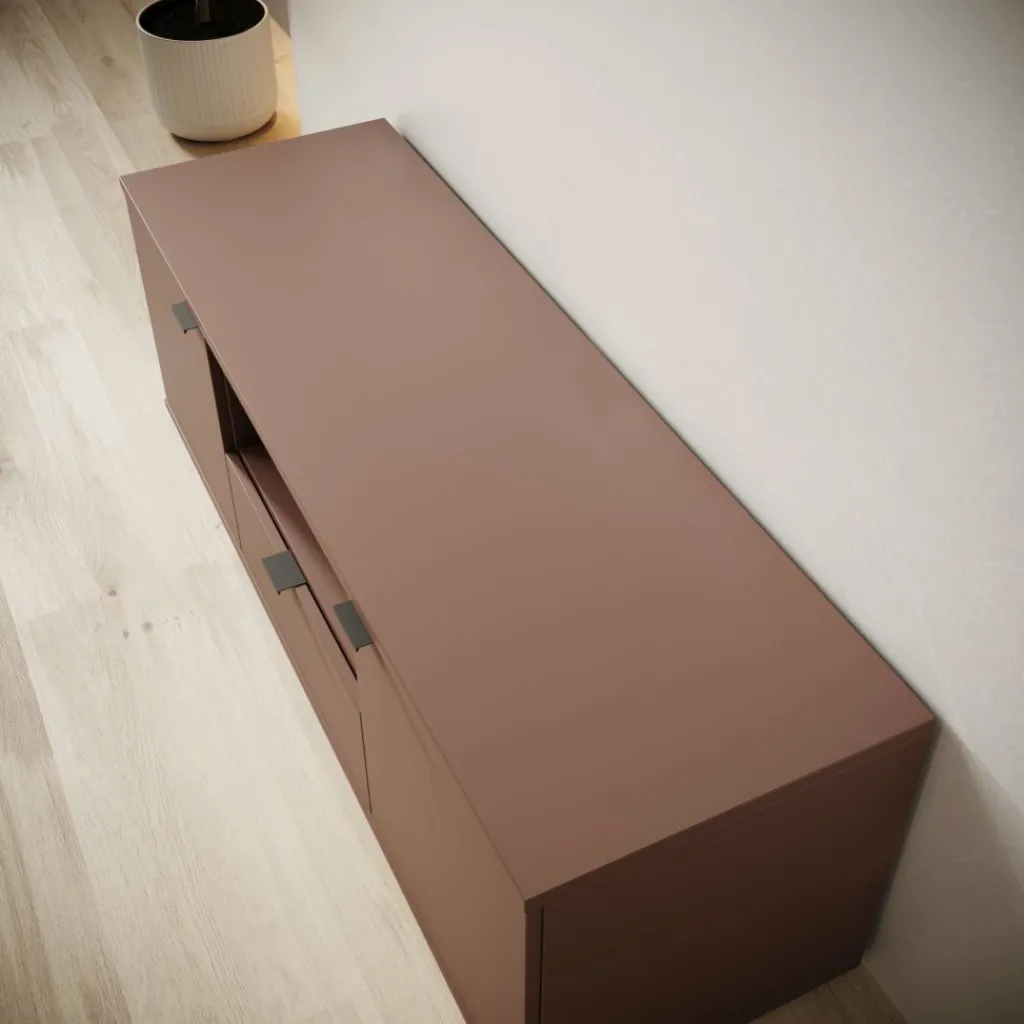 Het Galeno tv-meubel in oudroze heeft een rustige en strakke vormgeving en is praktisch ingedeeld voor dagelijks gebruik. Met zijn afmetingen van 130x41x44 cm biedt het meubel voldoende ruimte zonder veel plaats in te nemen. De combinatie van een open vak, een lade en afgesloten opbergruimte achter de deuren zorgt voor een logische indeling voor apparatuur en losse spullen. Het meubel heeft een maximaal draagvermogen van 40 kg. Het open vak kan belast worden tot 8 kg en de lade tot maximaal 5 kg, wat geschikt is voor lichte accessoires en elektronica.