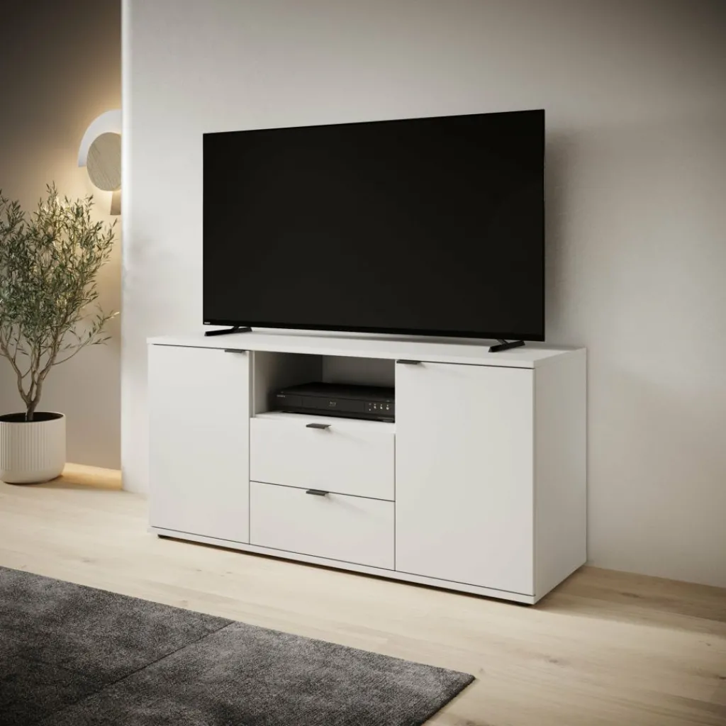 Achter de twee deuren bevinden zich legplanken voor het opbergen van spullen. In het midden is ruimte voor apparatuur, gecombineerd met twee lades voor kleinere items. Alles blijft zo netjes georganiseerd. Het bovenblad heeft een maximaal draagvermogen van 40 kg en is geschikt voor gangbare televisies.