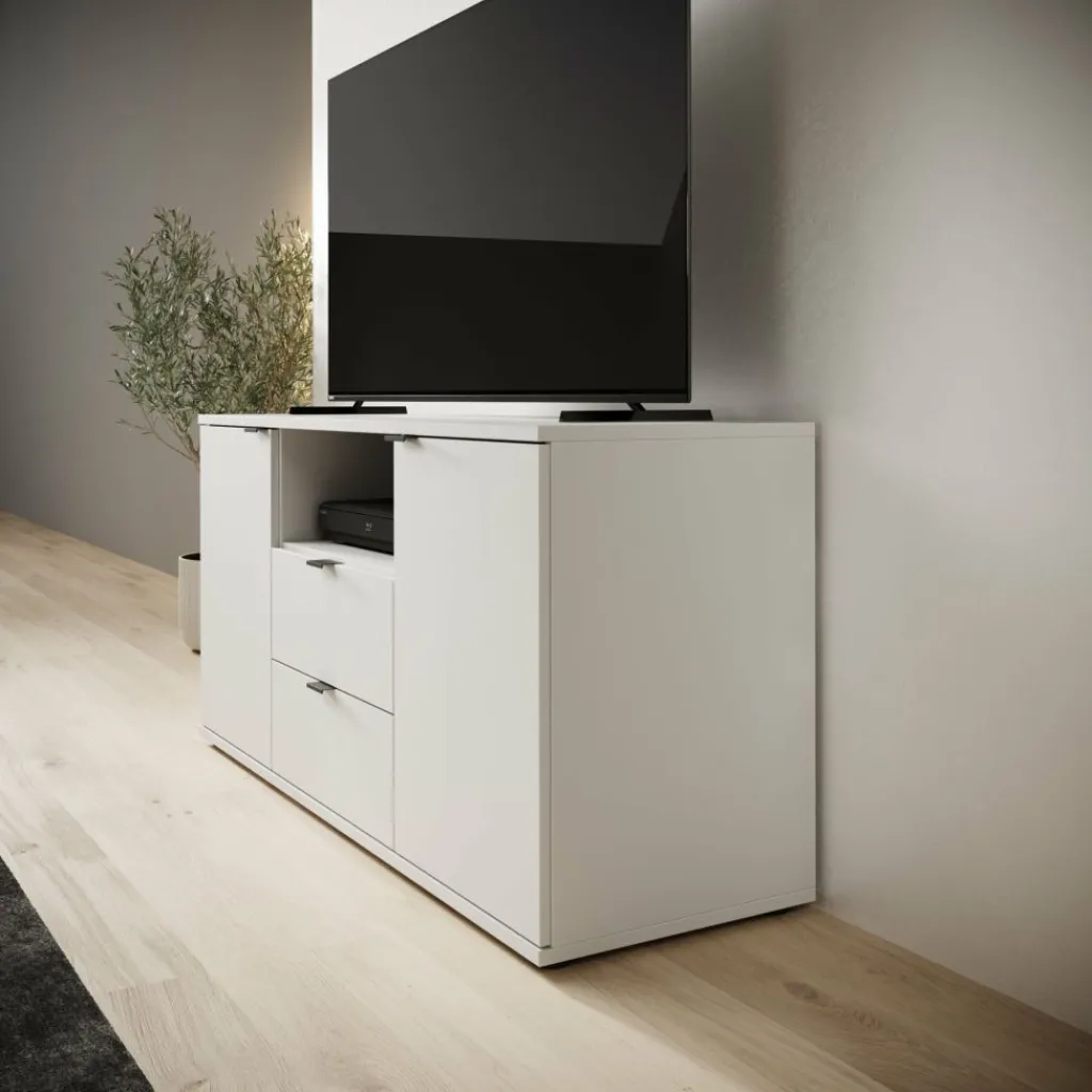Galeno is een overzichtelijk tv-meubel met een strak ontwerp en een praktische indeling. Dit witte model heeft een breedte van 130 cm en biedt ruimte voor zowel je televisie als diverse accessoires en apparatuur.