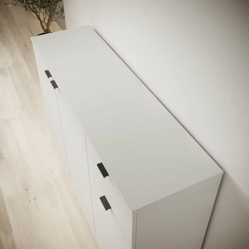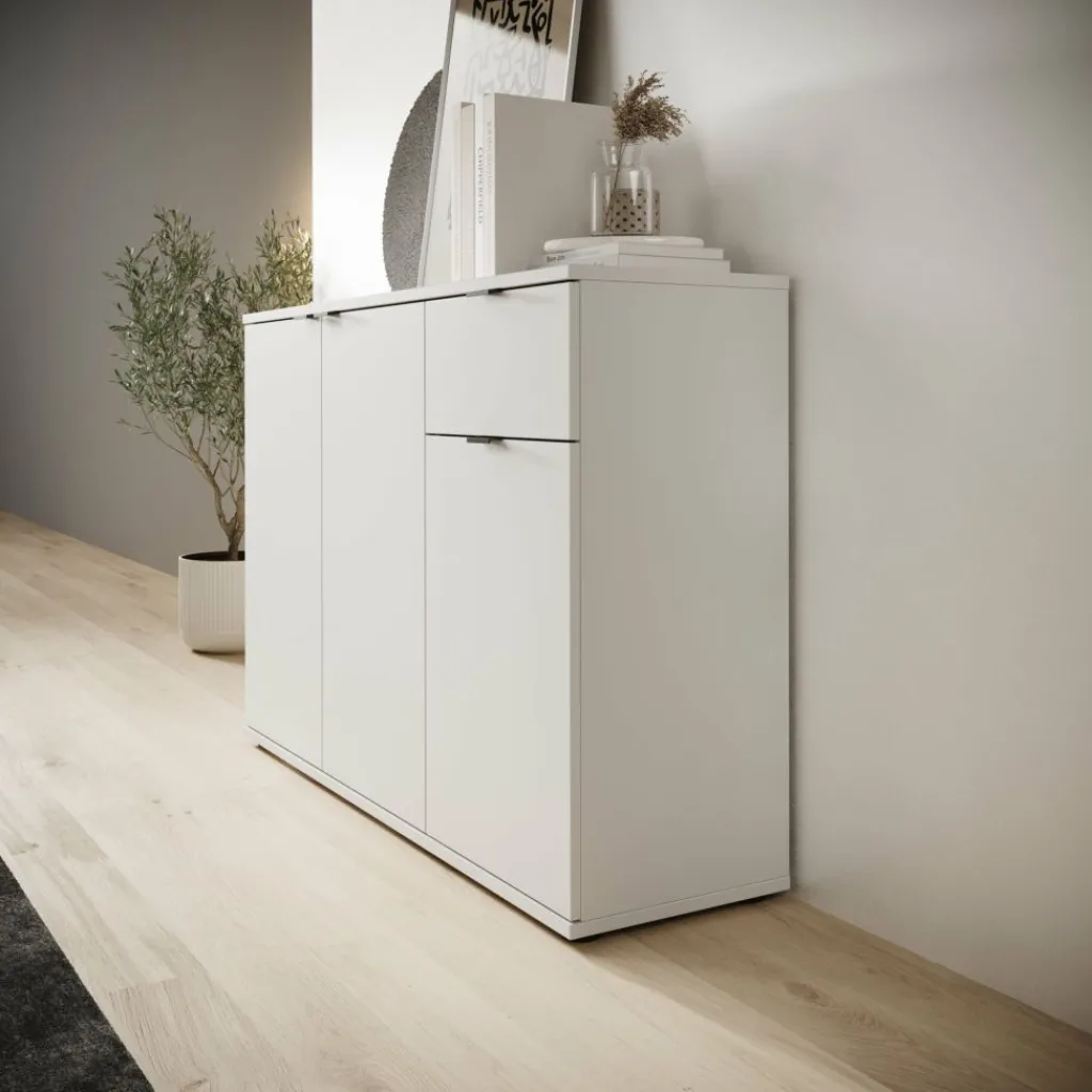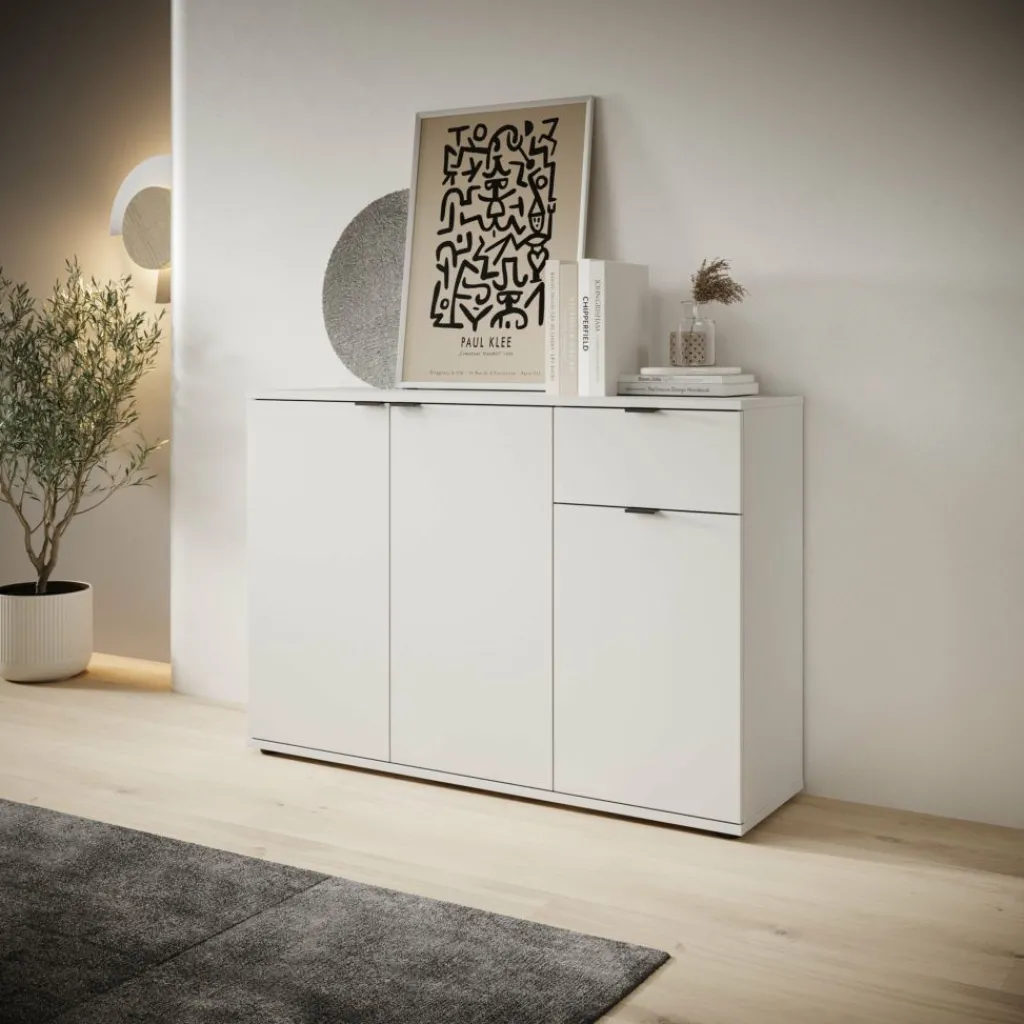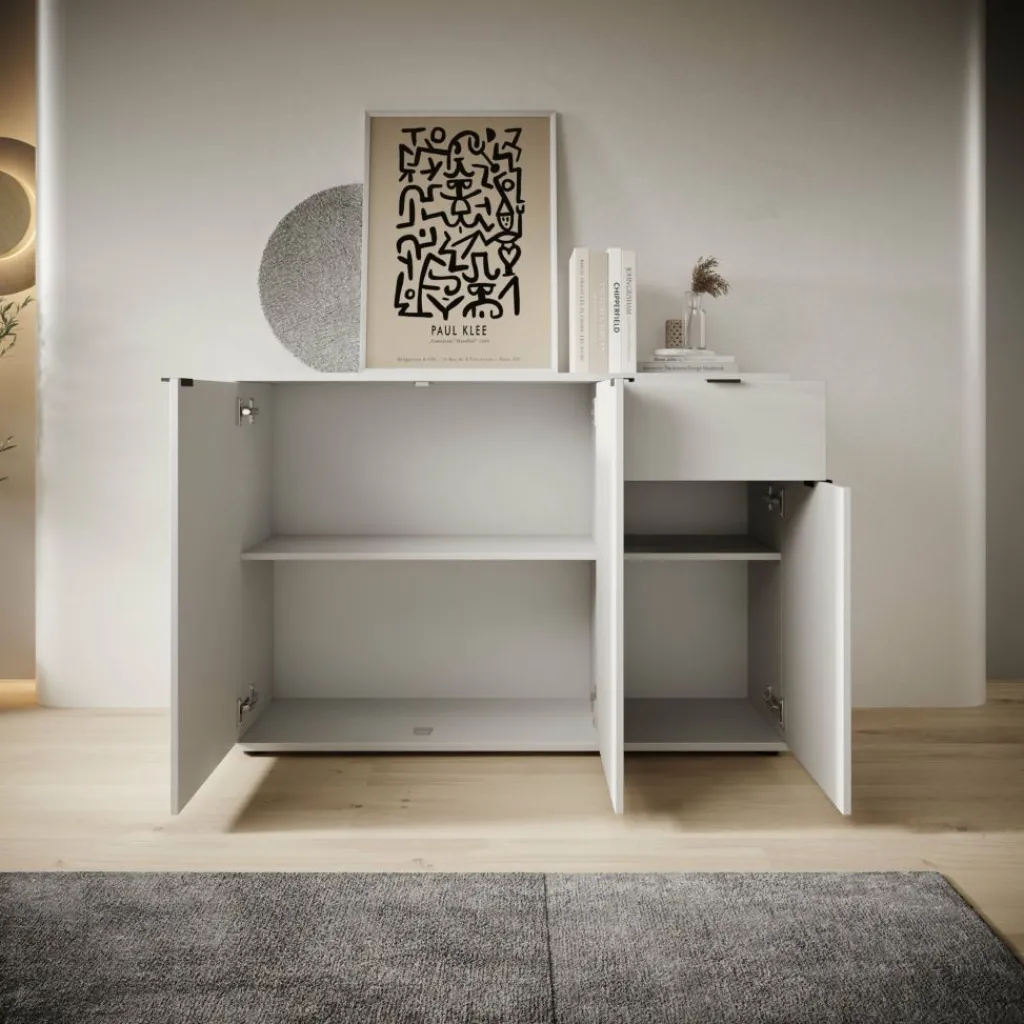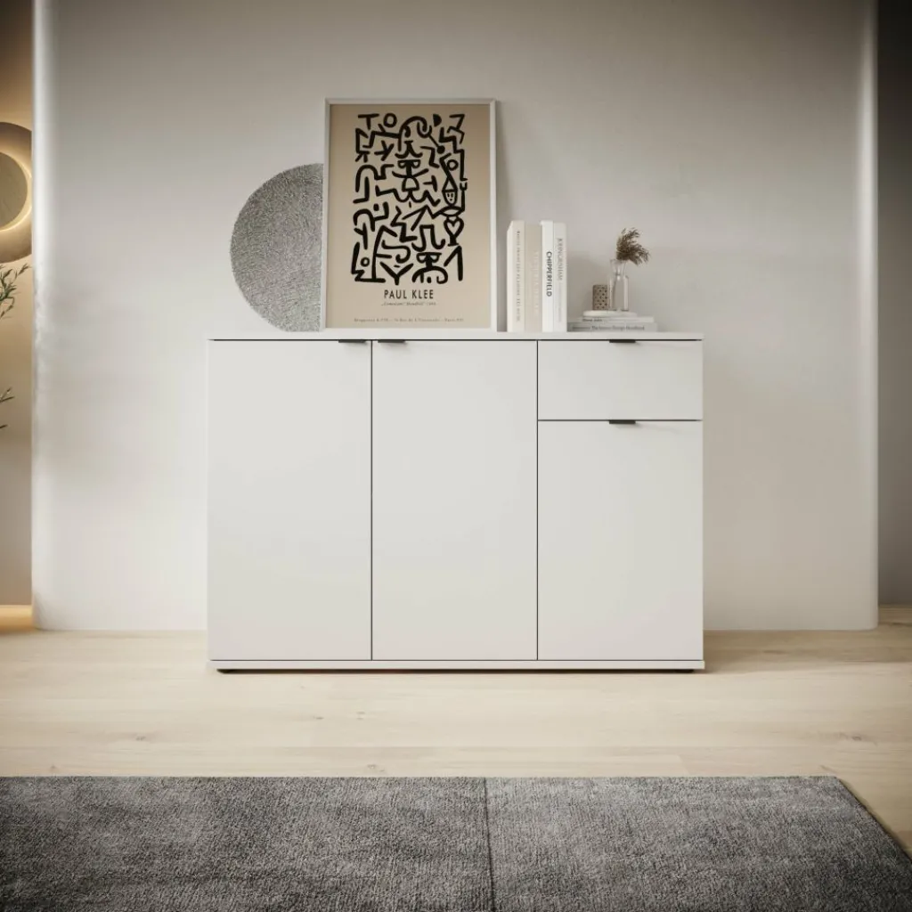 Het Galeno dressoir in wit is een functioneel meubel met een strak en overzichtelijk ontwerp. Met een breedte van 120 cm en een diepte van 34 cm biedt dit dressoir voldoende opbergruimte zonder veel vloeroppervlak in te nemen, waardoor het geschikt is voor woonkamers, eetkamers of een hal.