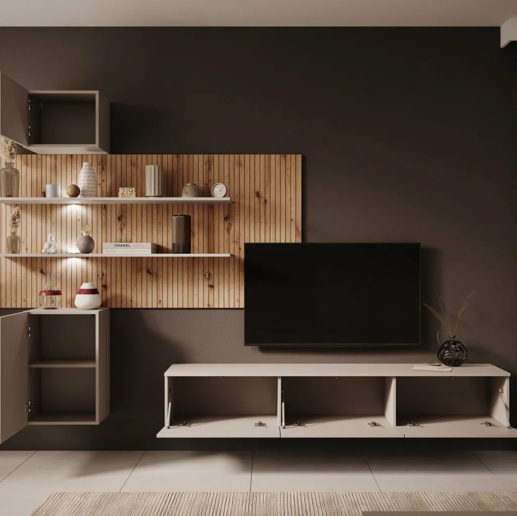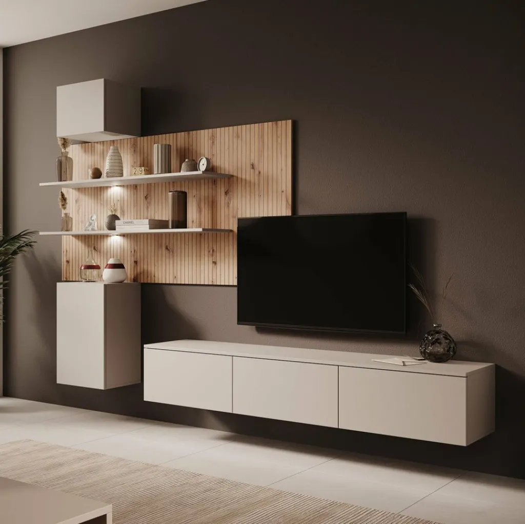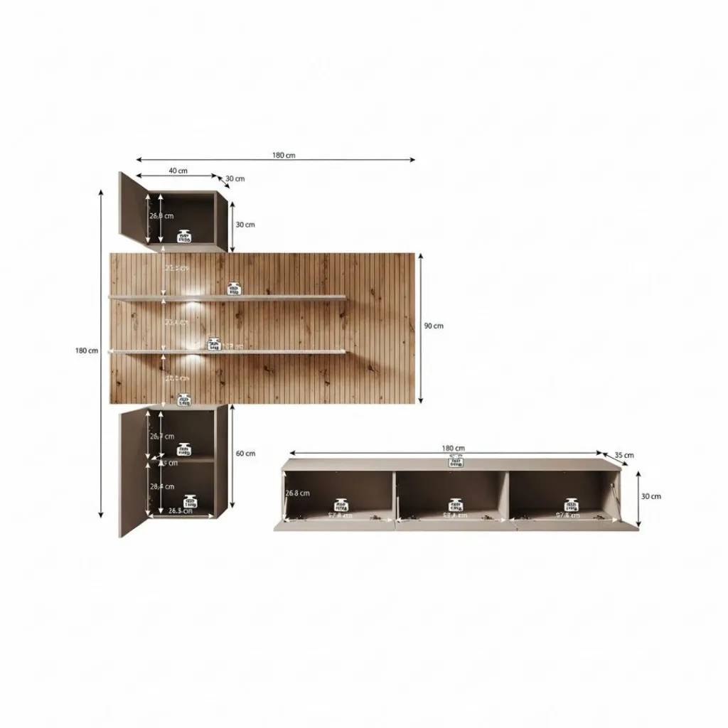 De tv kast beschikt over 3 kleppen en beide kastjes hebben 1 deur. Deze kleppen en deuren openen met het push to open systeem. De bijgeleverde witte LED-verlichting maakt het meubel helemaal compleet.