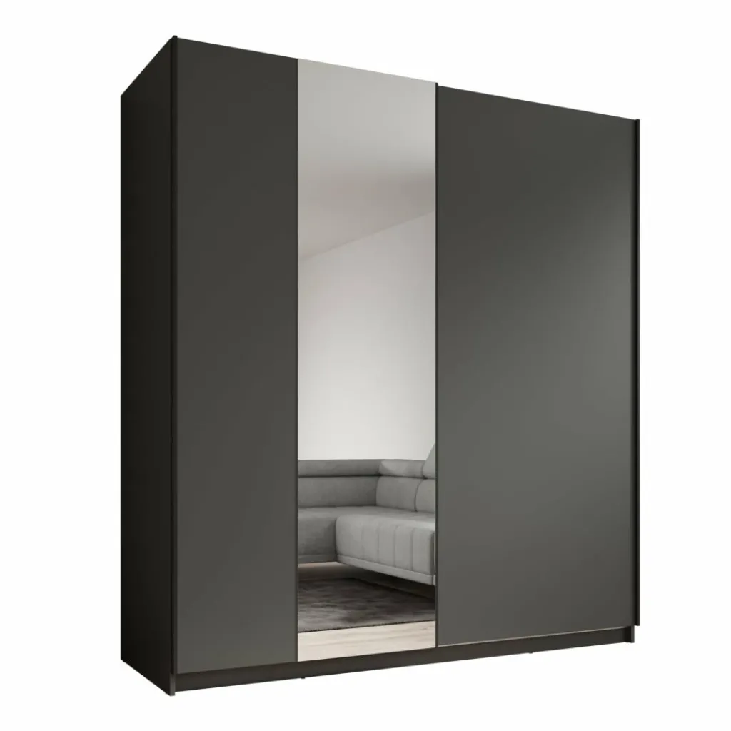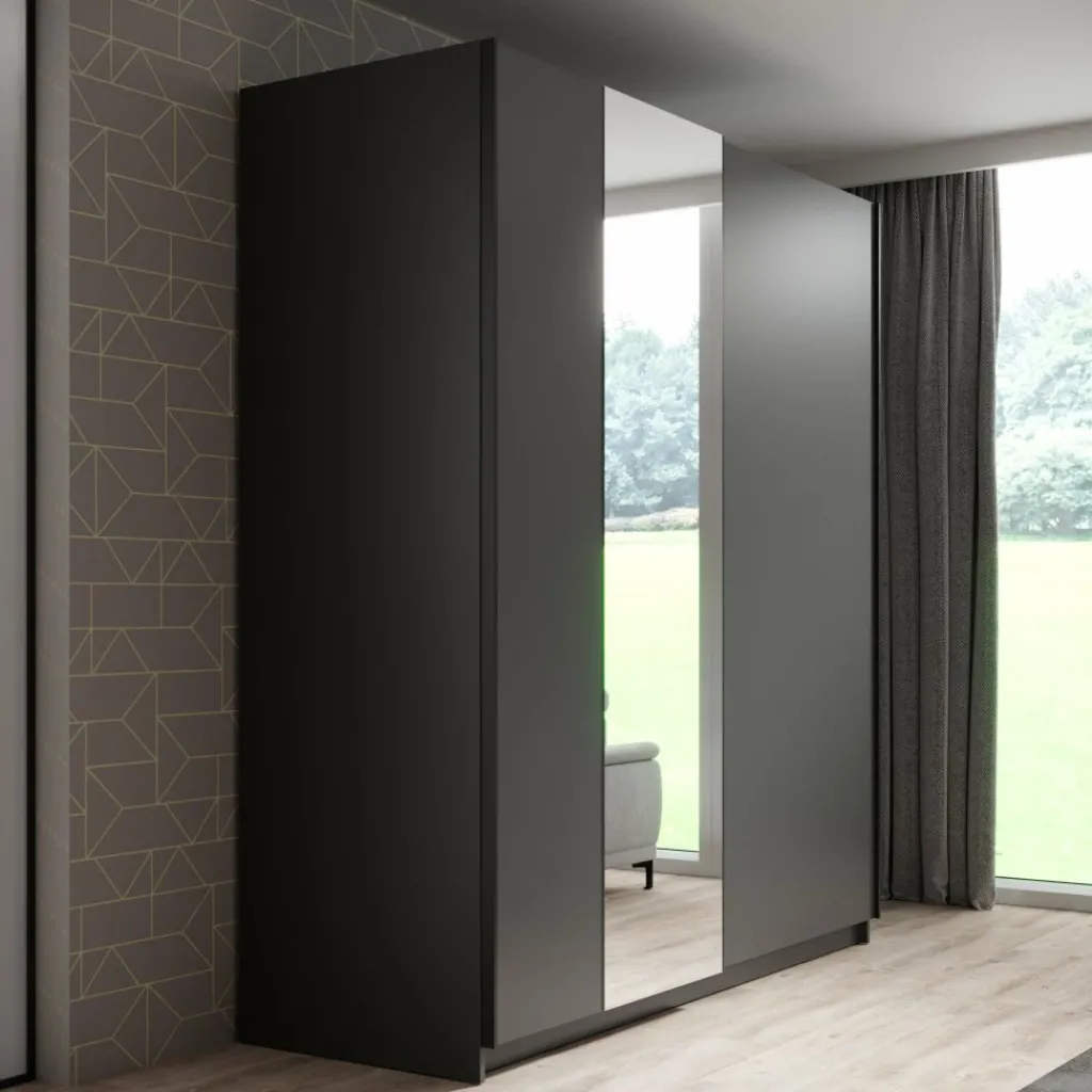 De kast is uitgerust met schuifdeuren, waarvan één voorzien is van een grote spiegel – handig voor het aankleden én optisch vergrotend voor de ruimte. Achter de deuren vind je een ruime indeling met een hanggedeelte (met roede), vier legplanken en een bovenplank over de volledige breedte. Dankzij deze opstelling is er volop ruimte voor zowel hang- als vouwkleding.