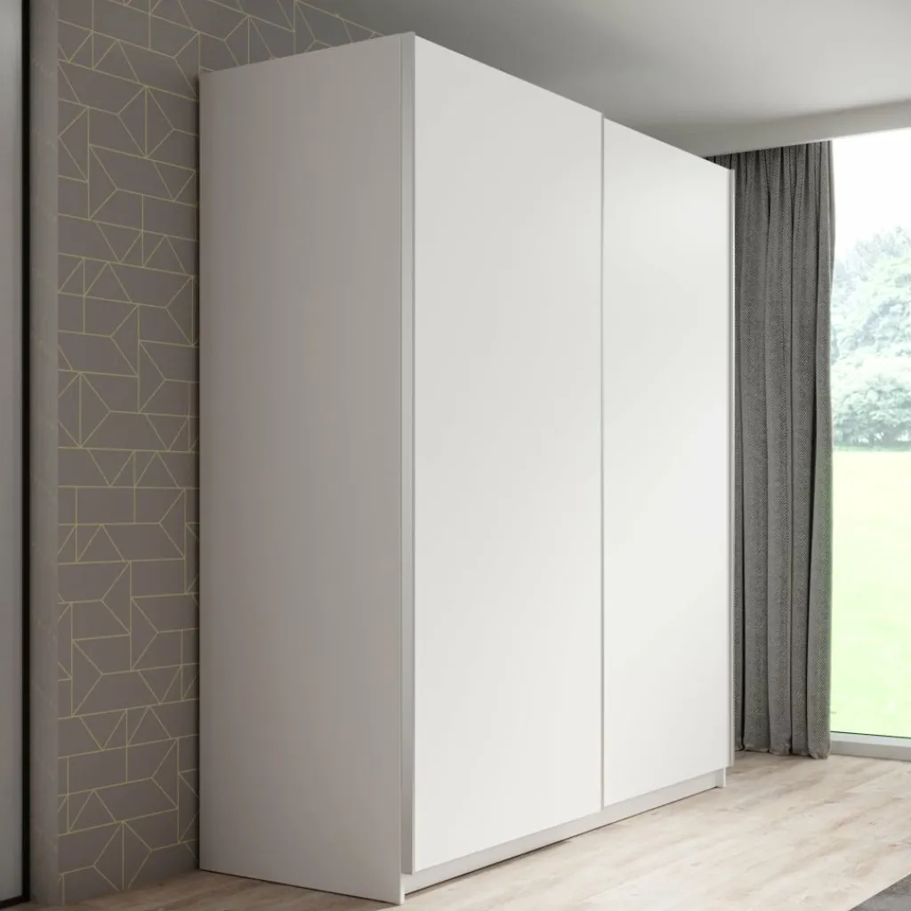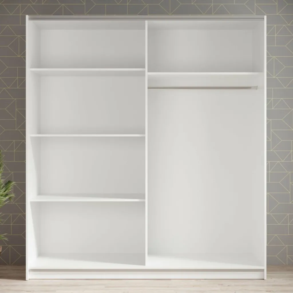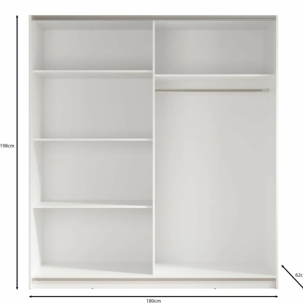 De Ganaro kledingkast van 180 cm breed biedt veel praktische opbergruimte in een strak en tijdloos design. De kast is afgewerkt in wit en voorzien van twee schuifdeuren met geïntegreerde handgrepen, wat zorgt voor een rustige en moderne uitstraling in de slaapkamer.