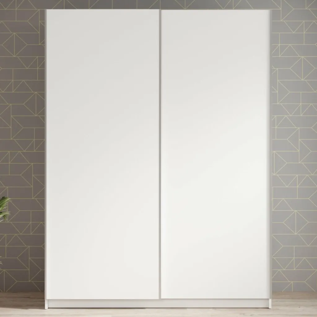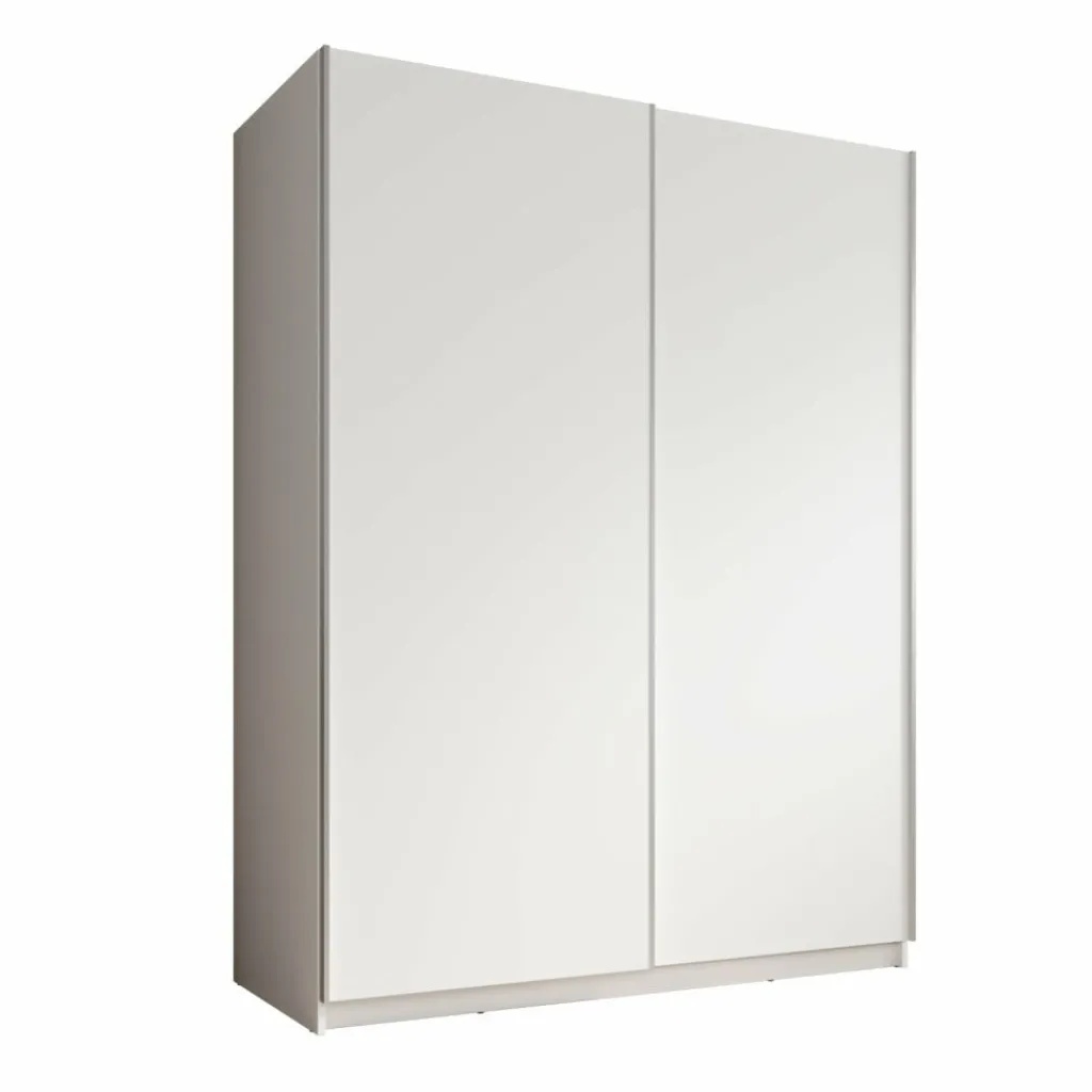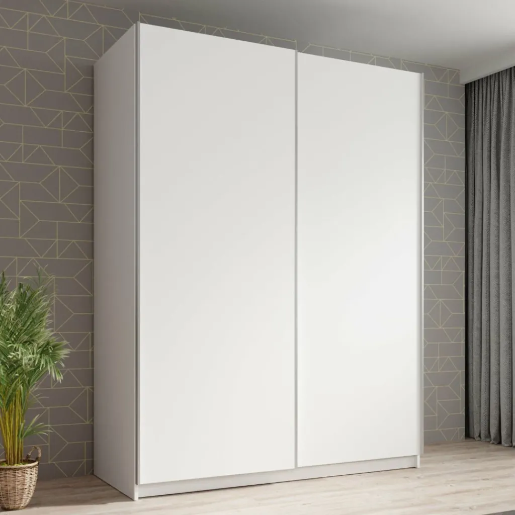 Deze kast is afgewerkt met witte schuifdeuren zonder handgrepen voor een minimalistische look. Dankzij het schuifdeursysteem bespaar je ruimte in de kamer, ideaal voor kleinere slaapkamers.