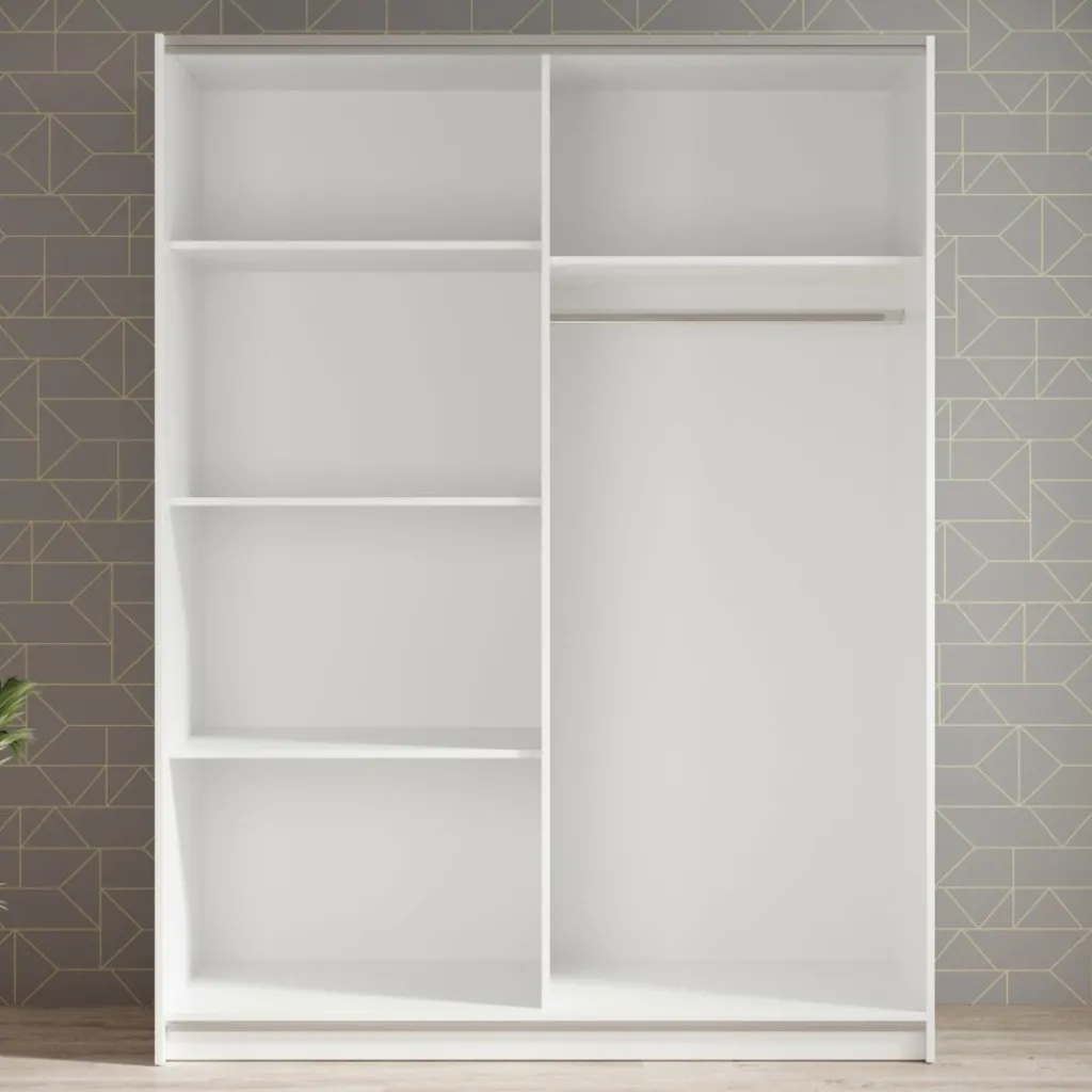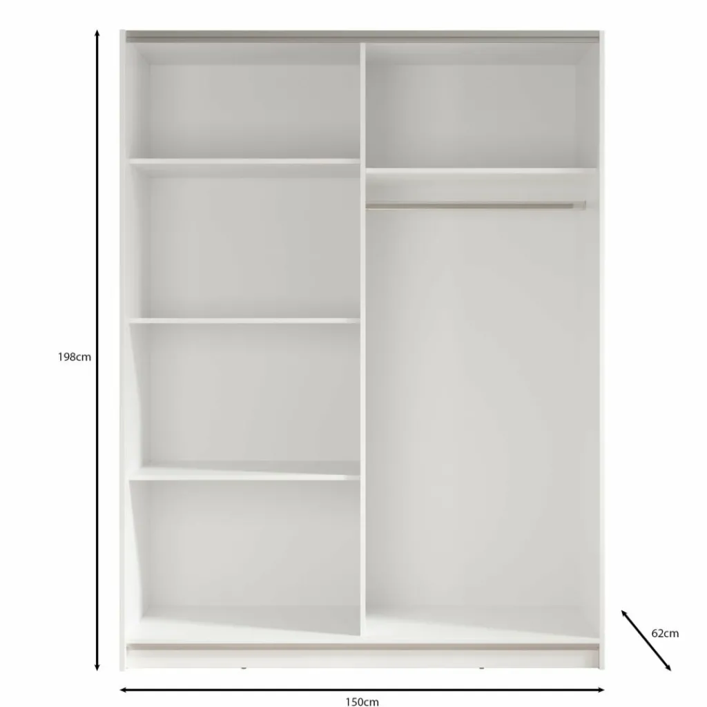 Strak vormgegeven schuifdeurkast in frisse witte kleur. De Ganaro is 150 cm breed, 198 cm hoog en 62 cm diep en biedt een praktische indeling met aan de linkerkant vier legvakken en aan de rechterzijde een brede hangruimte met roede en bovenplank.