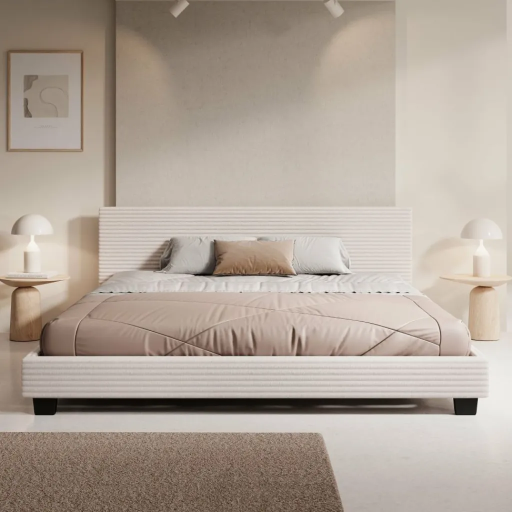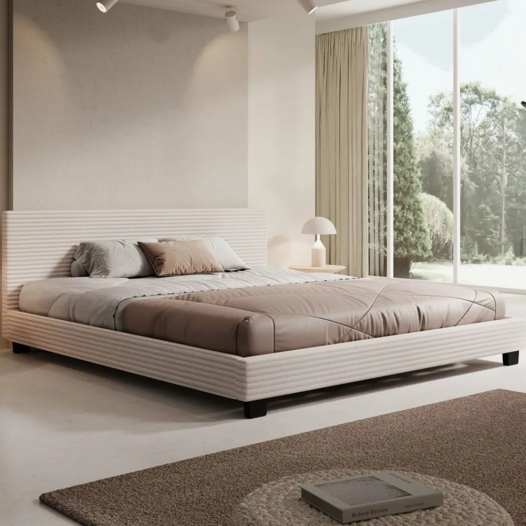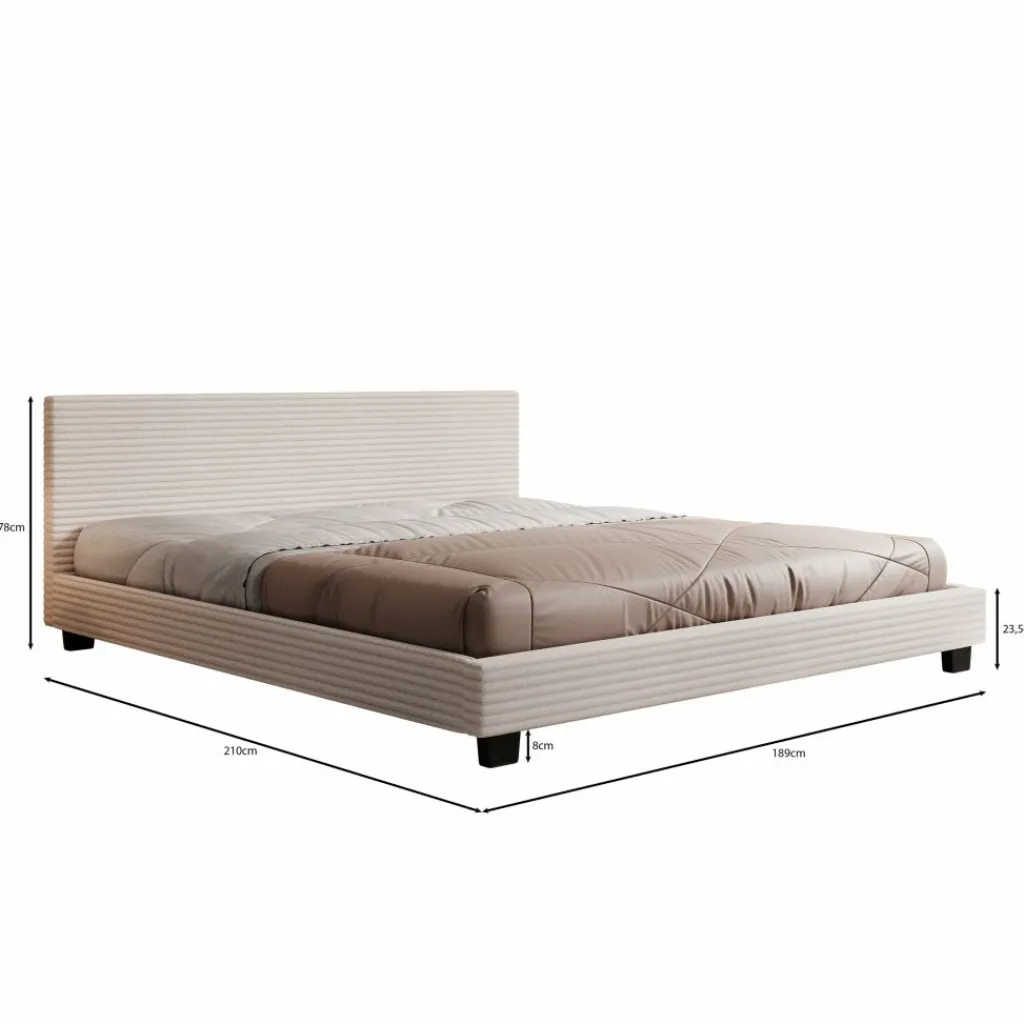 Het George tweepersoonsbed in ribstof beige is met zijn royale afmeting van 180×200 cm perfect voor wie extra ruimte zoekt. De ribstructuur geeft het bed een eigentijdse uitstraling en de warme beige kleur creëert een gezellige sfeer. Het brede hoofdbord en de zwarte poten maken het ontwerp compleet. Dit bed is niet alleen een comfortabele slaapplek, maar ook een stijlvolle blikvanger in de slaapkamer. Het wordt geleverd zonder matras, zodat je zelf de vrijheid hebt om een matras te kiezen dat past bij jouw persoonlijke slaapcomfort.