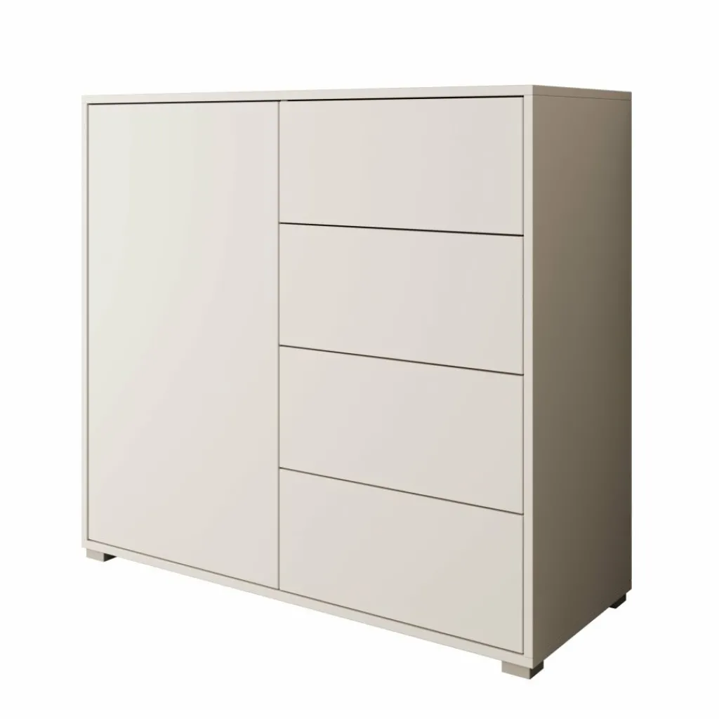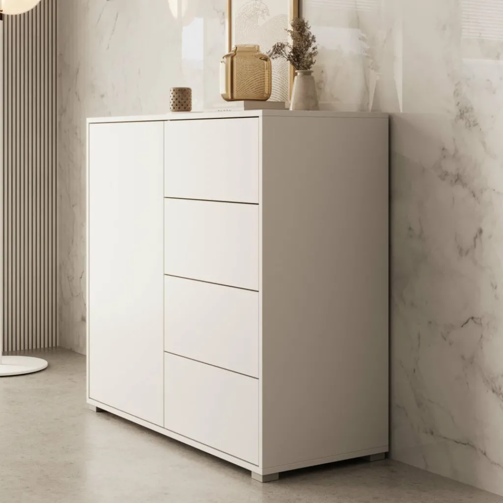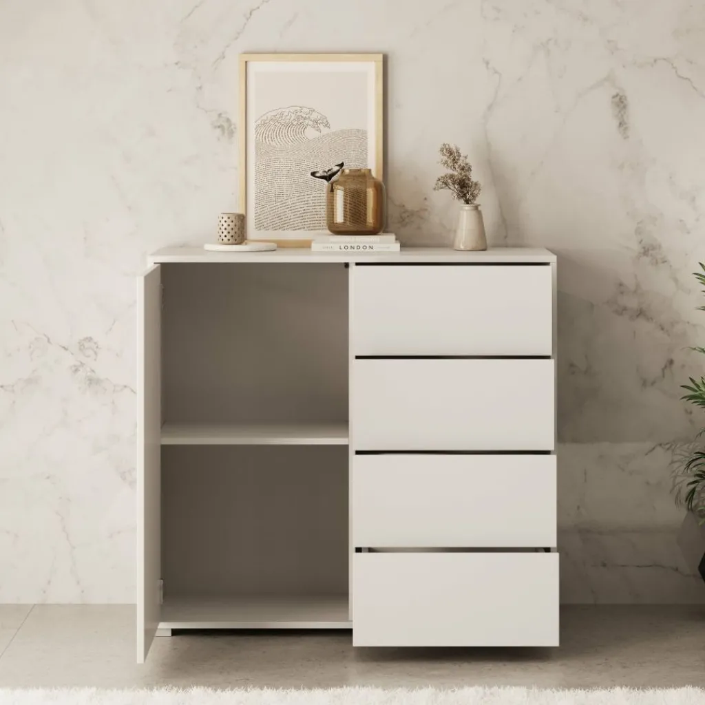 Dressoir Gideon is een opbergkast in een moderne stijl. De kast beschikt over 4 lades en 1 deur die openen met het push to open systeem. Achter de deur zijn ook nog 2 opbergvakken te vinden. Het meubel is volledig uitgevoerd in de kleur wit en staat op zilverkleurige pootjes.