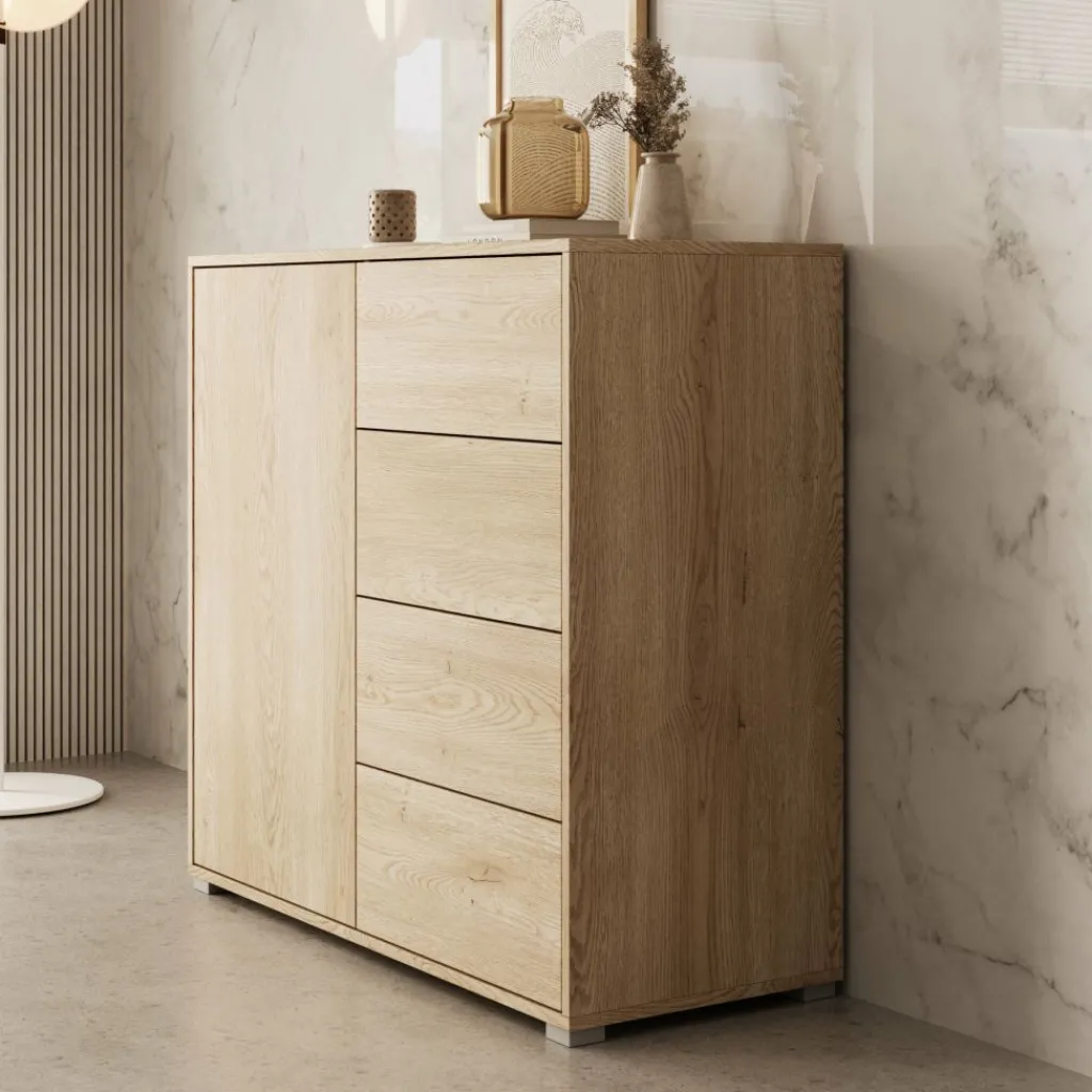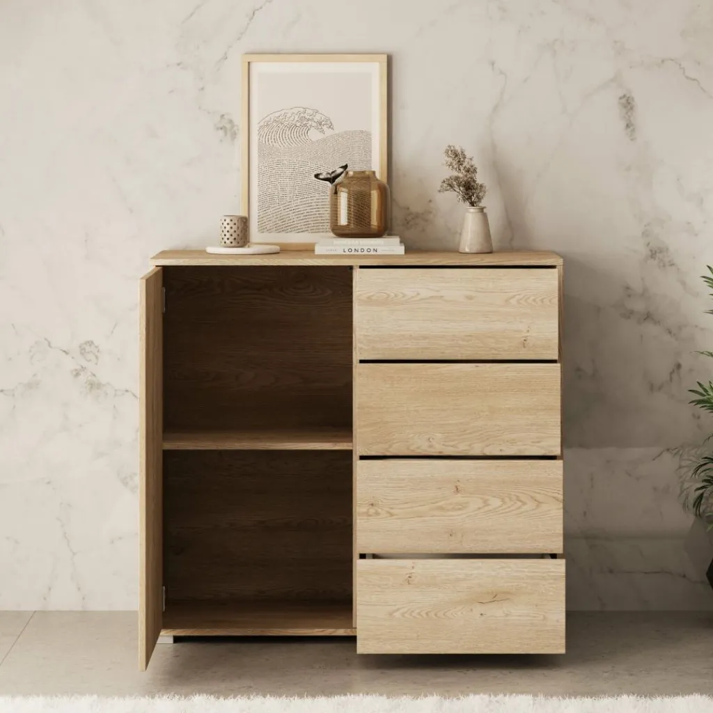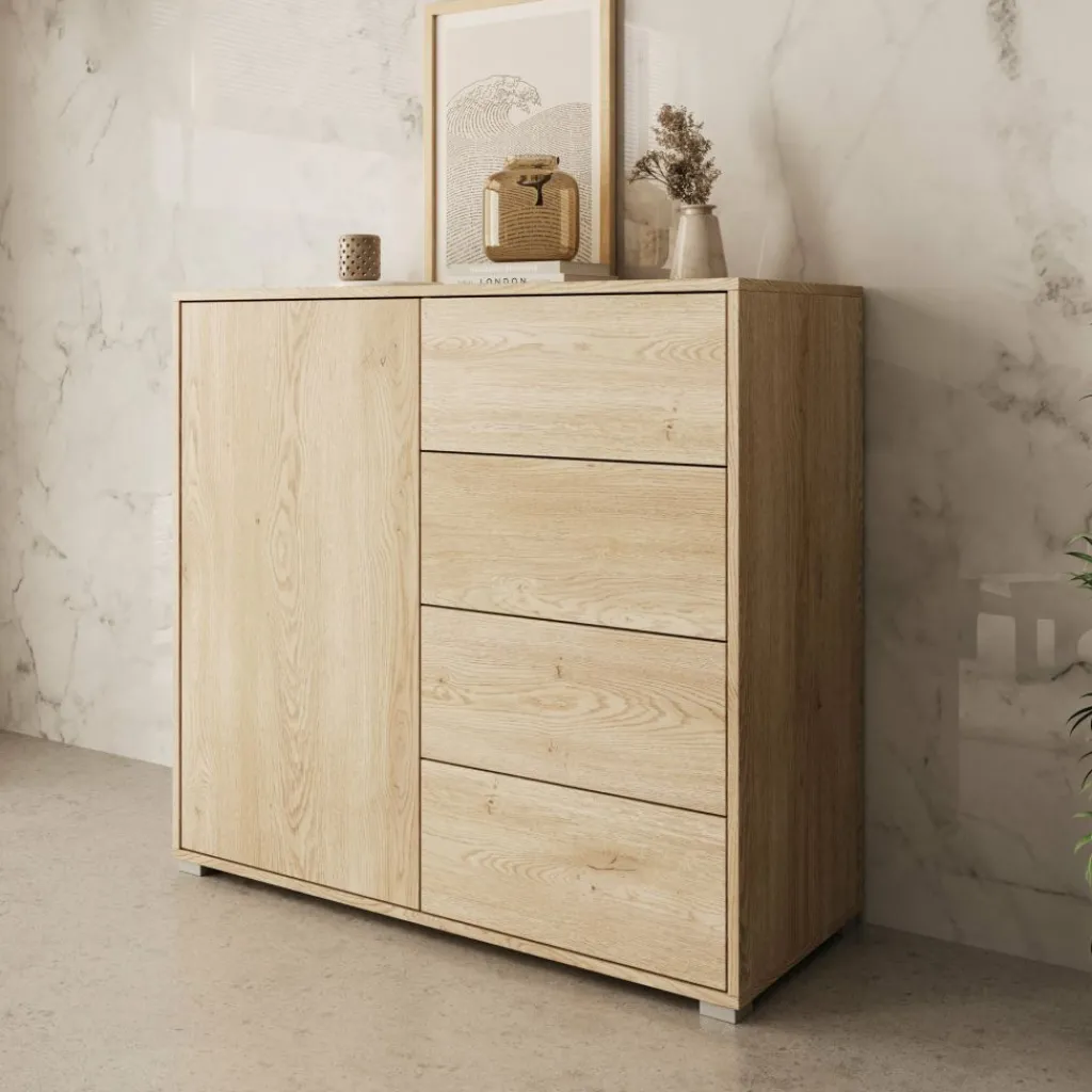Het dressoir beschikt over een combinatie van een deur en meerdere lades. Achter de deur bevinden zich twee opbergvakken die geschikt zijn voor grotere items zoals servies of mappen. De lades bieden extra ruimte voor kleinere spullen en zorgen voor een duidelijke indeling. Alle fronten zijn greeploos uitgevoerd, wat zorgt voor een strak en rustig geheel. Het bovenblad is geschikt voor decoratie of accessoires en de stabiele constructie maakt dit dressoir geschikt voor dagelijks gebruik.