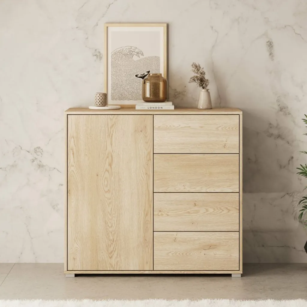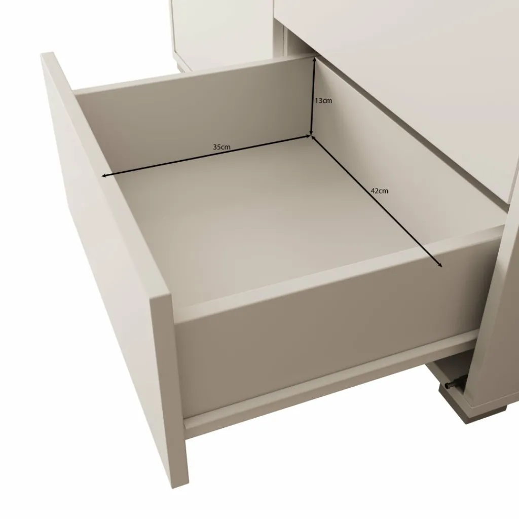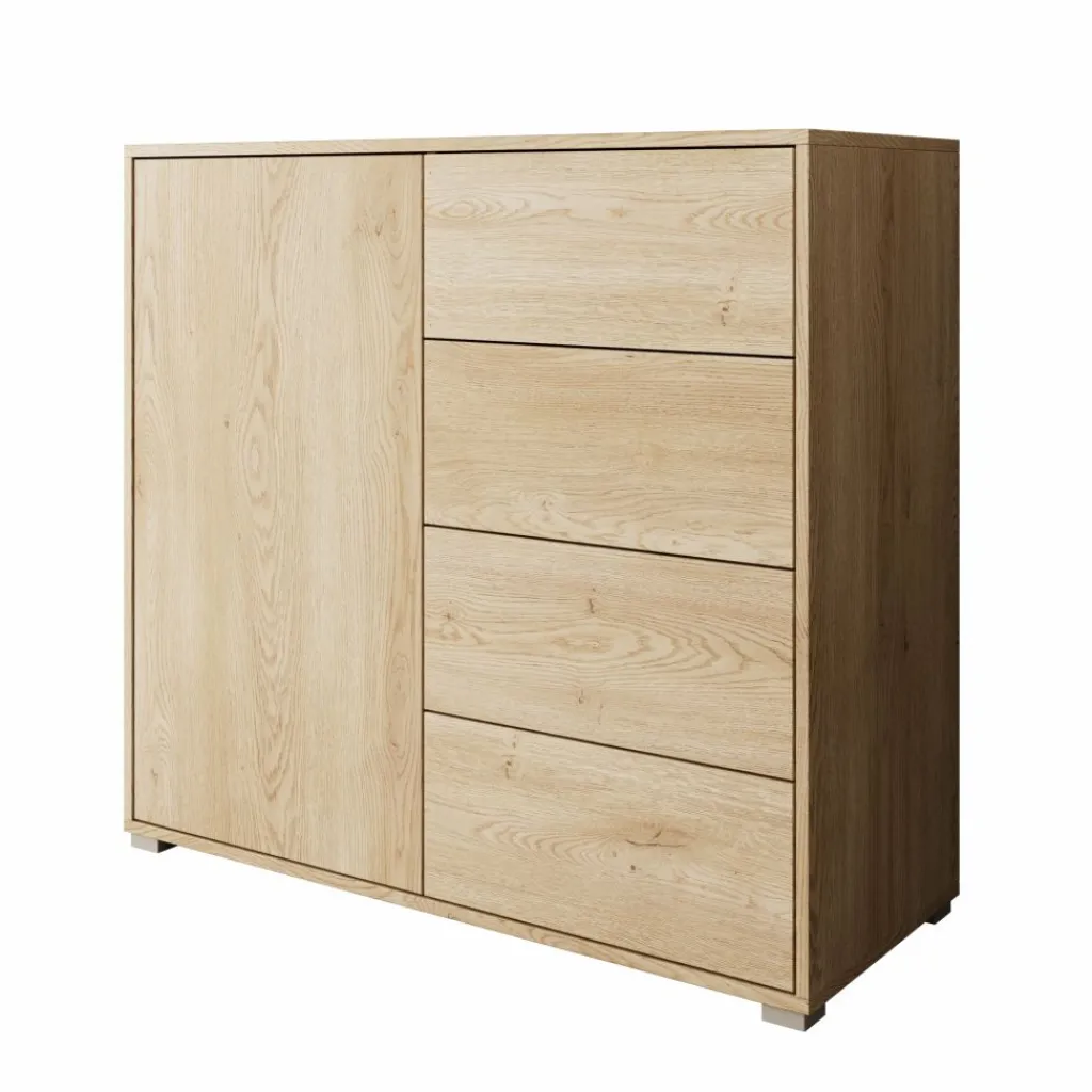 Het dressoir beschikt over een combinatie van een deur en meerdere lades. Achter de deur bevinden zich twee opbergvakken die geschikt zijn voor grotere items zoals servies of mappen. De lades bieden extra ruimte voor kleinere spullen en zorgen voor een duidelijke indeling. Alle fronten zijn greeploos uitgevoerd, wat zorgt voor een strak en rustig geheel. Het bovenblad is geschikt voor decoratie of accessoires en de stabiele constructie maakt dit dressoir geschikt voor dagelijks gebruik.