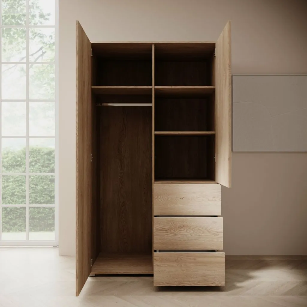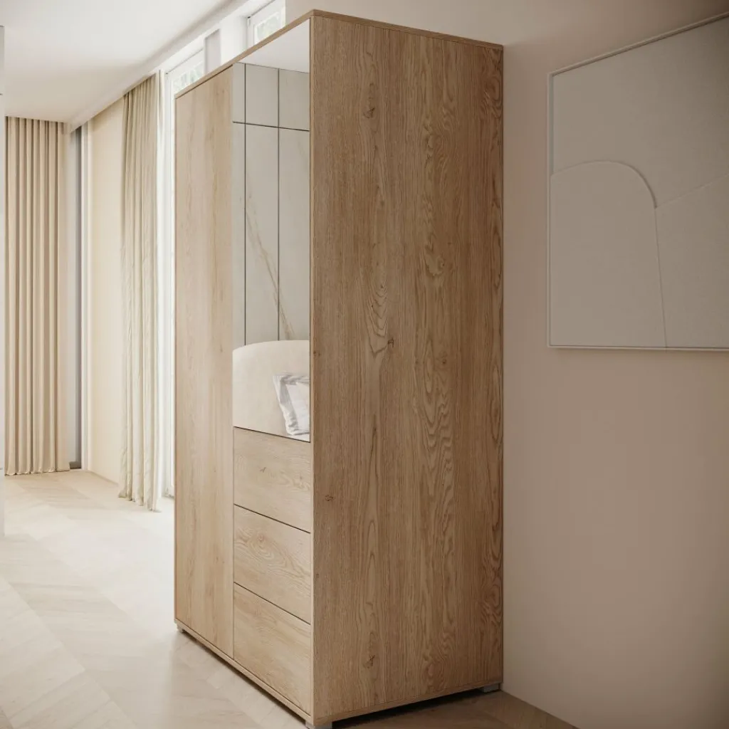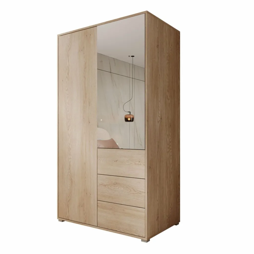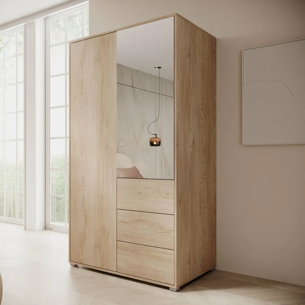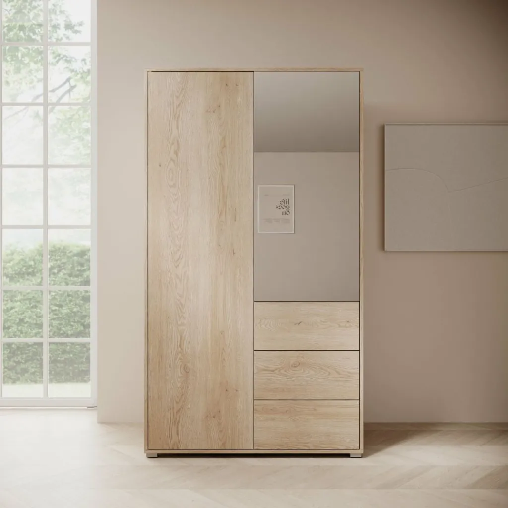 De kast is uitgevoerd met twee deuren, waarvan één met spiegel. Achter de deuren bevindt zich een combinatie van hangruimte en legplanken voor kleding en andere spullen. Aan de rechterzijde zijn drie lades aanwezig, geschikt voor kleinere kledingstukken en accessoires.