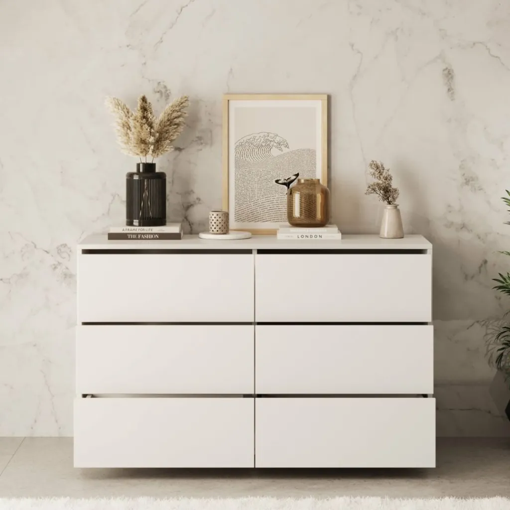 Ladekast Gideon is een moderne en strak vormgegeven opbergkast, uitgevoerd in wit met zes ruime lades. Dankzij het push-to-open systeem ogen de lades greeploos en strak, terwijl je ze moeiteloos opent met een lichte druk. De zilverkleurige poten geven het meubel een subtiel stijlaccent.