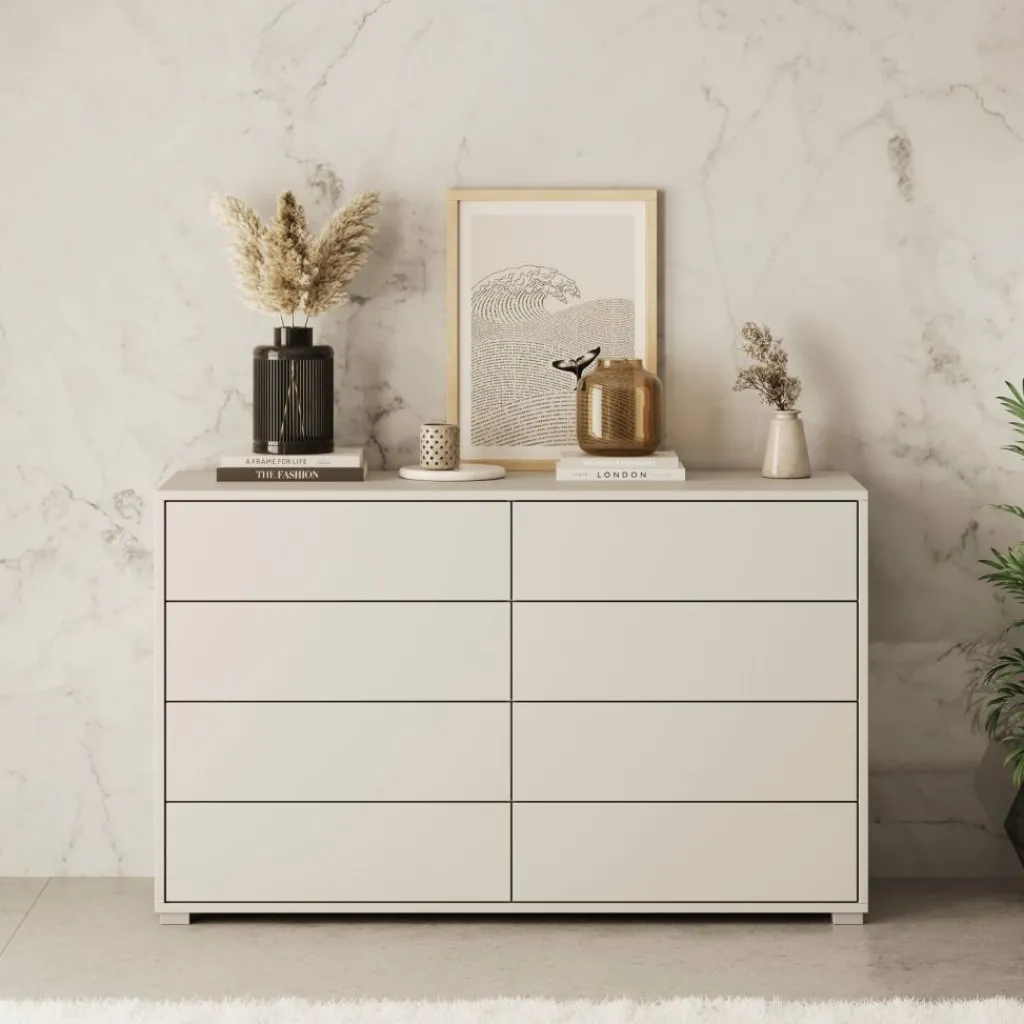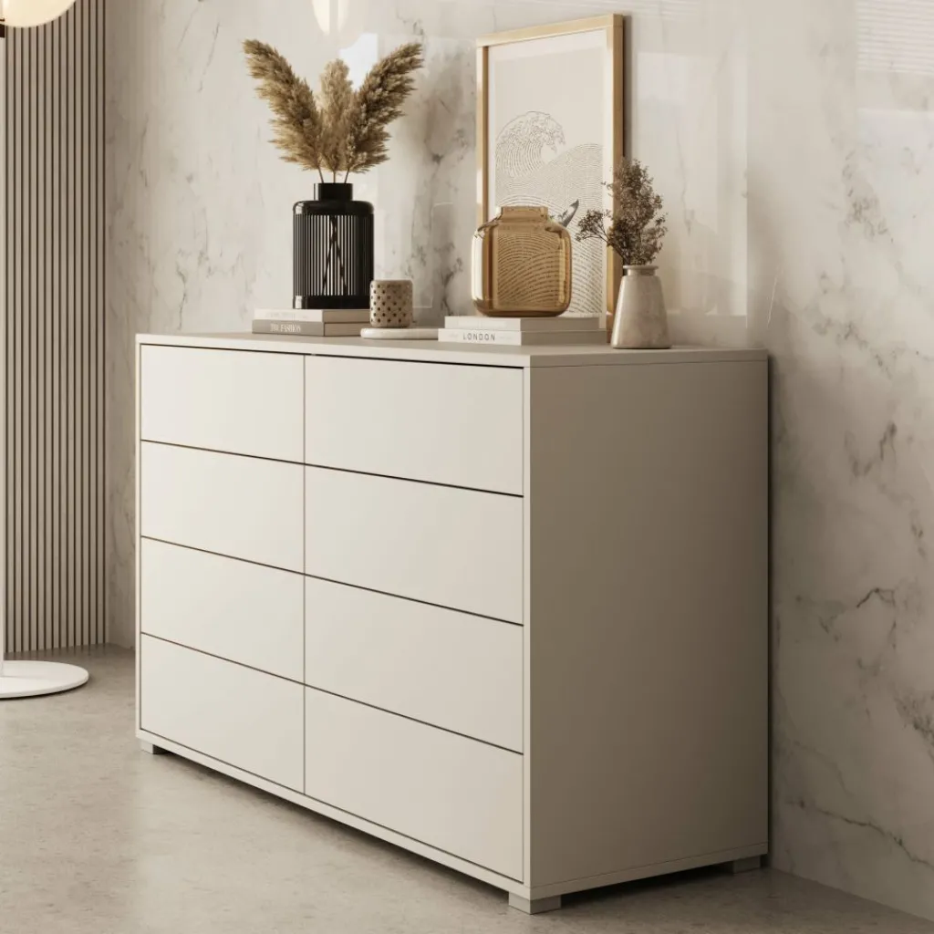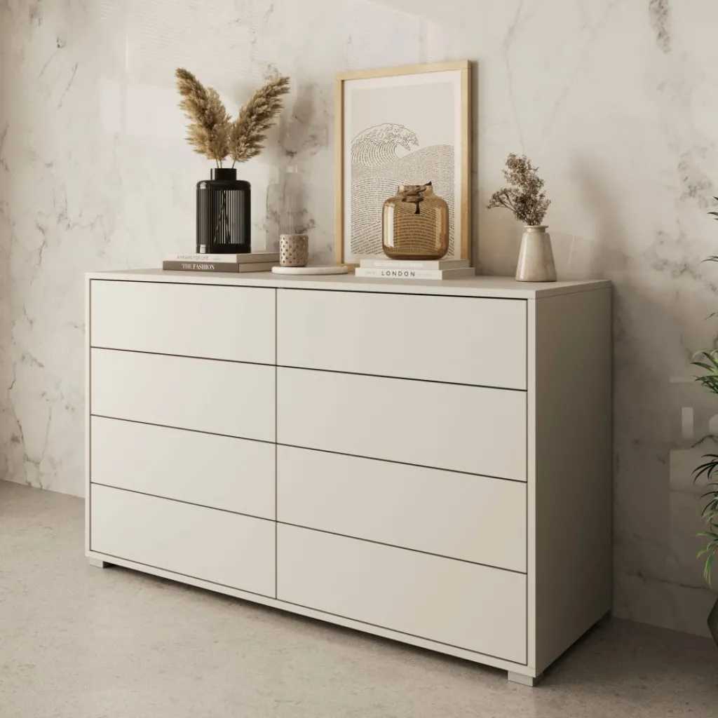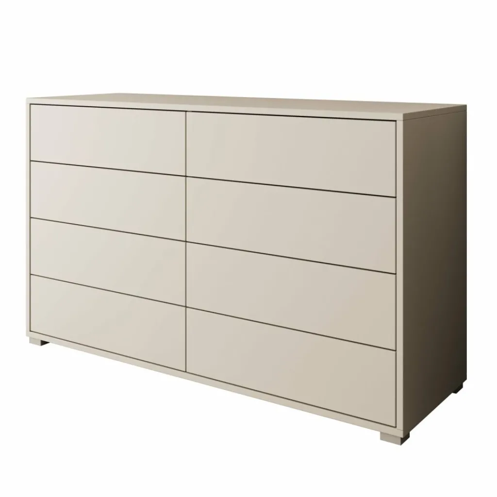 De ladekast Gideon is uitgevoerd in beige en heeft een strakke, moderne vormgeving. Met acht ruime lades biedt deze kast veel opbergruimte voor kleding, linnengoed of andere spullen. De lades hebben een binnenmaat van 52×34×13 cm en lopen soepel dankzij het strakke front zonder handgrepen. Het bovenblad is ideaal om te gebruiken voor decoratie of extra opbergruimte.