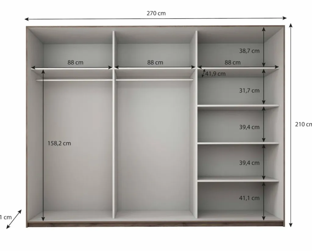 Garderobekast Gina is een grote, praktische kledingkast uitgevoerd in eiken. De kledingkast beschikt over 2 schuifdeuren waardoor ruimte wordt bespaard. Het binnenwerk bestaat uit 3 delen. 2 delen hebben een open schap en een grote opbergruimte met metalen stang om kleding aan om te hangen. Het derde deel beschikt over maar liefst 5 open schappen.