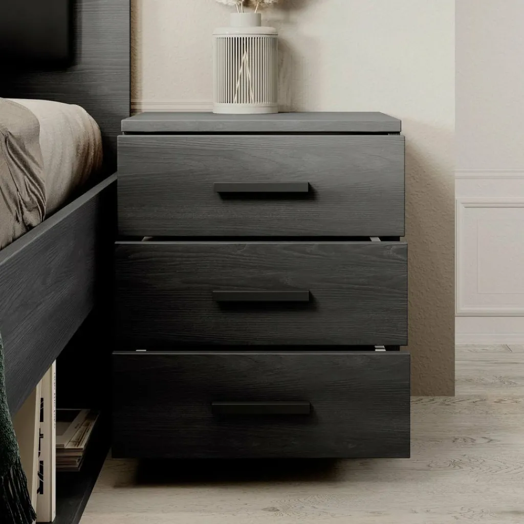 Nachtkastje Gina is een praktische opbergkast met een strak en modern design. Het meubel is uitgevoerd in een antraciet eiken kleur en beschikt over drie lades, waardoor je voldoende ruimte hebt voor het netjes opbergen van dagelijkse spullen naast het bed.