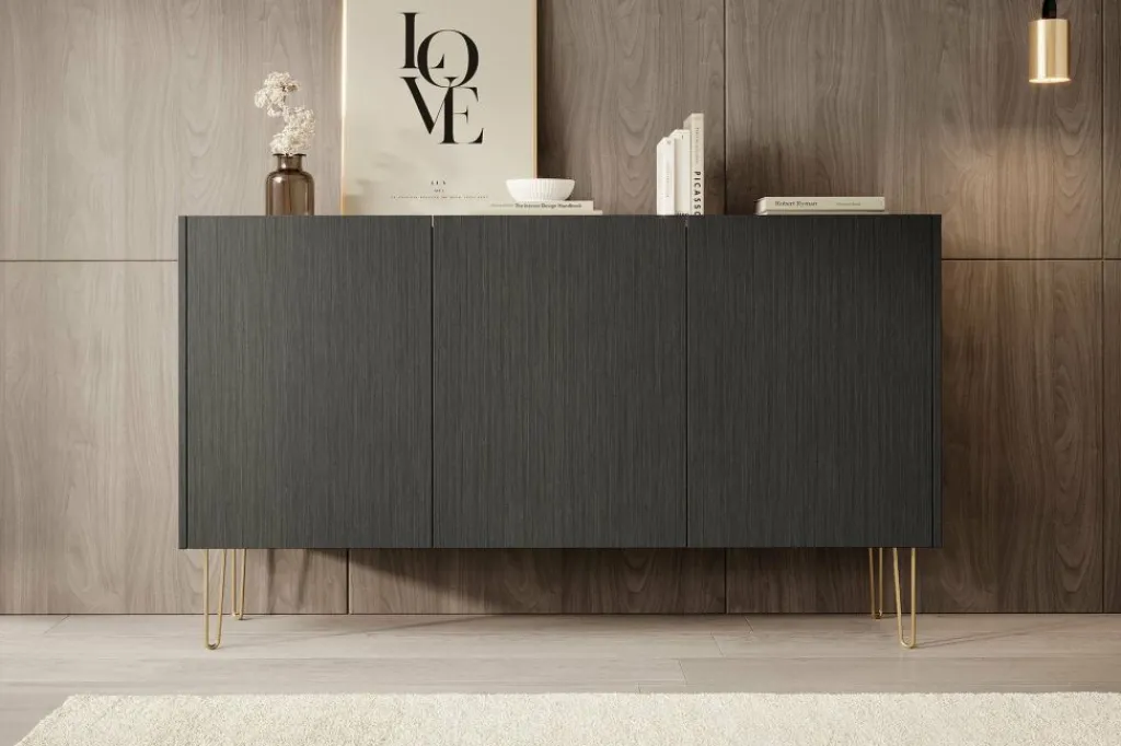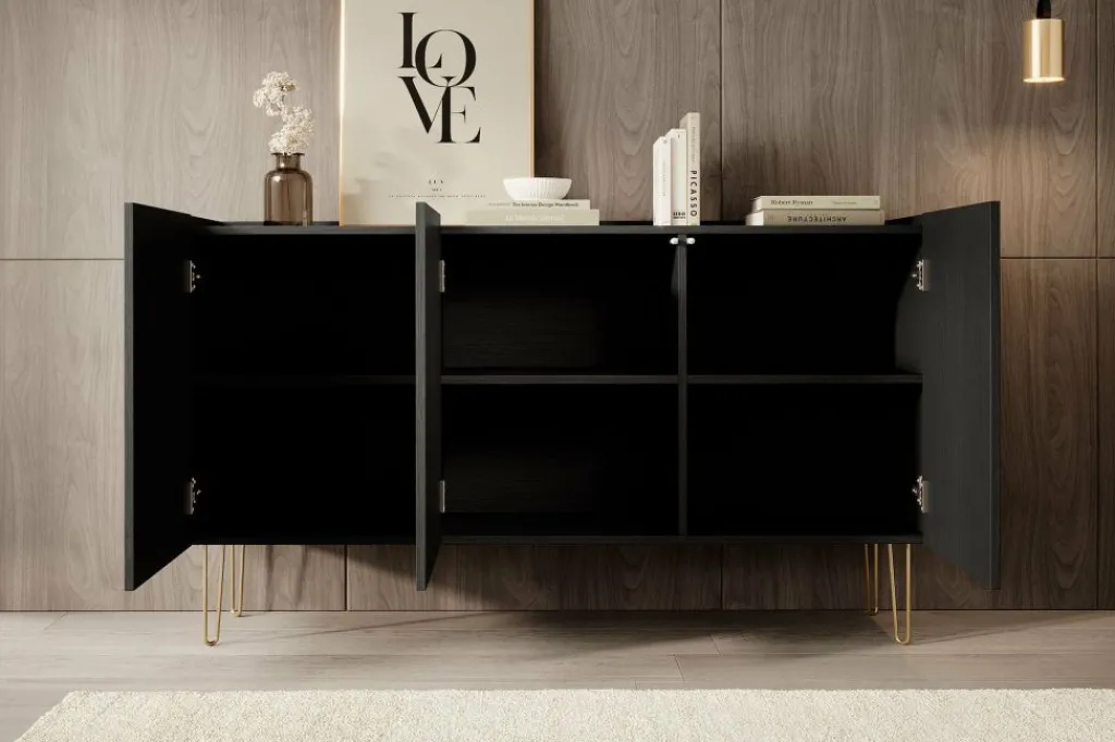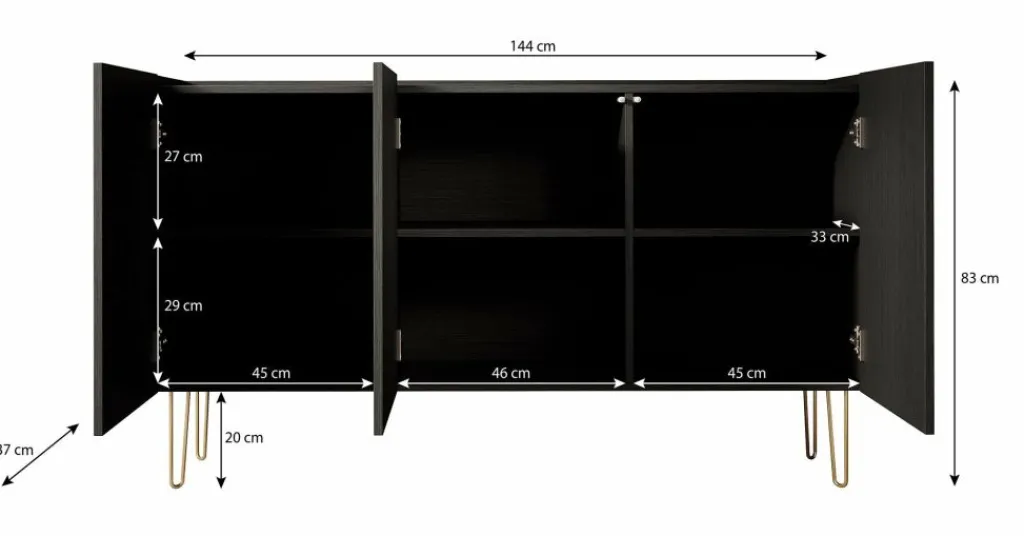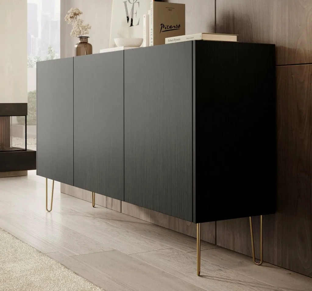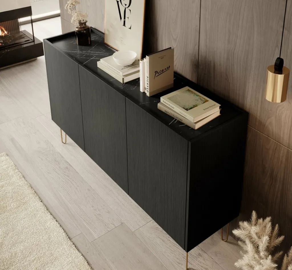 Dressoir Hacienda is een moderne designkast, uitgevoerd in een zwart eiken kleur. Het bovenblad is in marmerlook. De kast beschikt over 3 klapdeuren. De kast staat op goudkleurige hoge pootjes. Door het strakke en eenvoudige design is dit meubel vooral passend binnen een moderne en hotelchique woonstijl.