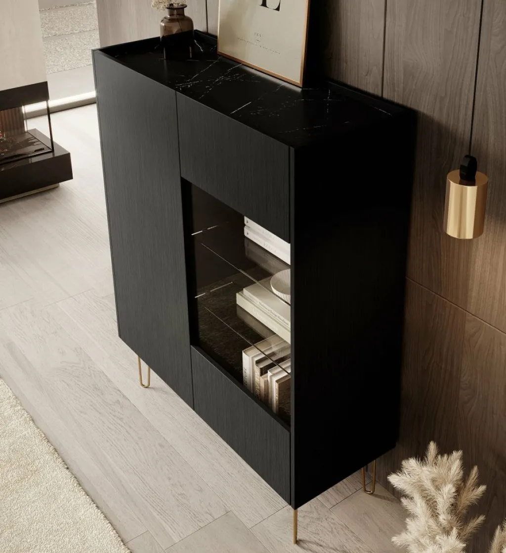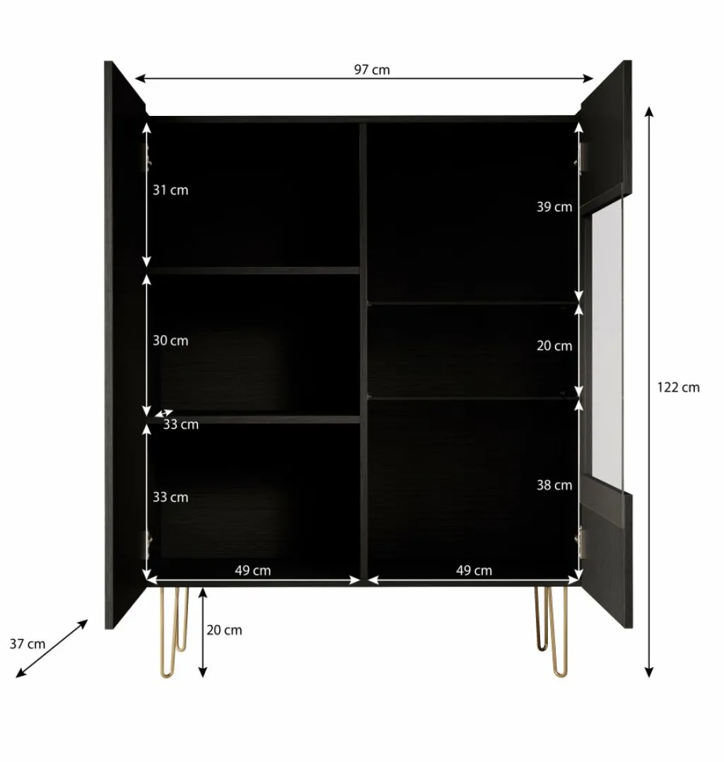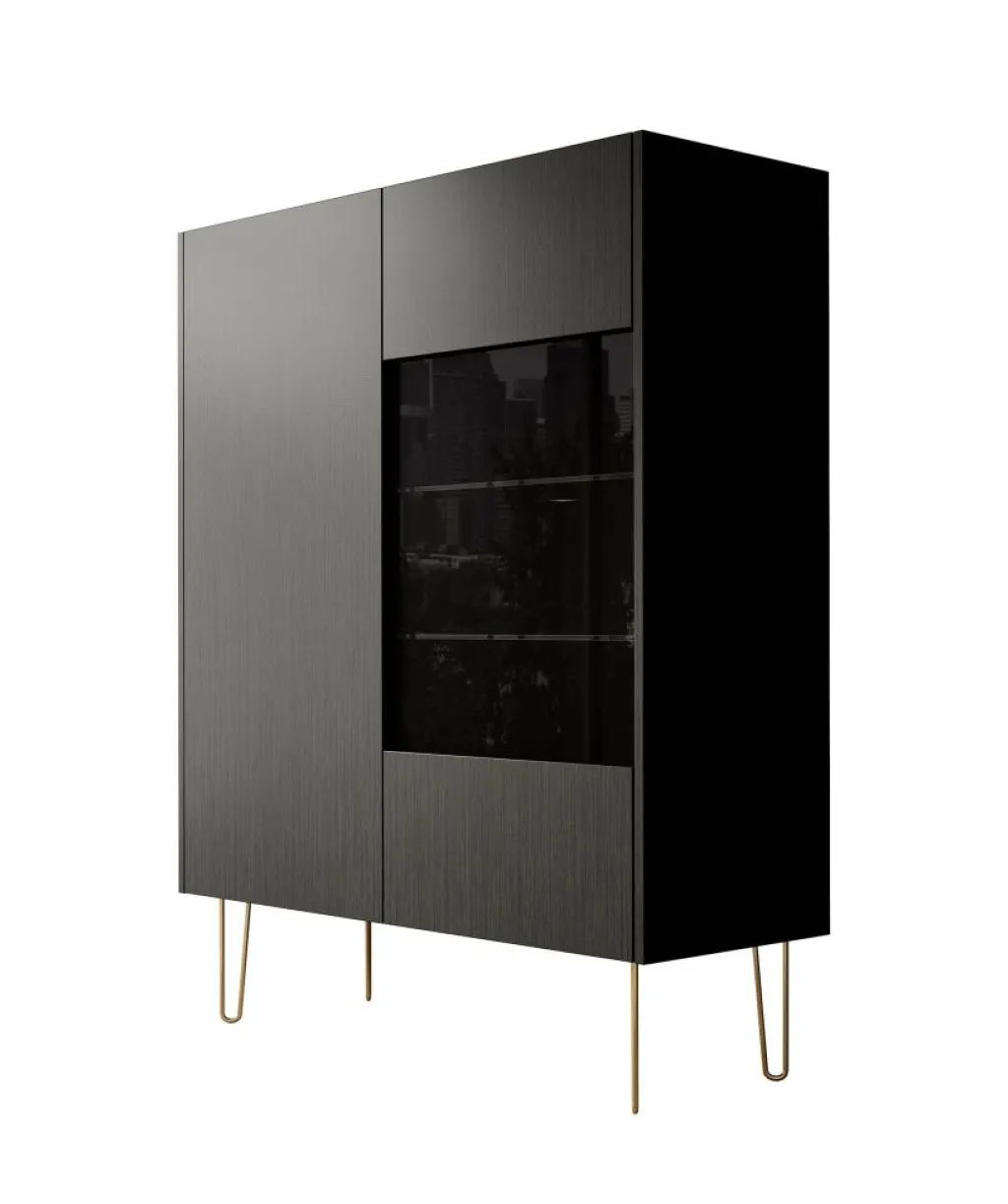 Opbergkast Hacienda is een praktisch vormgegeven kast, in moderne hotel-chique stijl. Het betreft een dichte opbergkast met twee deuren. De rechterdeur heeft in het midden een glasplaat. Het model is uitgevoerd in een zwart eiken kleur en staat op goudkleurige pootjes. Het bovenblad heeft een marmerlook.