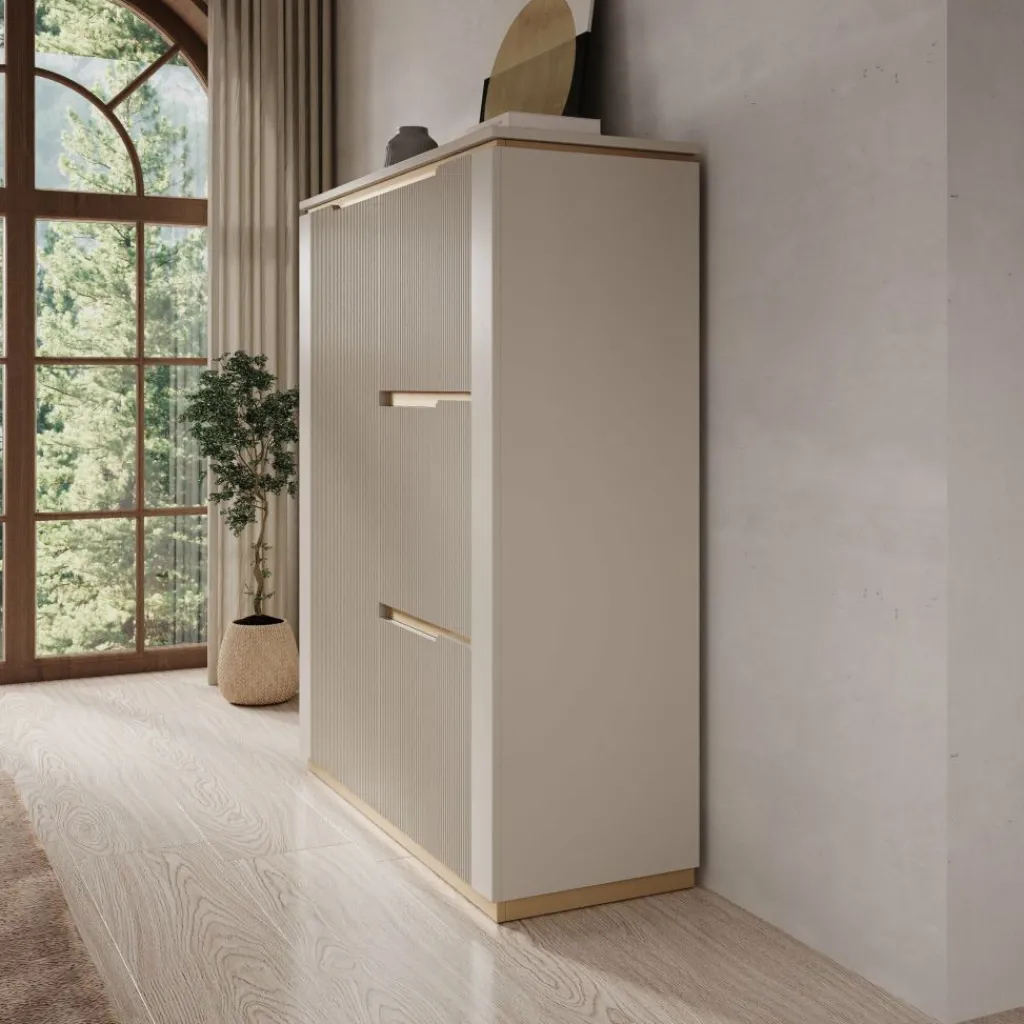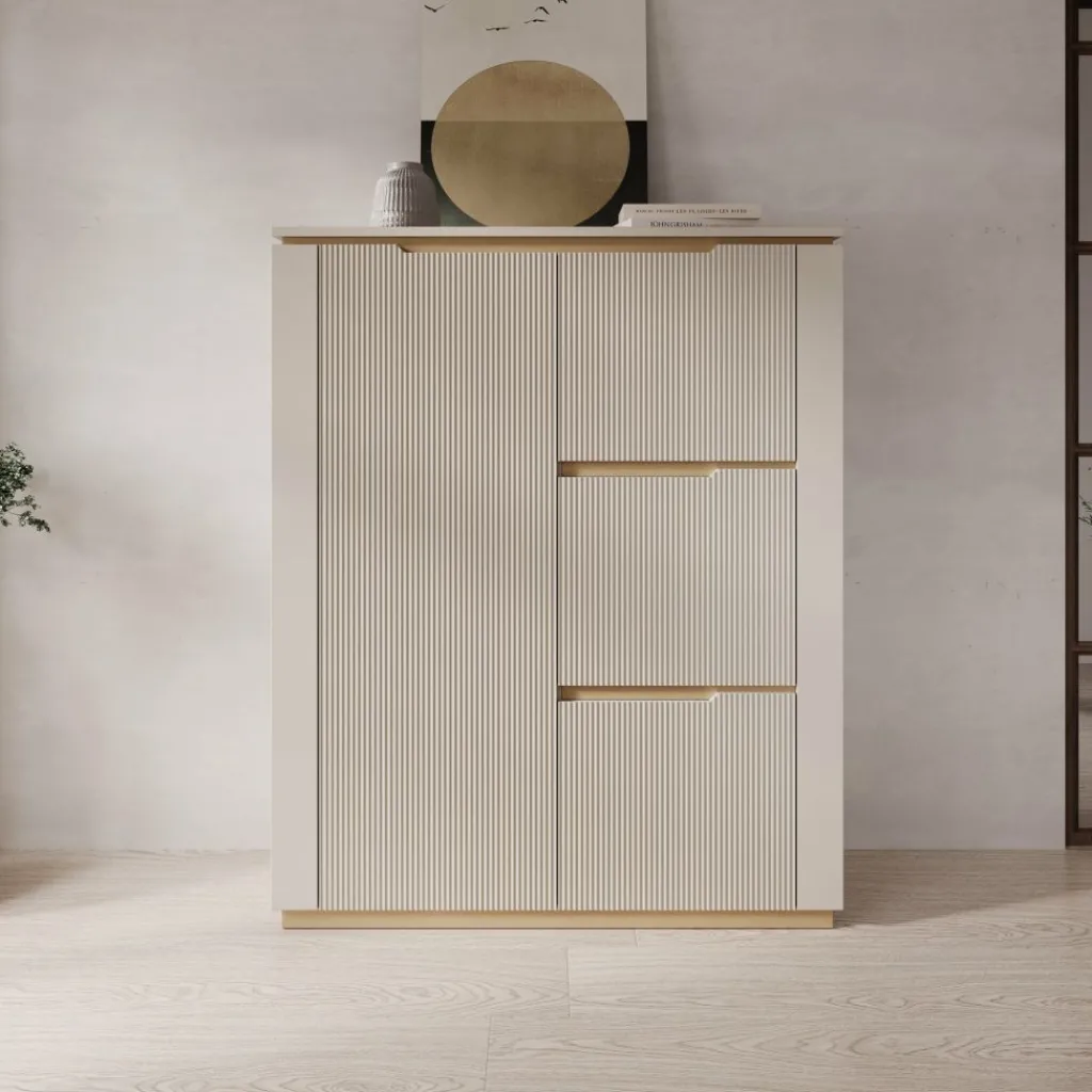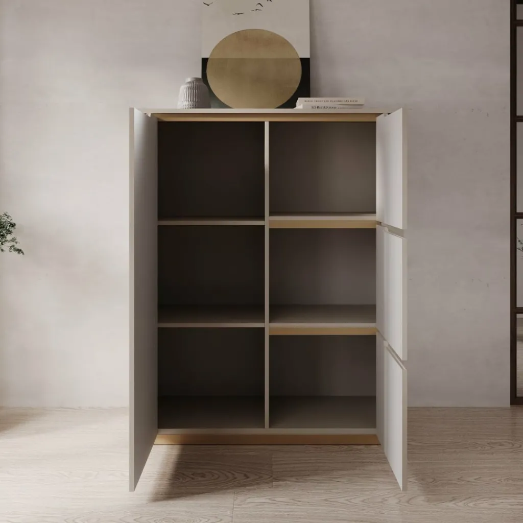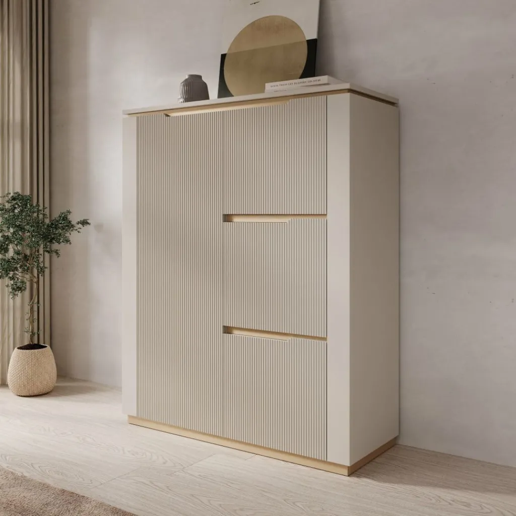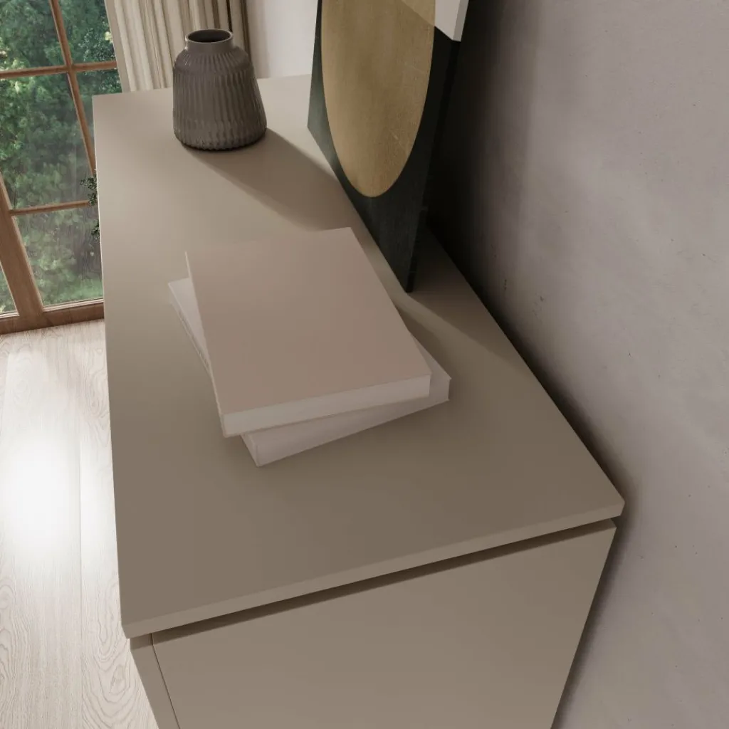 Het bovenblad biedt extra ruimte voor decoratie, boeken of een vaas. Dankzij de neutrale beige kleur en het strakke ontwerp is dit dressoir eenvoudig te combineren in verschillende woonstijlen.