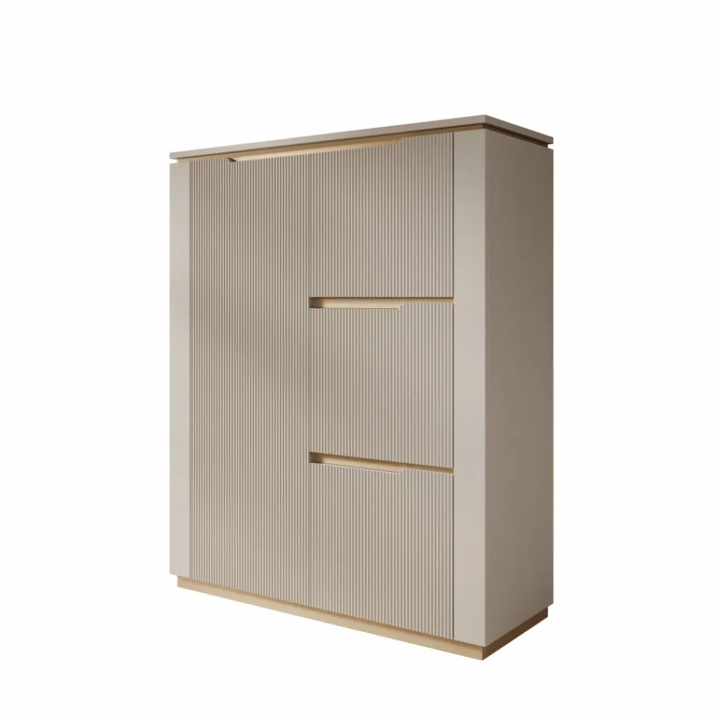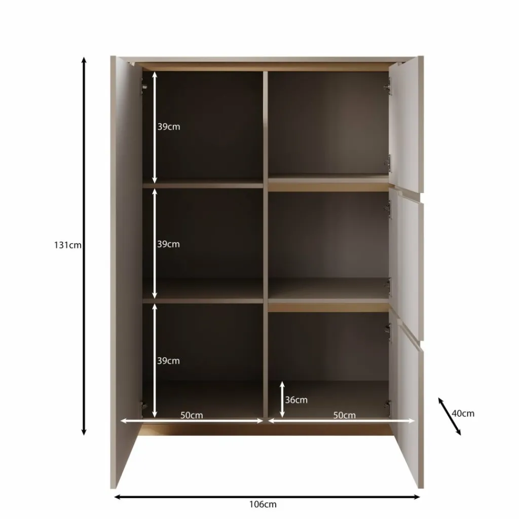 Het Harper dressoir in beige is een staand meubel met een breedte van 106 cm, een diepte van 40 cm en een hoogte van 131 cm. Door het verticale ontwerp is het geschikt voor ruimtes waar je extra opbergruimte wilt creëren zonder veel vloeroppervlak in te nemen.
