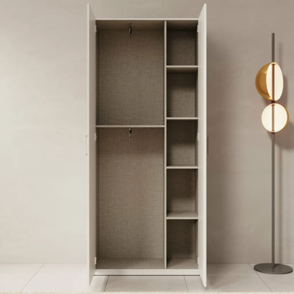 Achter de draaideuren is de kast praktisch ingedeeld. Aan de linkerzijde bevindt zich een hanggedeelte voor kleding op hangers. Aan de rechterzijde zijn meerdere legplanken geplaatst, geschikt voor opgevouwen kleding, schoenen of accessoires. De vaste indeling zorgt voor een overzichtelijke en efficiënte benutting van de beschikbare ruimte.