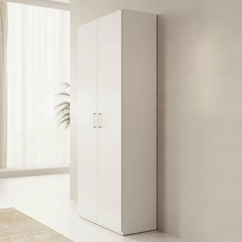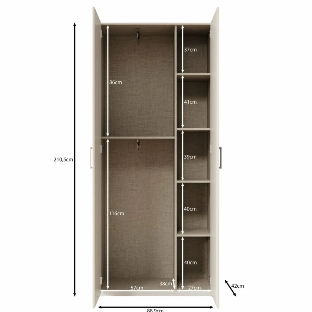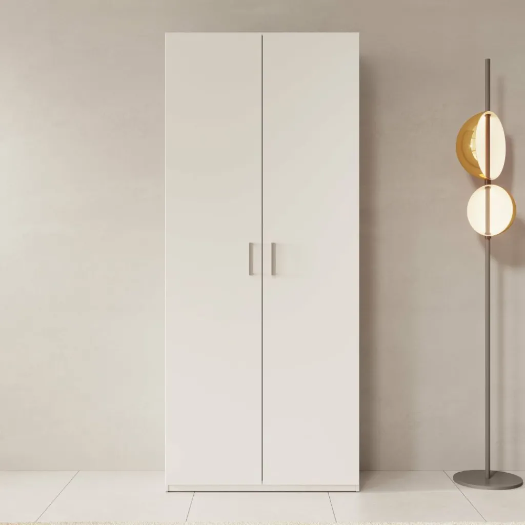 Havron is een 2-deurs kledingkast uitgevoerd in wit en heeft een strakke, functionele opzet. Met een breedte van 89 cm, een diepte van 42 cm en een hoogte van 211 cm is deze kast geschikt voor kleinere slaapkamers, logeerkamers of studentenkamers.