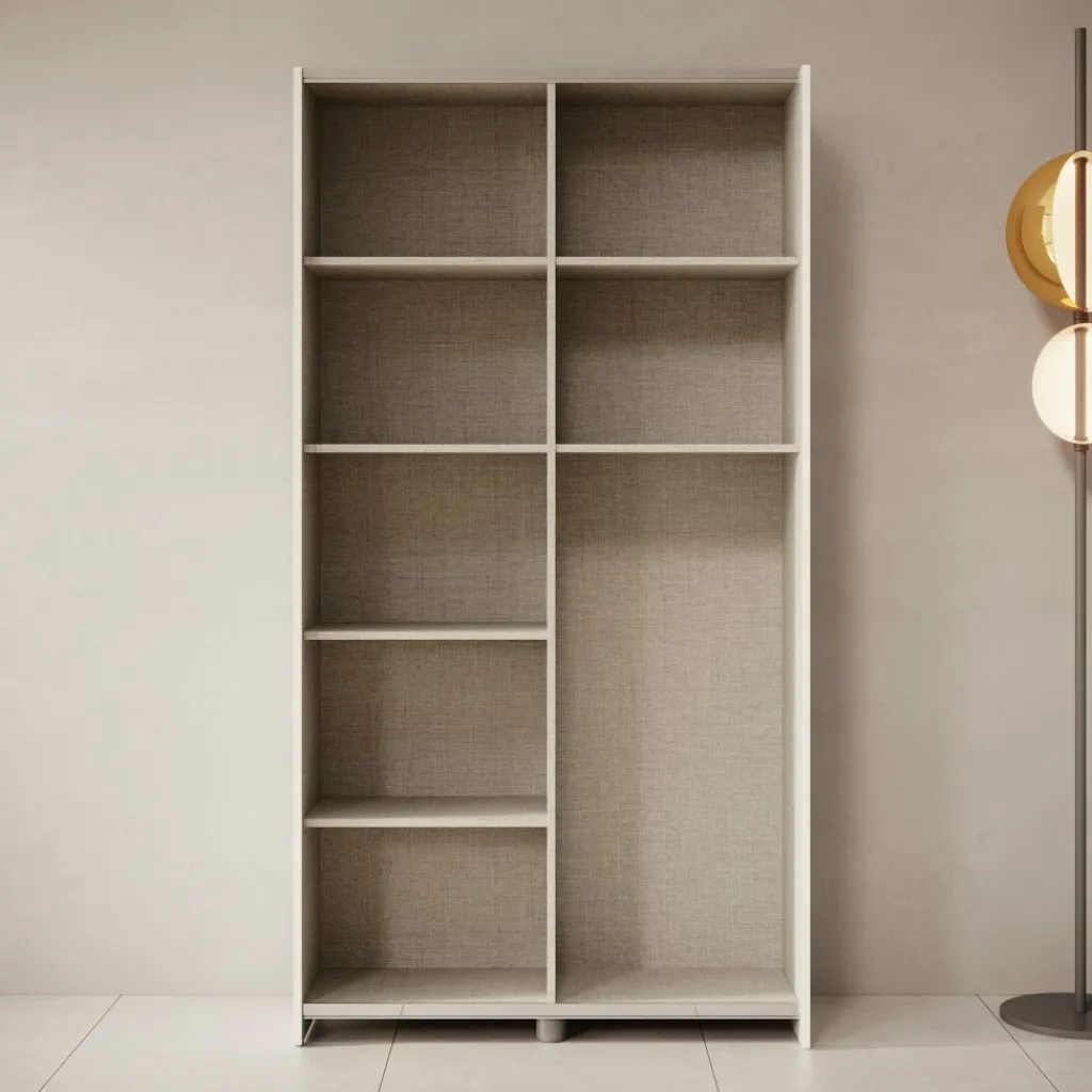 Achter de schuifdeuren is de kast verdeeld in twee gedeeltes. Aan de linkerzijde bevinden zich meerdere legplanken, geschikt voor het opbergen van kleding, schoenen of opbergdozen. Aan de rechterzijde is een hanggedeelte aanwezig met een kledingroede voor het ophangen van jassen, jurken of overhemden. Deze indeling maakt de kast geschikt voor zowel hangende als gevouwen kleding.