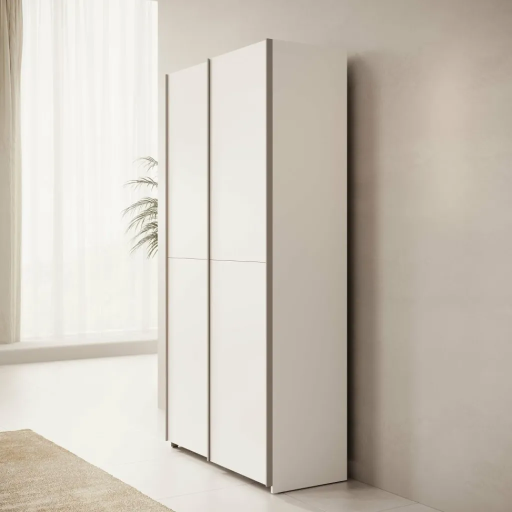 De schuifdeuren lopen soepel en sluiten het interieur netjes af. De witte afwerking zorgt voor een strakke en neutrale uitstraling, waardoor de kledingkast eenvoudig te combineren is met verschillende interieurstijlen. Door de compacte diepte van 39 cm is de Helvar kledingkast ook geschikt voor kleinere slaapkamers of andere ruimtes waar minder plaats beschikbaar is.