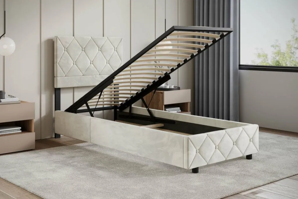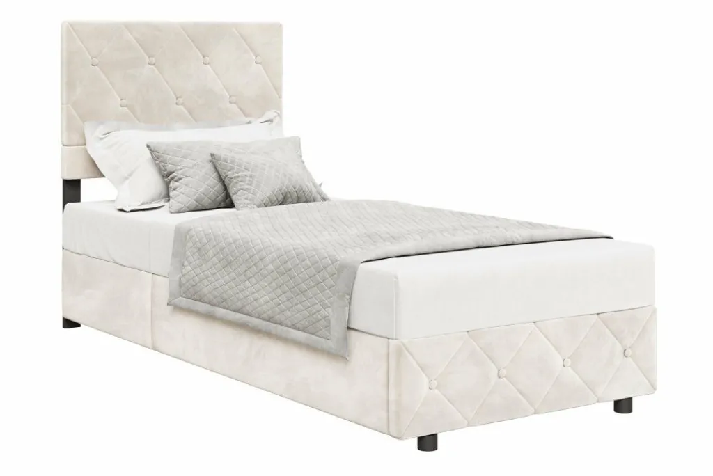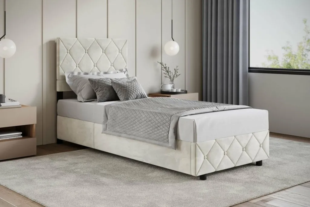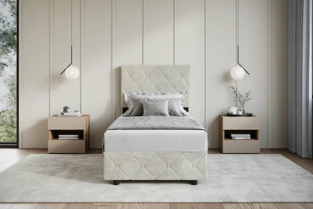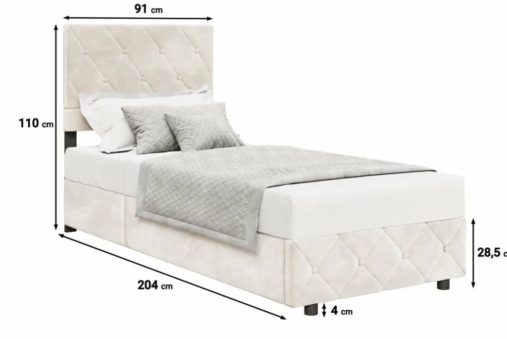 Eenpersoonsbed Hernandez is een bed geschikt voor matrasmaat 90×200 cm. Het meubel is gemaakt van een zachte velvet stof in de kleur beige. Het bed wordt geleverd zonder matras. De lattenbodem is wel inbegrepen. Deze lattenbodem beschikt over een gasliftsysteem. Hierdoor kan je de bodem omhoog kantelen zodat er opbergruimte ontstaat. Handig voor bijvoorbeeld kussens, beddengoed of dekens. Het hoofdbord en het voetenbord hebben een gecapitonneerde afwerking.