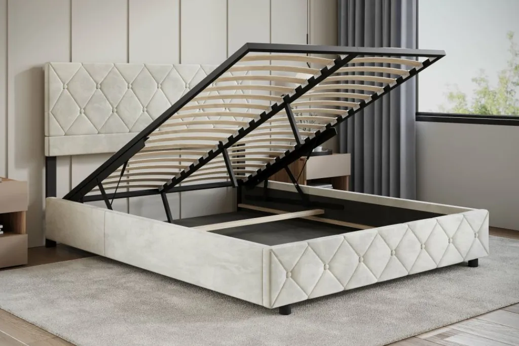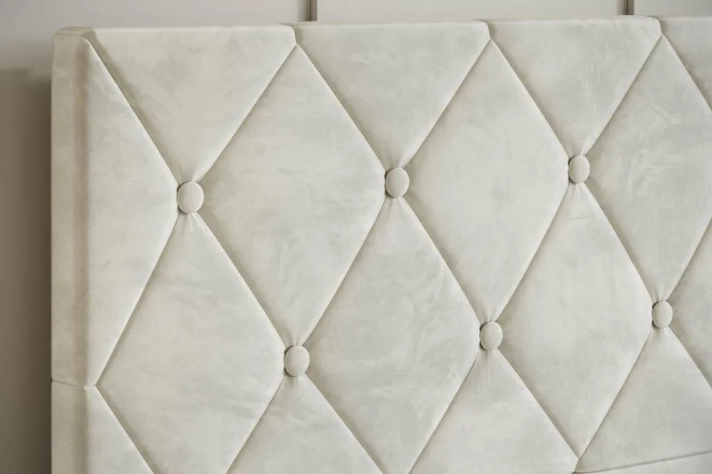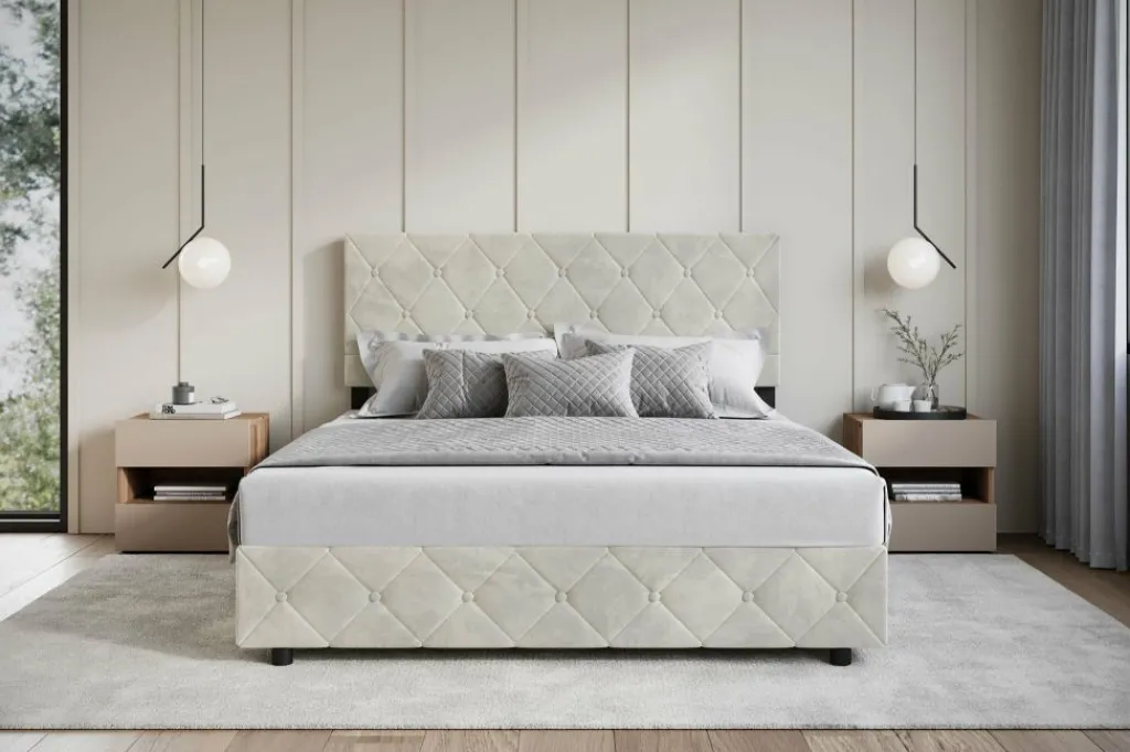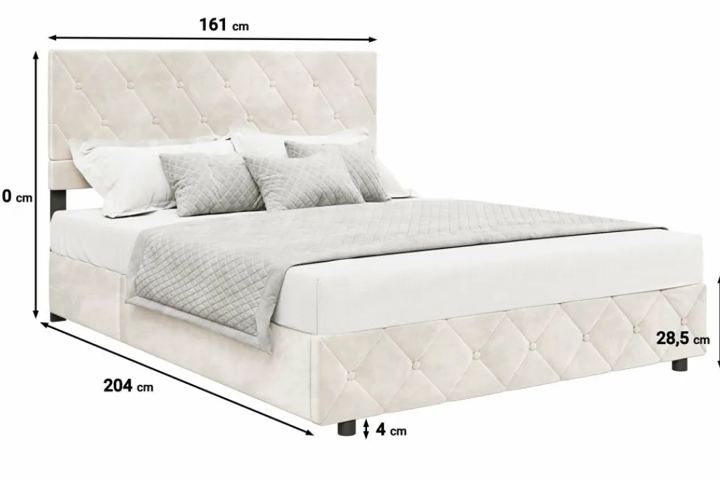 Tweepersoonsbed Hernandez is een bed geschikt voor matrasmaat 160×200 cm. Het meubel is gemaakt van een zachte velvet stof in de kleur beige. Het bed wordt geleverd zonder matras. De lattenbodem is wel inbegrepen. Deze lattenbodem beschikt over een gasliftsysteem. Hierdoor kan je de bodem omhoog kantelen zodat er opbergruimte ontstaat. Handig voor bijvoorbeeld kussens, beddengoed of dekens. Het hoofdbord en het voetenbord hebben een gecapitonneerde afwerking.