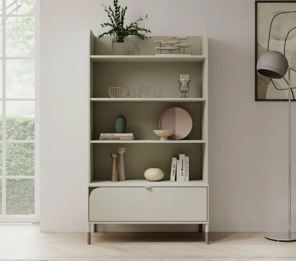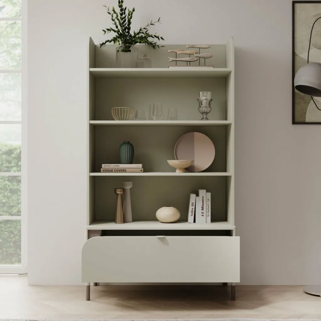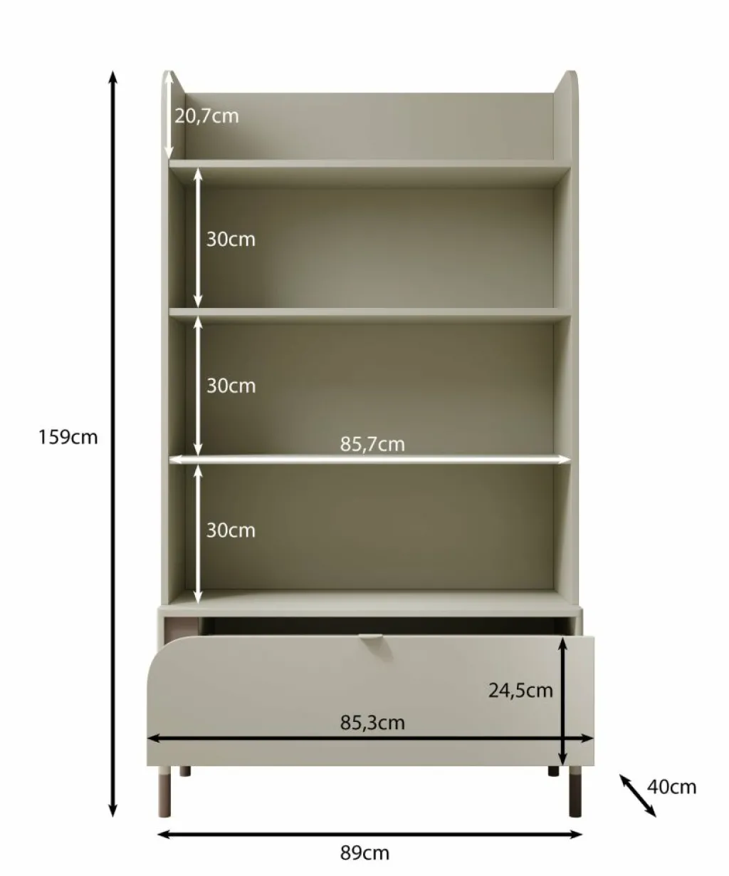 Kinderboekenkast Hill is een moderne kast uitgevoerd in de kleur beige. De boekenkast heeft voldoende opbergruimte. Het meubel bestaat uit 4 open vakken en een lade. Deze lade is te openen met een handgreep.