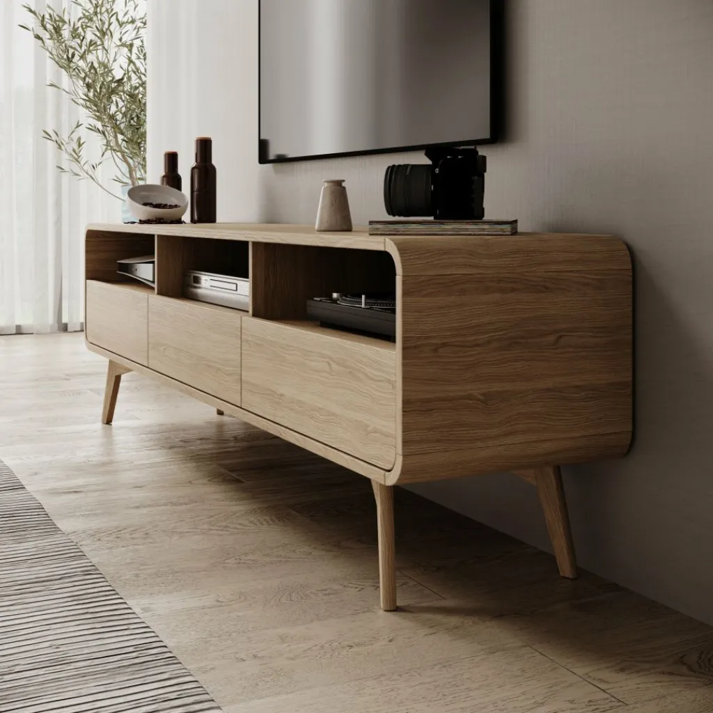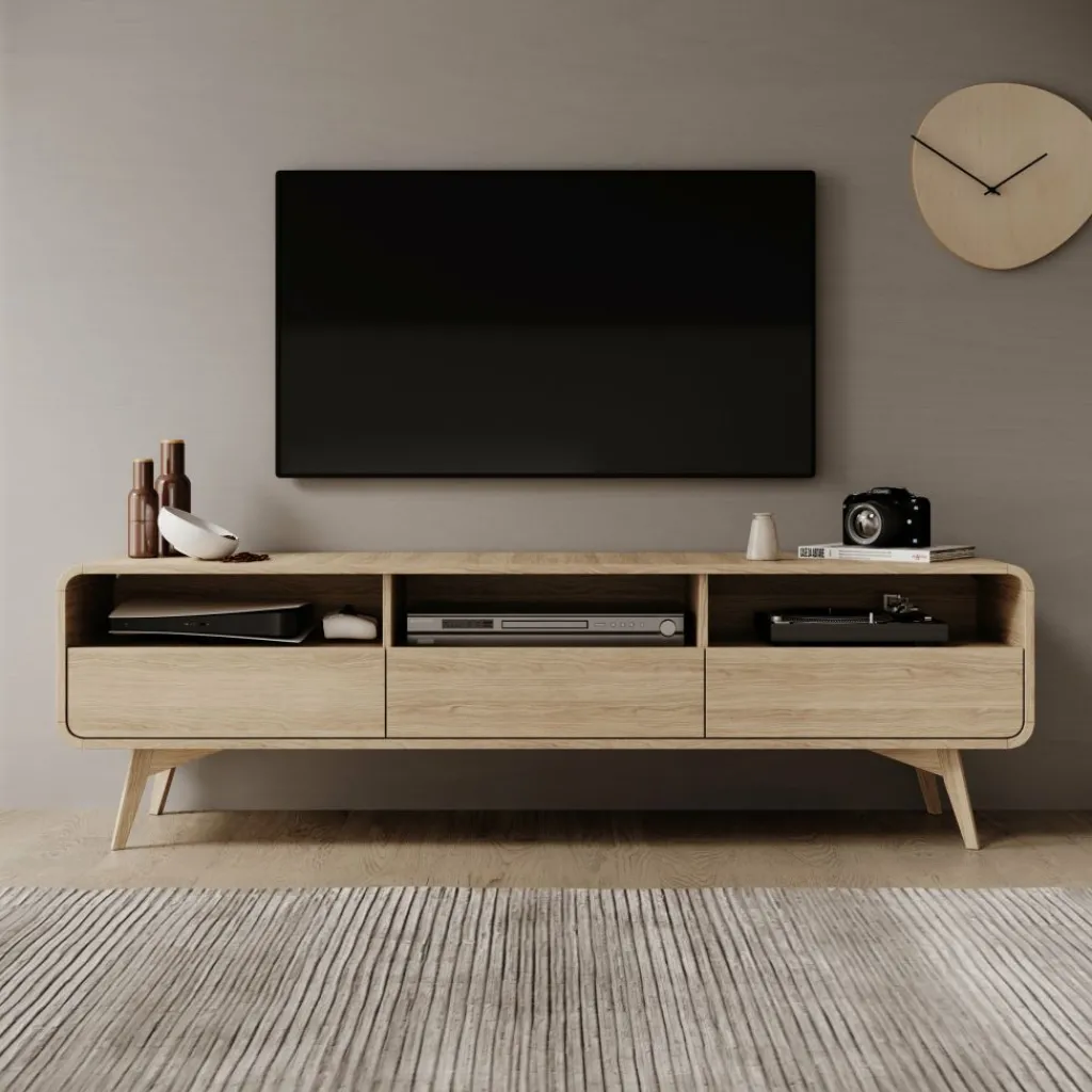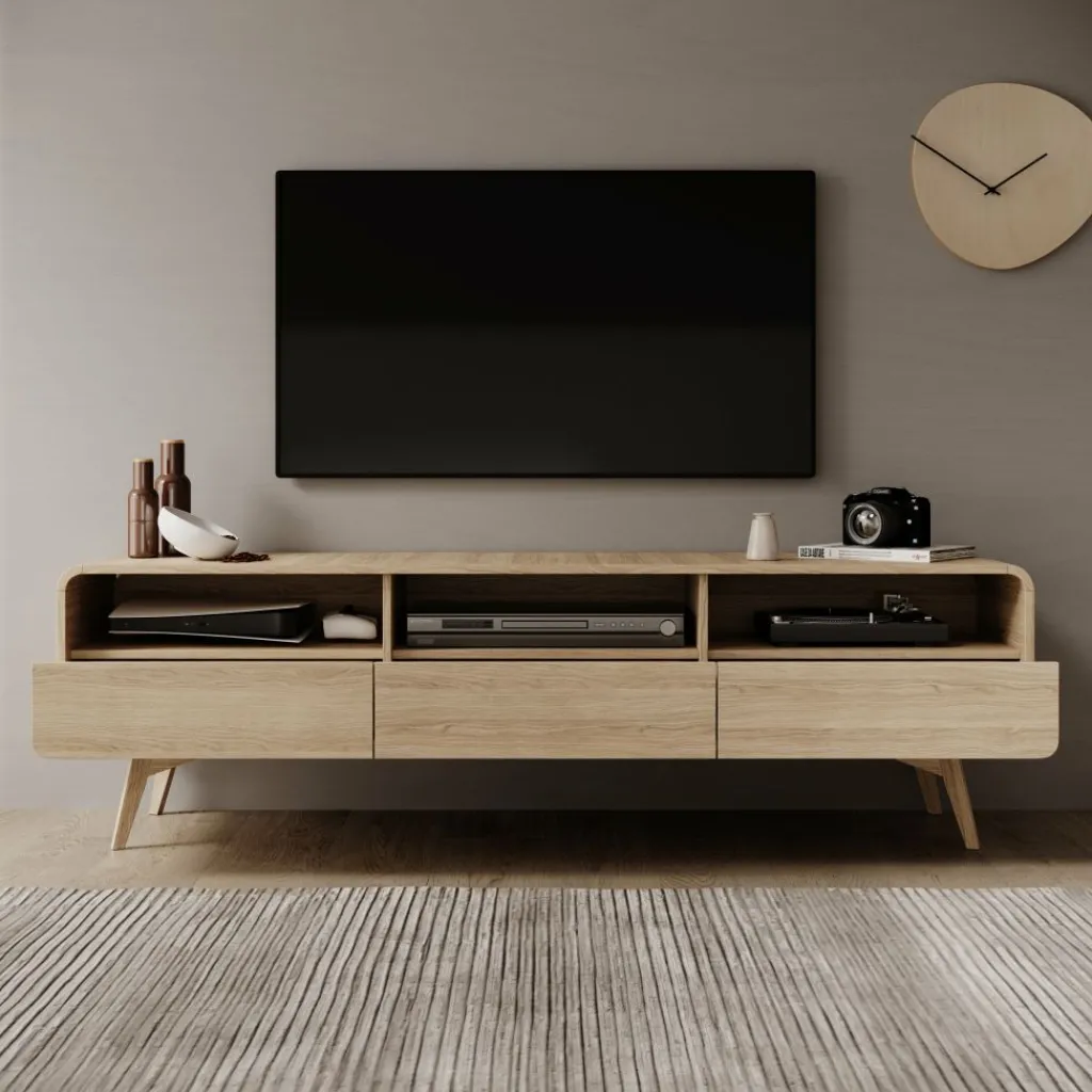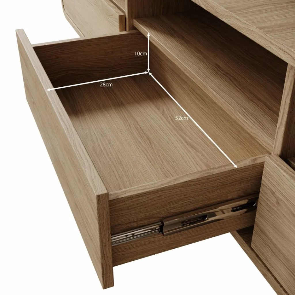 De open vakken zijn geschikt voor apparatuur zoals een decoder, spelcomputer of mediabox en beschikken over kabeldoorvoeren aan de achterzijde. In de lades berg je accessoires op zoals afstandsbedieningen, kabels of kleine elektronica zodat het blad overzichtelijk blijft. Het eikenpatroon toont een duidelijke houtstructuur en past goed bij lichte en natuurlijke woonkamers.