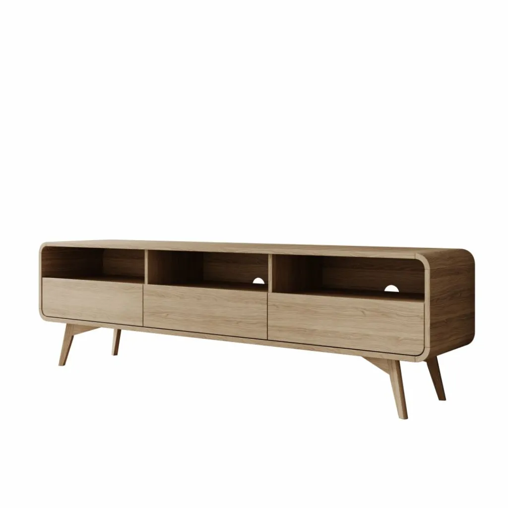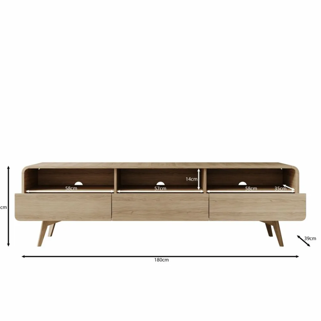Het Hoshii tv-meubel is een staand meubel met een breedte van 180 cm, een diepte van 39 cm en een hoogte van 53 cm. Het meubel staat op schuine poten en heeft afgeronde hoeken, met drie open vakken bovenin en drie lades onderin.