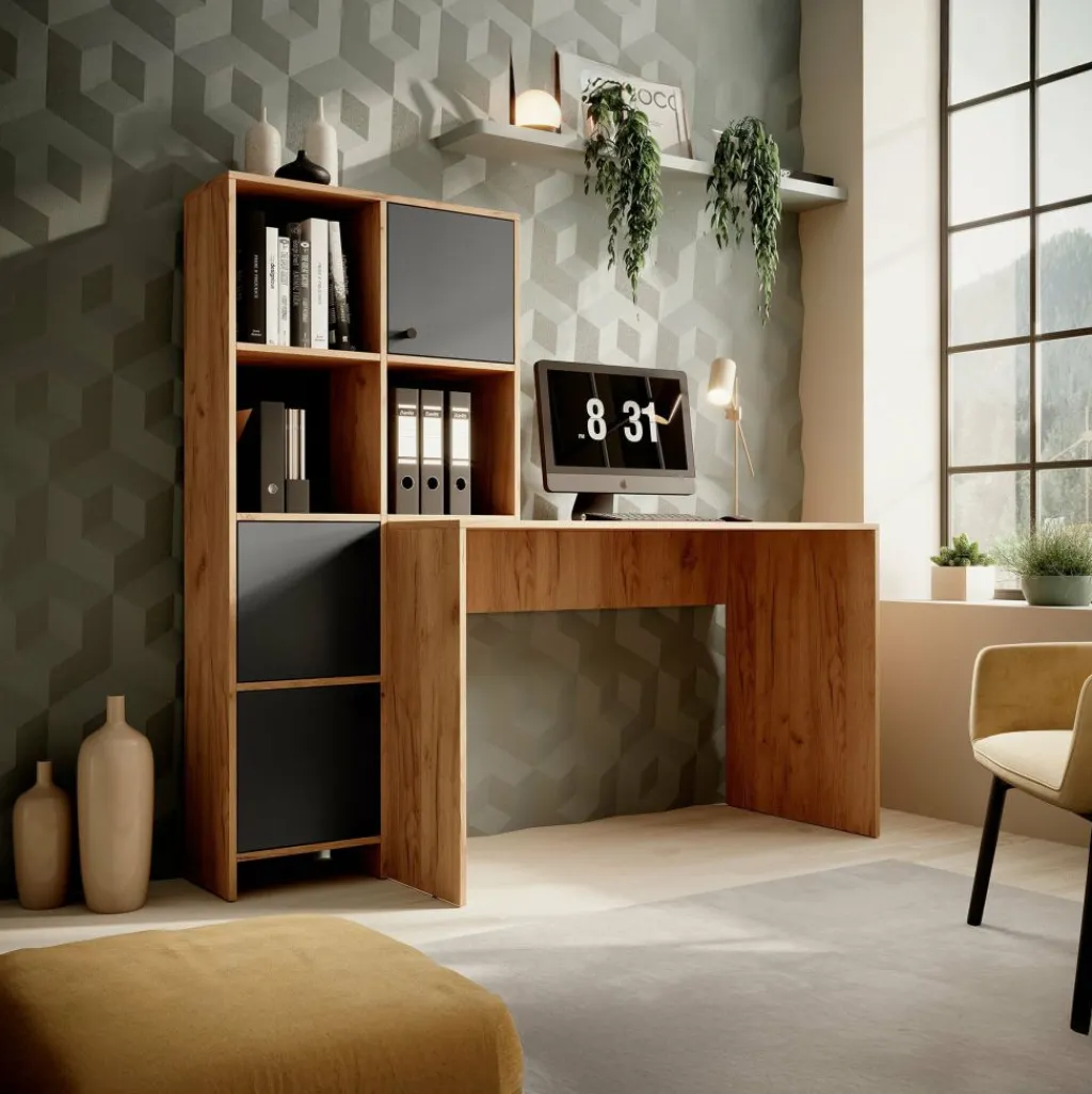 De Hyatt is een zeer multifunctioneel bureau. Het meubel bestaat namelijk uit een breed blad met aan de linkerkant 3 deurtjes en 3 open schappen. Het bureau is uitgevoerd in eiken met antraciet.