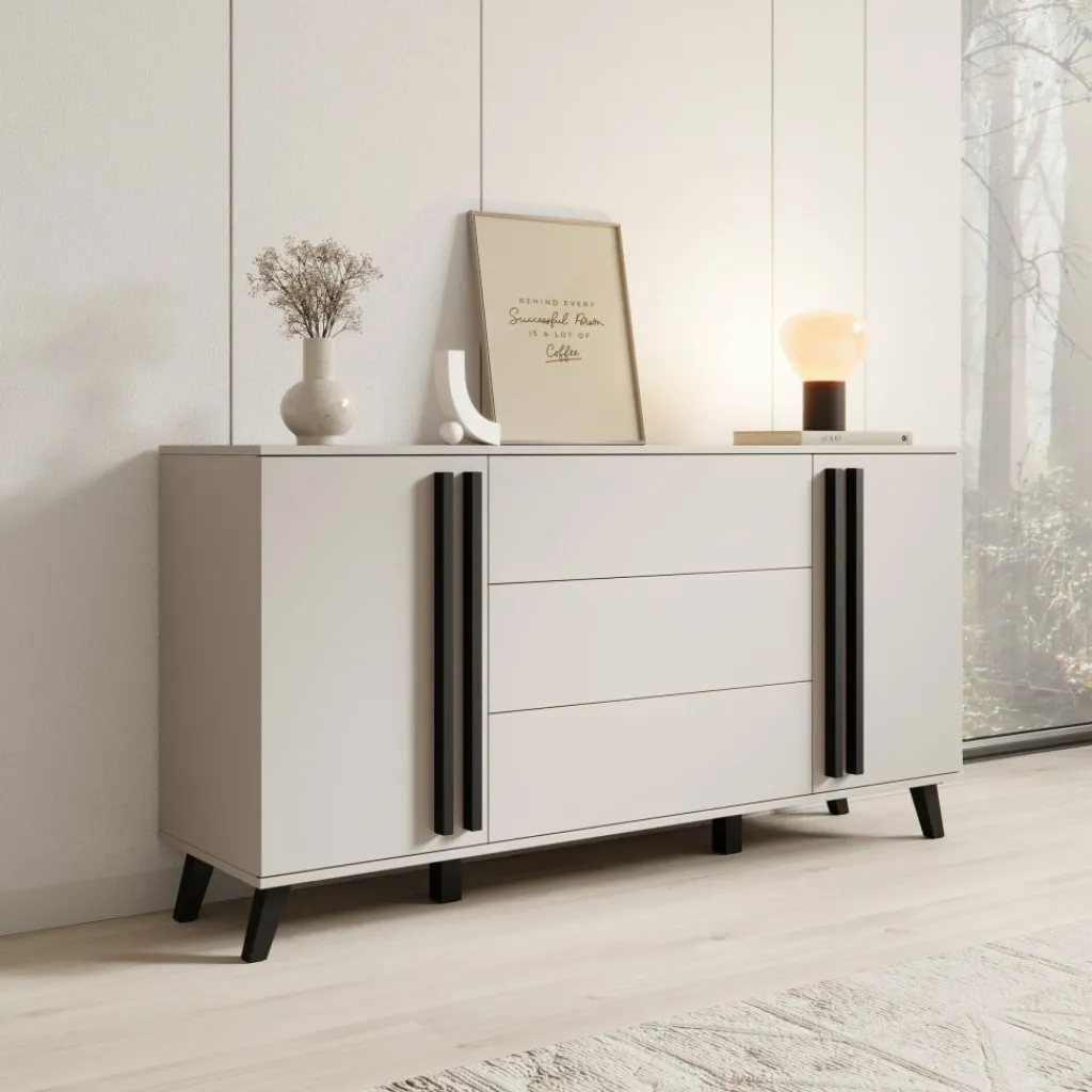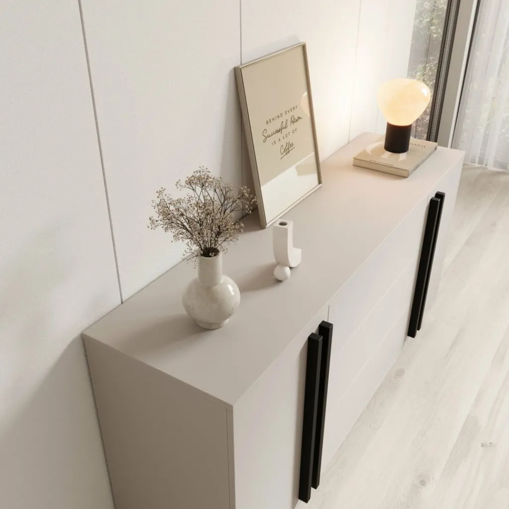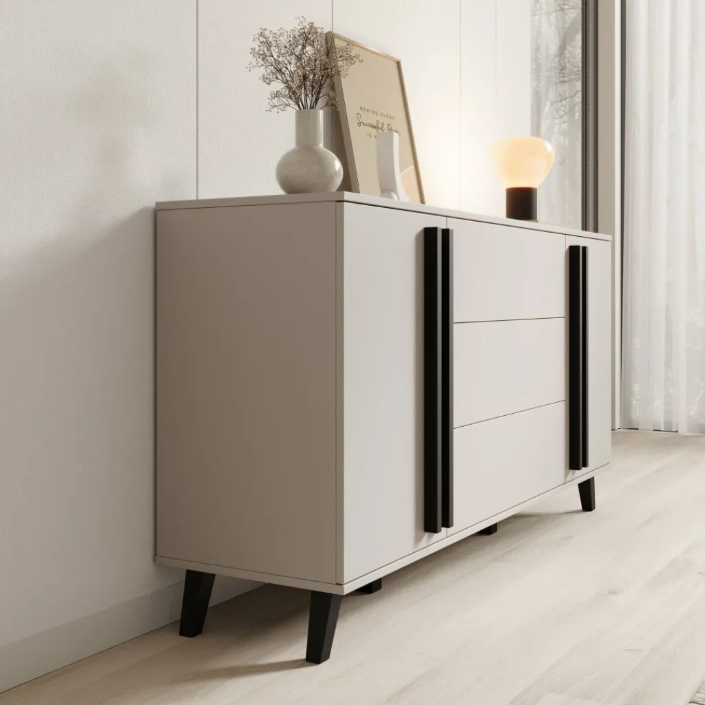 De Hydra dressoir in beige heeft een strak en modern ontwerp dat perfect past in een eigentijds interieur. De zachte beige kleur zorgt voor een rustige uitstraling, terwijl de zwarte accenten op de grepen en poten voor een stijlvol contrast zorgen.
