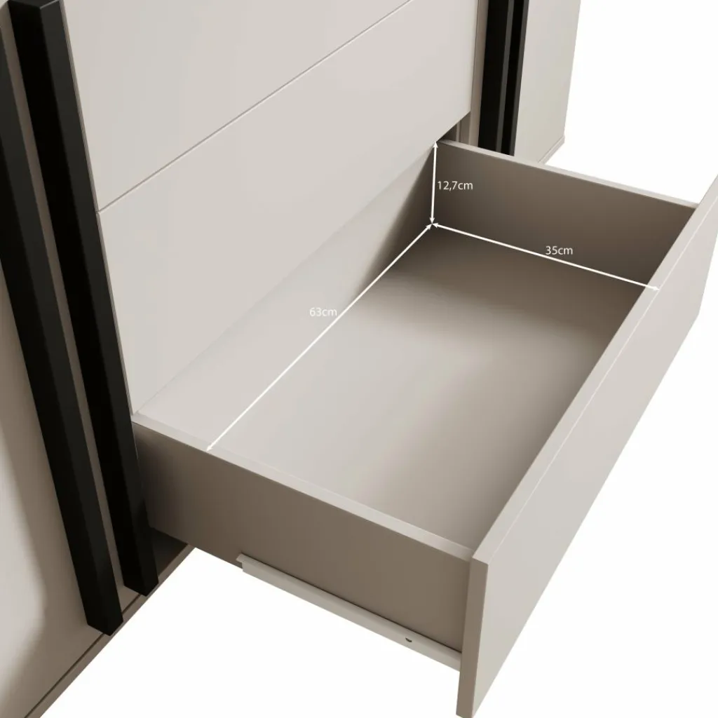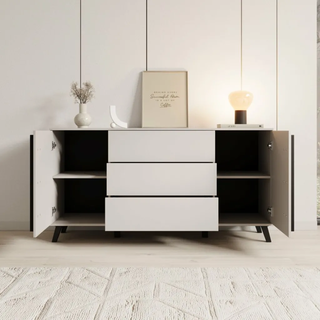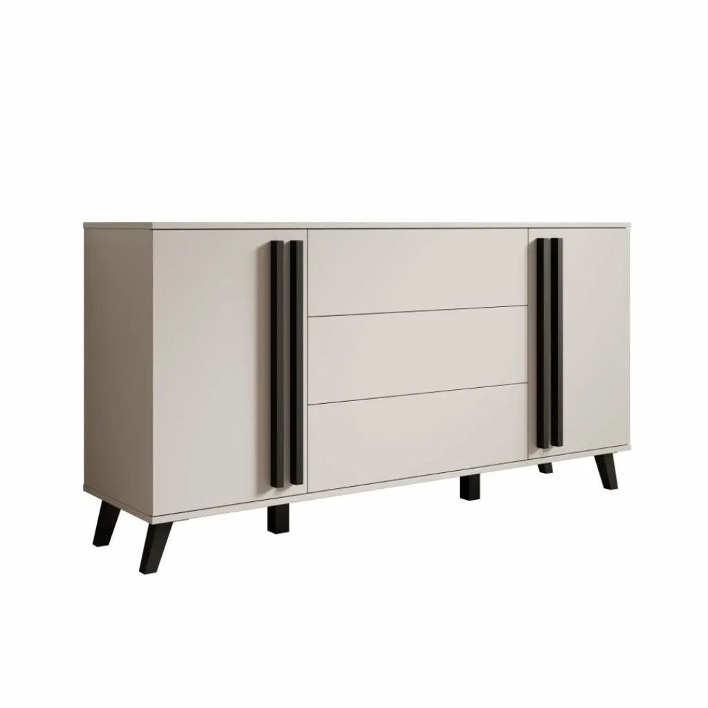 De Hydra dressoir in beige heeft een strak en modern ontwerp dat perfect past in een eigentijds interieur. De zachte beige kleur zorgt voor een rustige uitstraling, terwijl de zwarte accenten op de grepen en poten voor een stijlvol contrast zorgen.