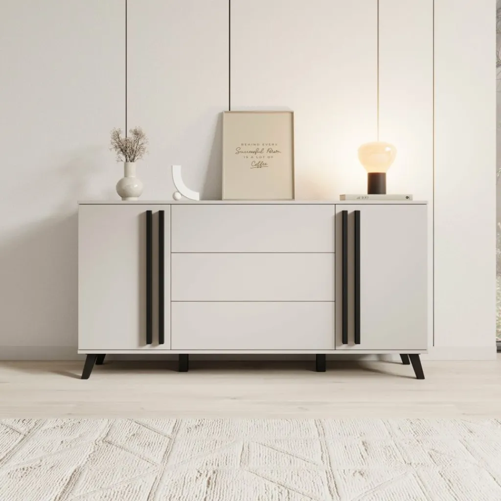 Met een breedte van 150 cm biedt dit dressoir ruime opbergmogelijkheden dankzij de combinatie van drie lades in het midden en twee deuren aan de zijkanten. Ideaal voor het netjes opbergen van servies, tafellinnen of andere woonaccessoires.
