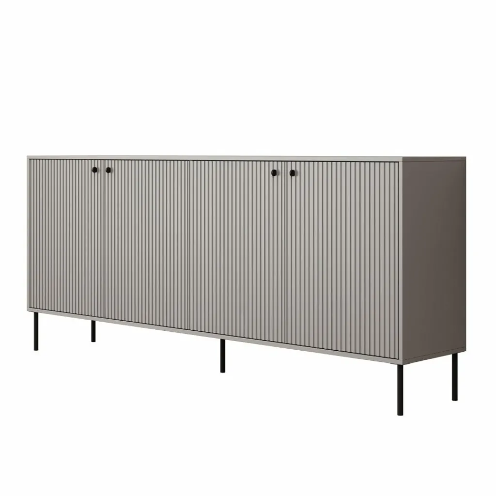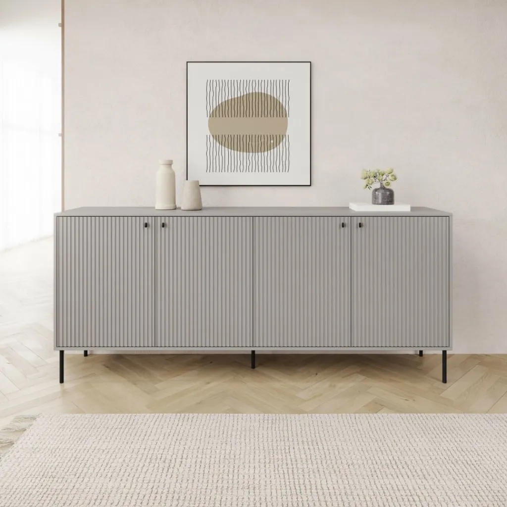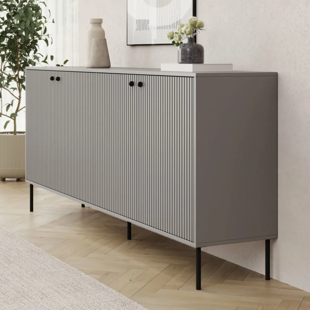 Dressoir Ilux is uitgevoerd in matgrijs en voorzien van geribbelde fronten. Het meubel van 206 cm breed biedt opbergruimte achter vier deuren.